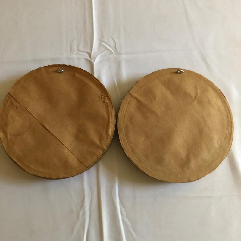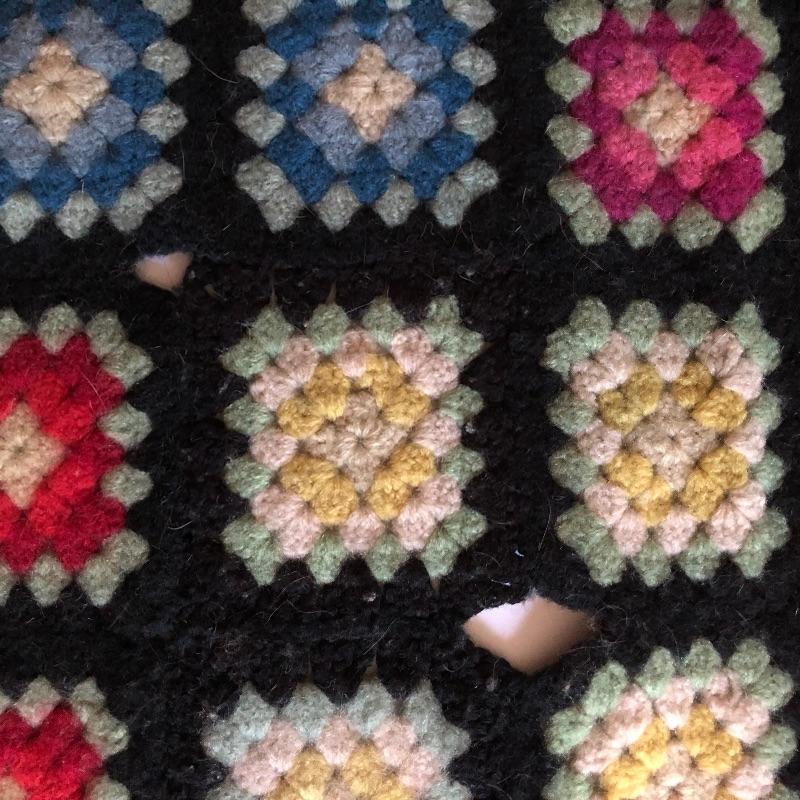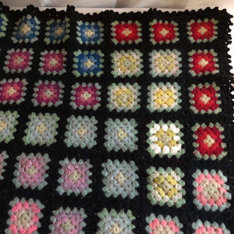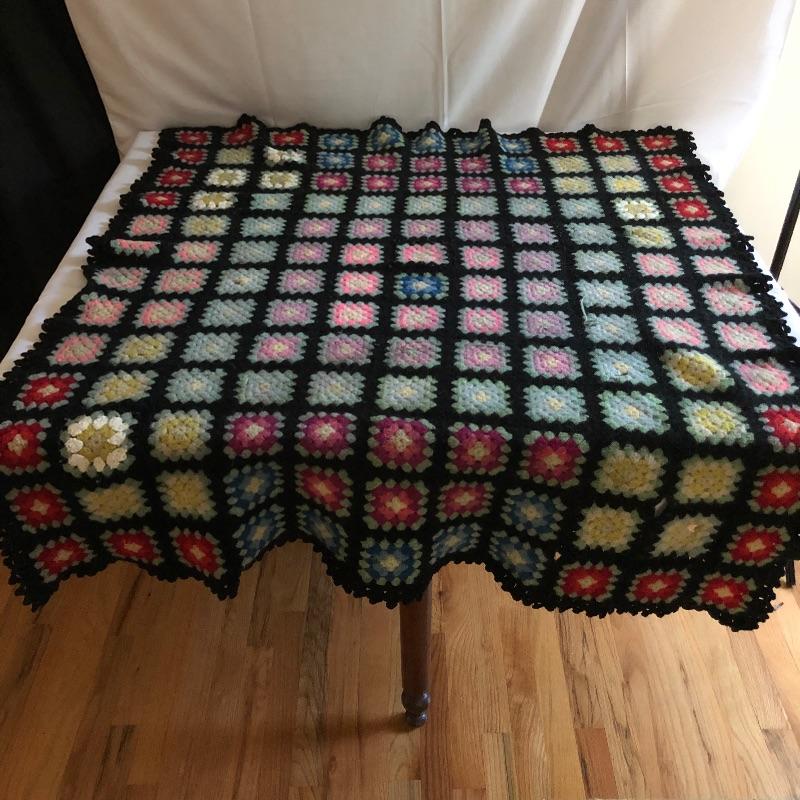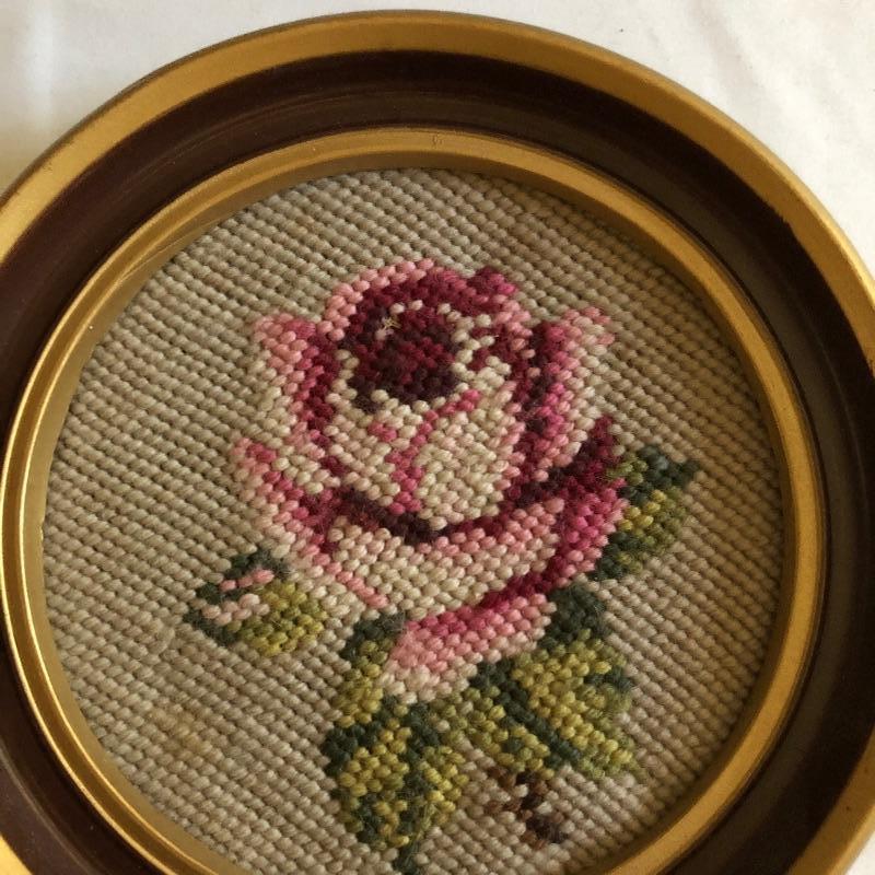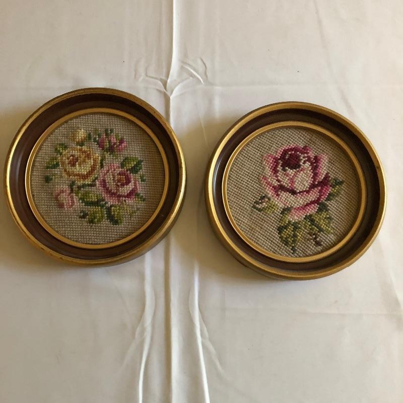 Not one, but two vintage and colorful Afghan throws. There is a good reason why these “˜granny squares’ blankets became trendy again, and these two make no exception! They both have a few minor holes; more so in the smaller blanket pictured laying on the table in the cover image; we counted 3 holes in that one and just one hole in the larger blanket shown hanging. This larger, brightly colored blanket measures 50” x 78”. Also included are a pair of rose flower tapestries that are in matching gold colored frames that each measure 7” diameter.