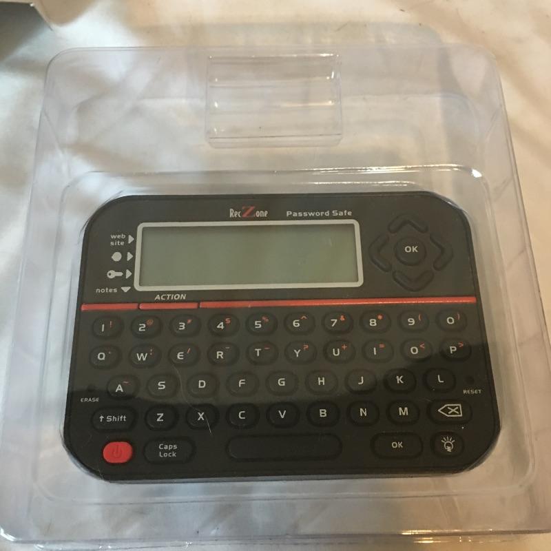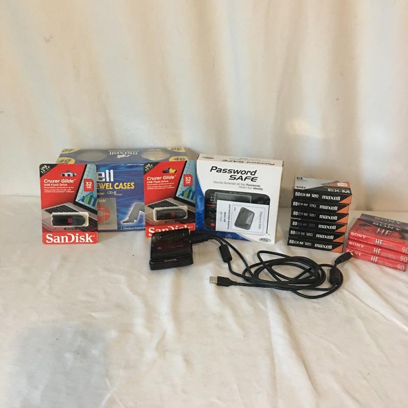 Password safe and more. Lot includes password safe, two 32GB flash drives, six Maxell video cassettes, five Sony tapes, jewel cases and a seven hub USB port. Keep all your passwords in one place with this practical tool. Password safe powered on when tested but says it needs batteries.