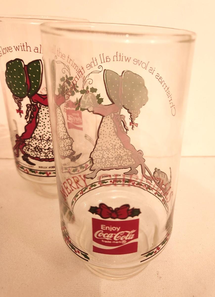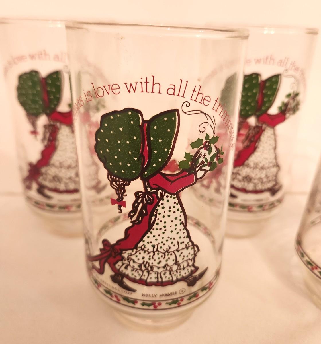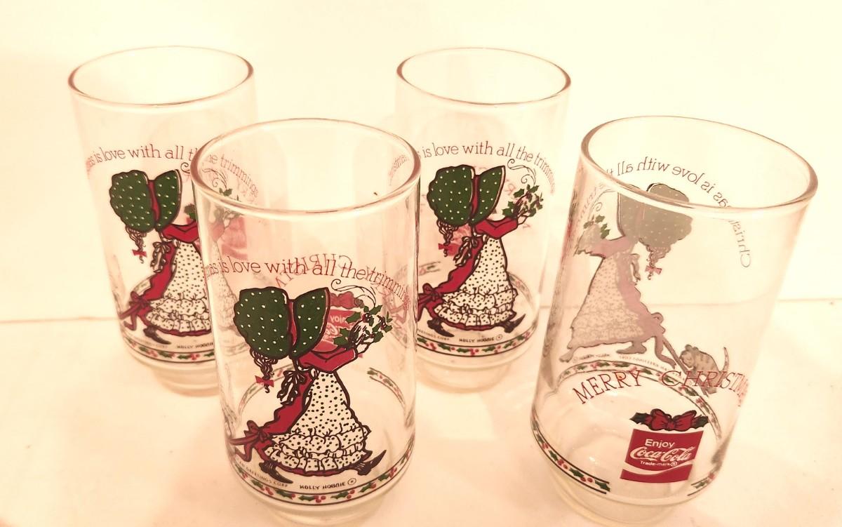 Lot of 4 Limited edition promotional Hollie Hobbie drinking glasses, 6" tall. All in good condition. Promotional tie-in with Coca-Cola. Undated.