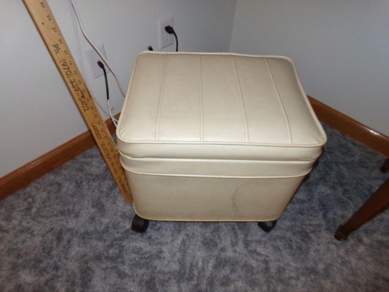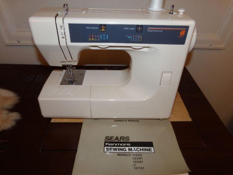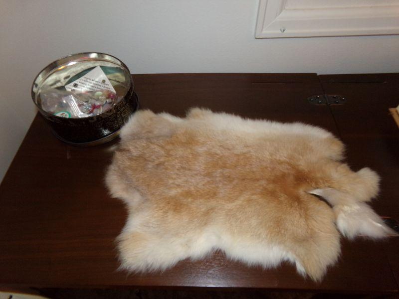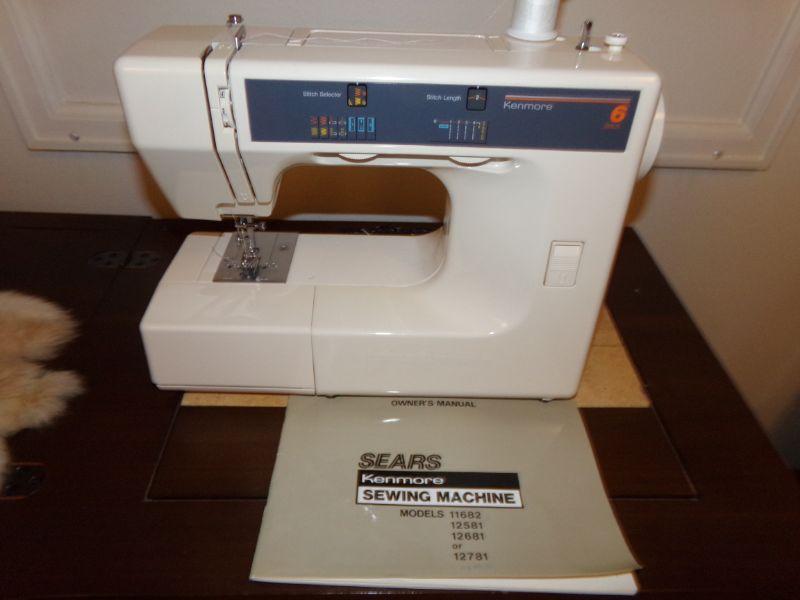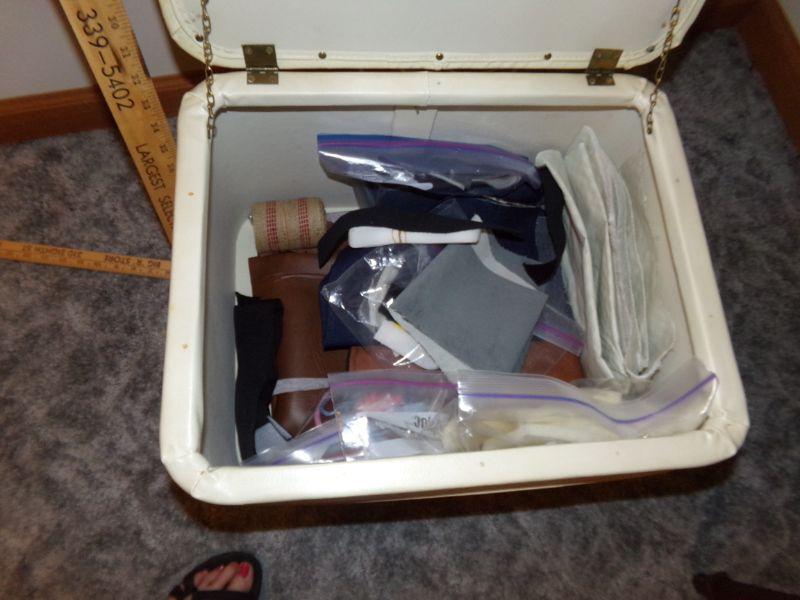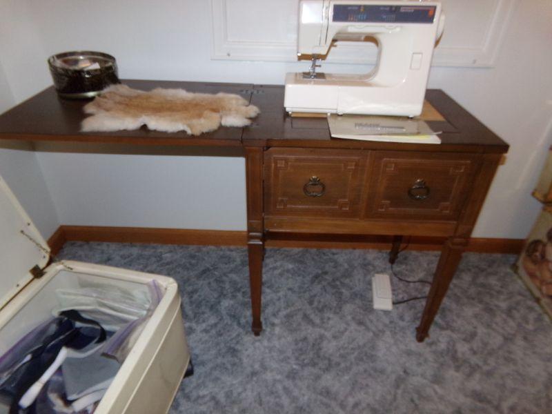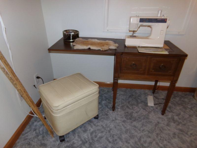 KENMORE SEWING MACHINE IN CABINET, STORAGE OTTOMAN W/SOME MATERIAL, FEW NOTIONS AND A RABBIT FUR