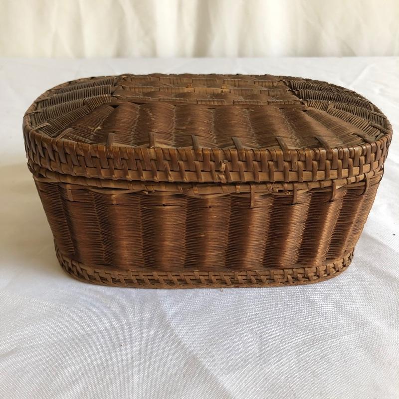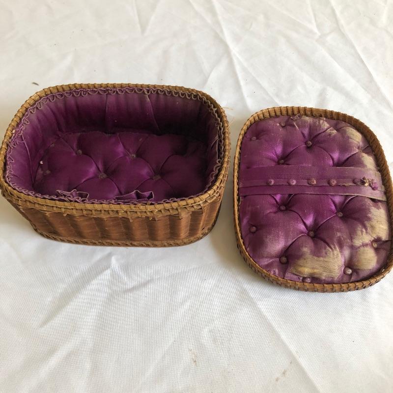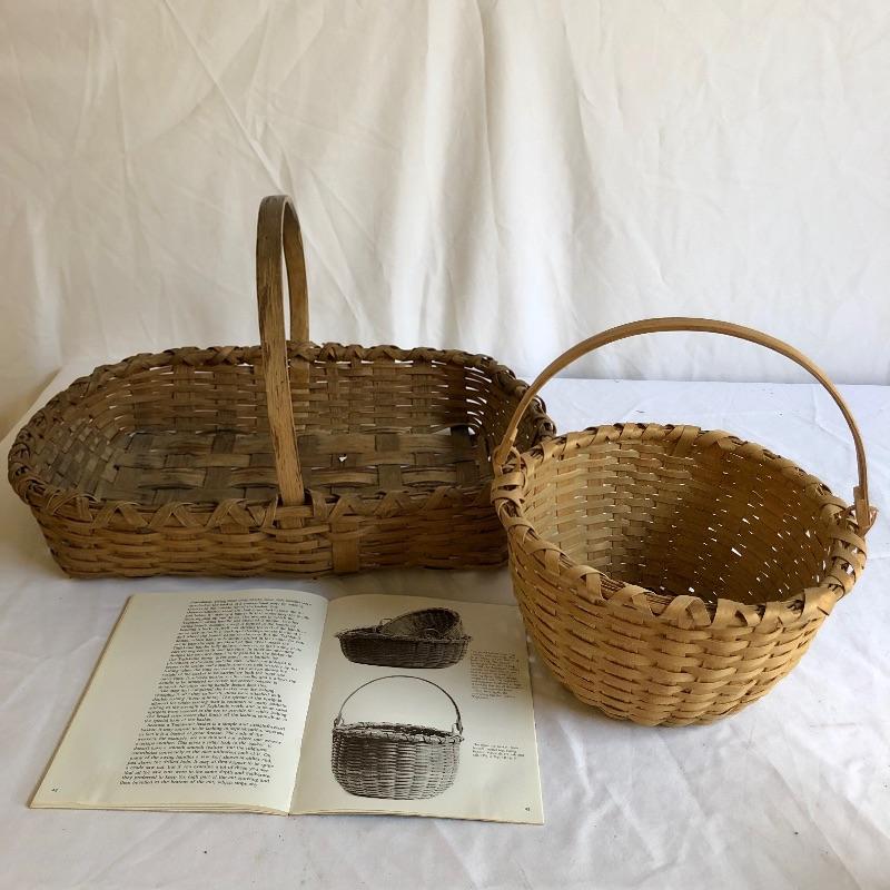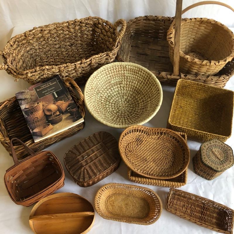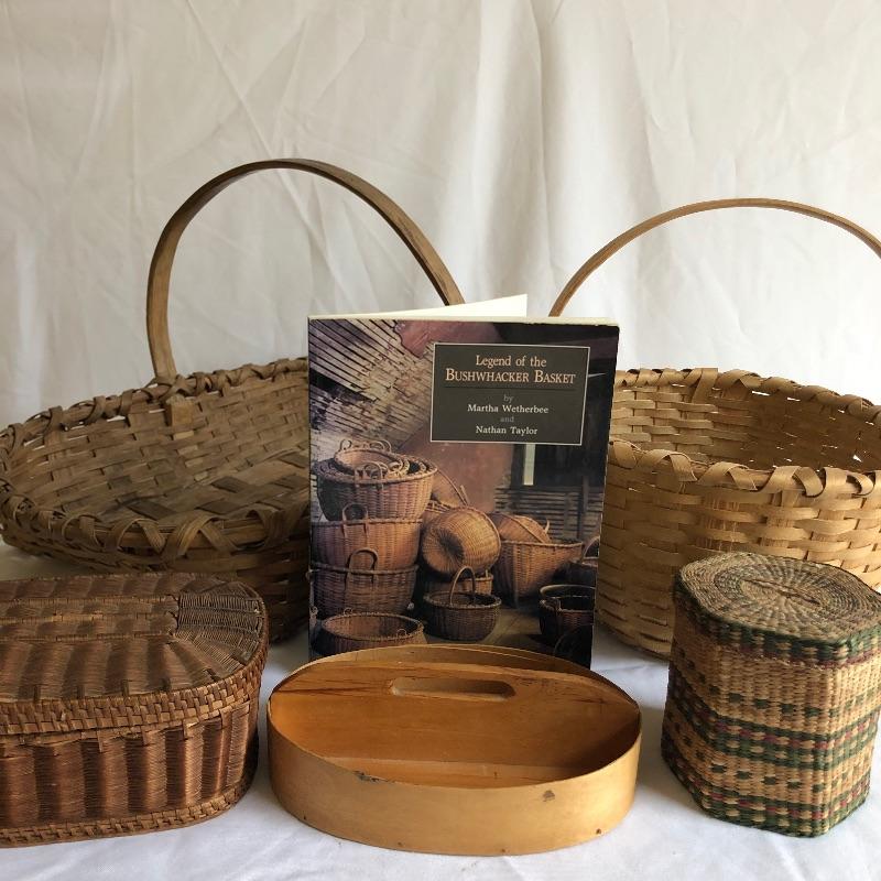 Over 10 baskets in this lot that include a couple of shaker ones. Two of the larger baskets shown in our main photo appear to be Shaker baskets and our beautifully crafted. Also included is a very interesting book on the history behind the Bushwackers. Lots more noteworthy baskets as well though that includes a purple silk-lined lidded one and many more, see images.