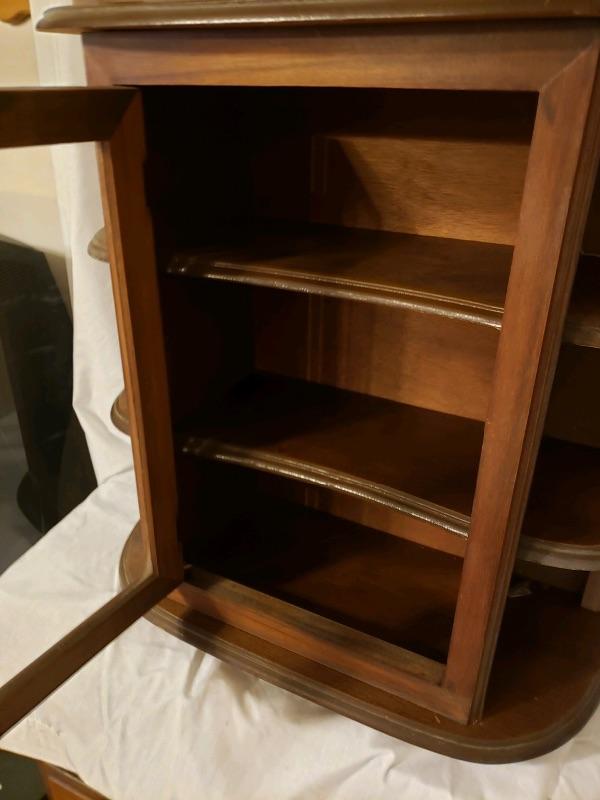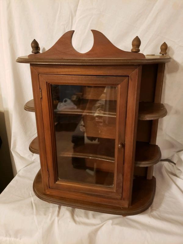 LOT #57. Small wooden curio cabinet with glass door. Can hang on wall. 18-3/4”W x 20”H