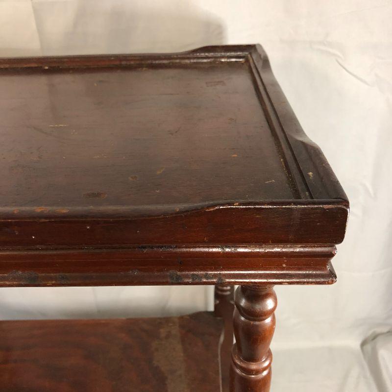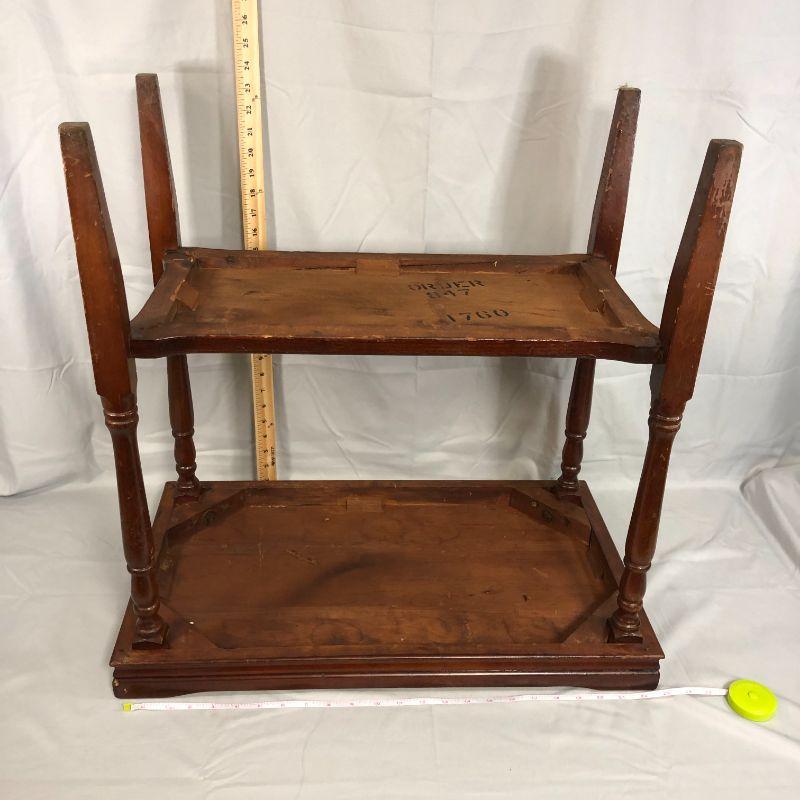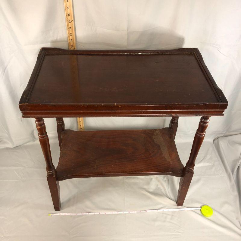 This piece is in great condition except for the finish, but some good wood oil would probably cover a lot of the finish wear. It stands about 24" tall, 24" wide, and 14" deep. I believe that it is mahagony.