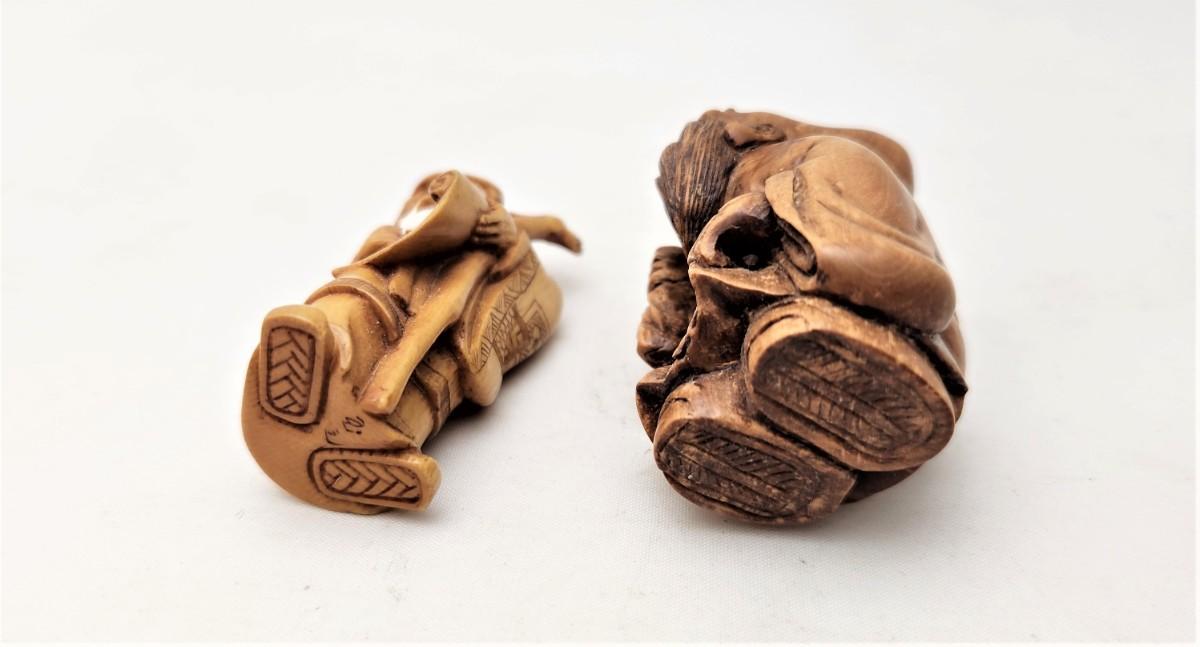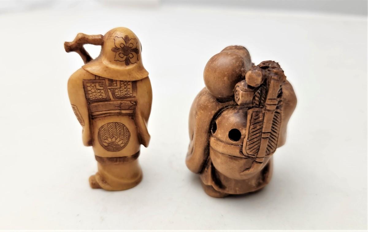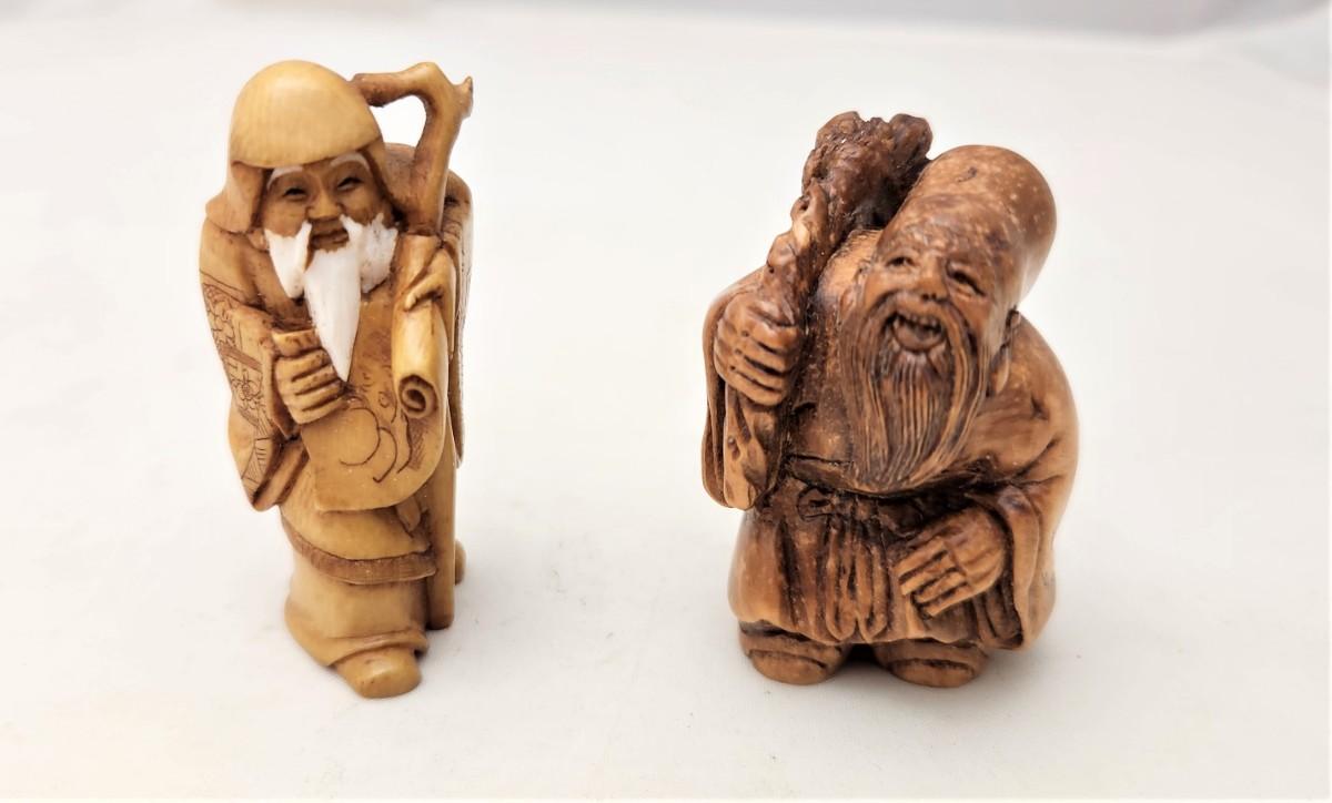 Lot of 2 very sweet Chinese/Asian figures - highly detailed - one a NETSUKE (note the toggle holes on back), the other is a scholar. Even the bottoms of their shoes are detailed. Each stands about 2" tall - both in good condition.