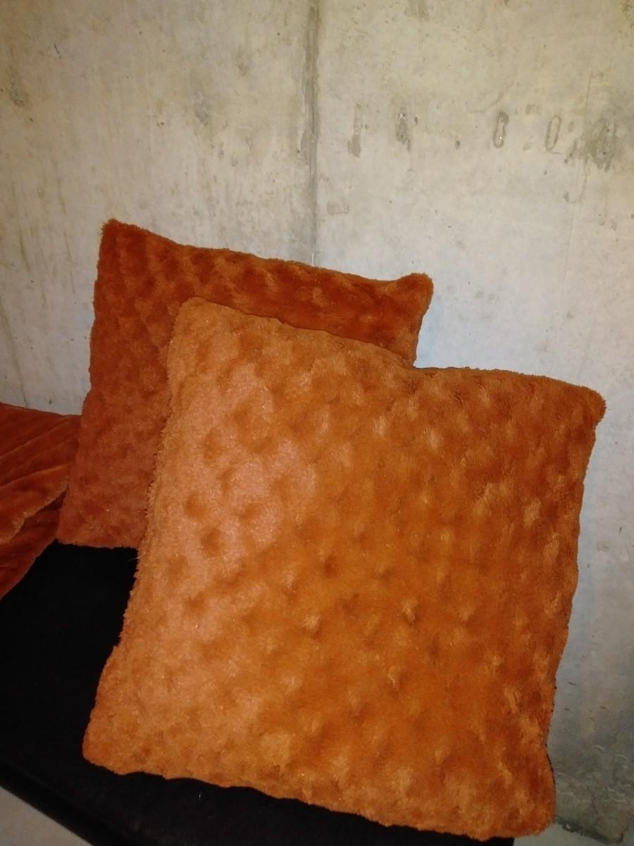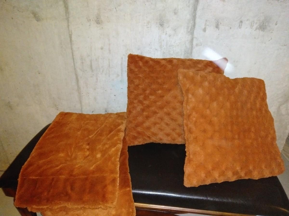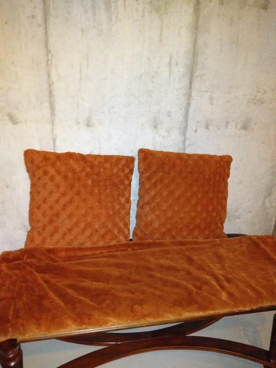 TWO ORANGE / RUST COLORED THROW PILLOWS WITH MATCHING LAP BLANKET.