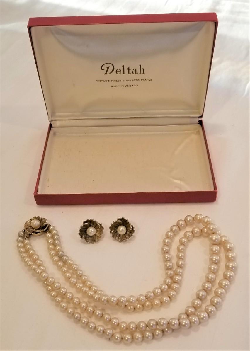 Lot #57  Vintage DELTAH Costume Pearl set - necklace/earrings - original box