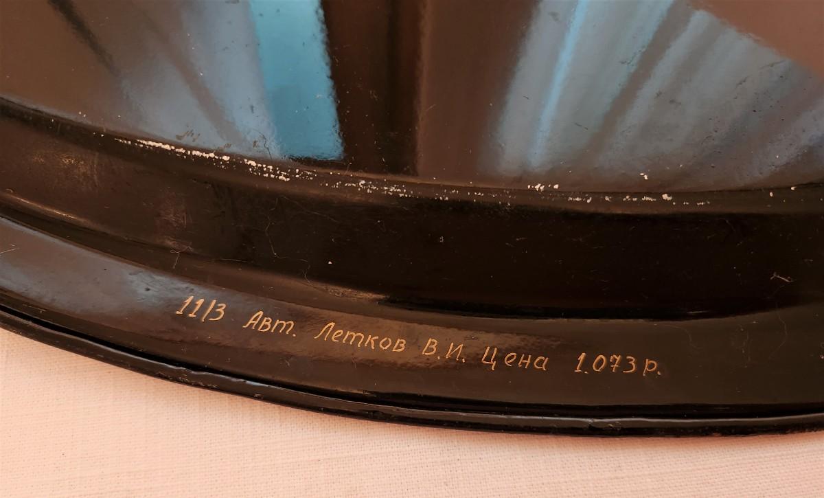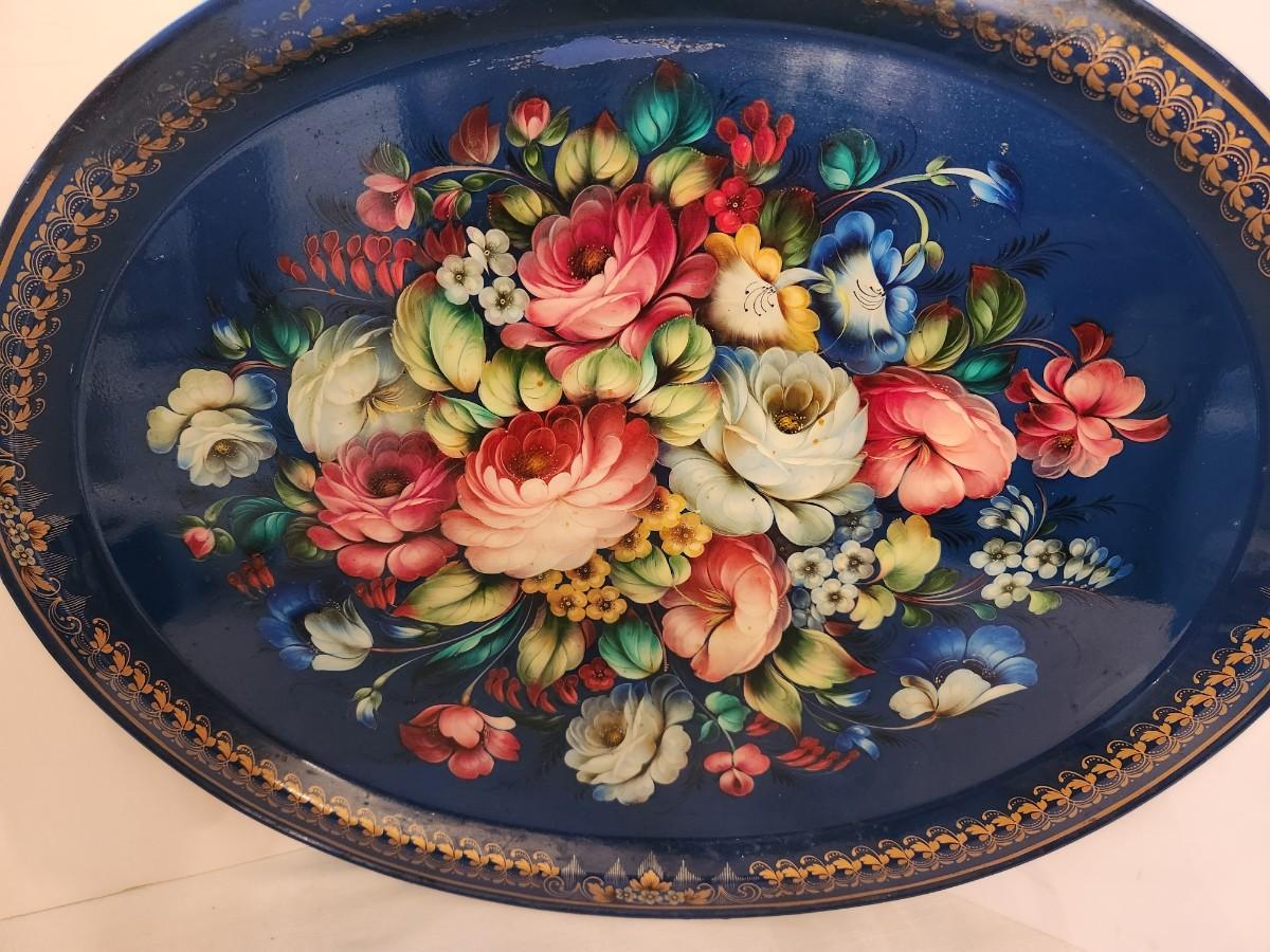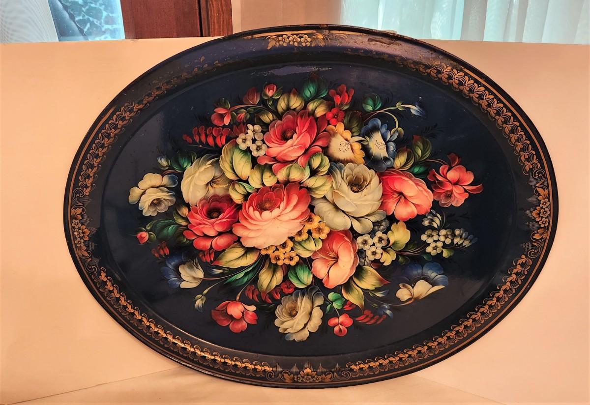 Large handpainted Tole-style metal tray - a real beauty - vivid colors. Has a small hole in one end for hanging on the wall. A few minor losses. Russian markings. 21" tall, 26.75" across. One of the nicest we've had.