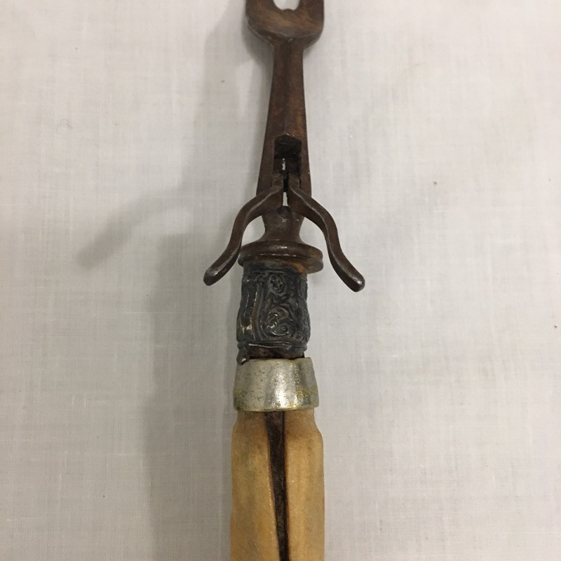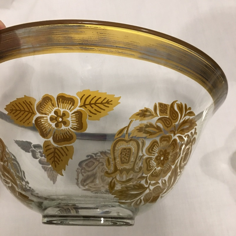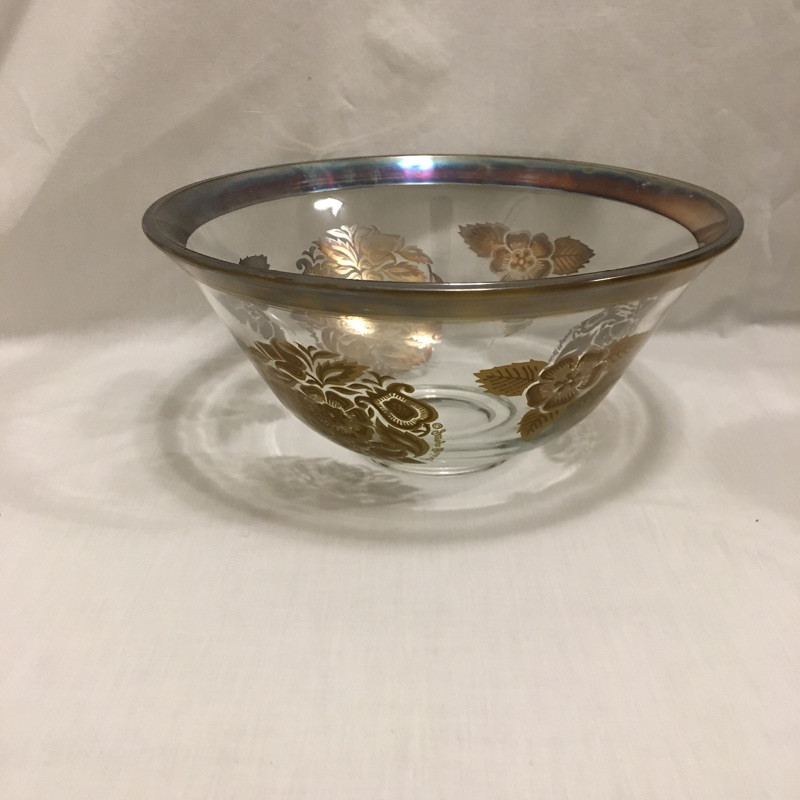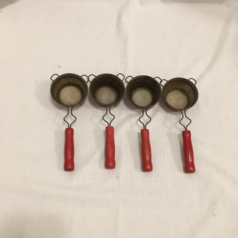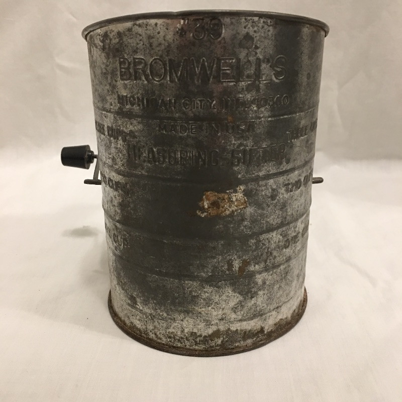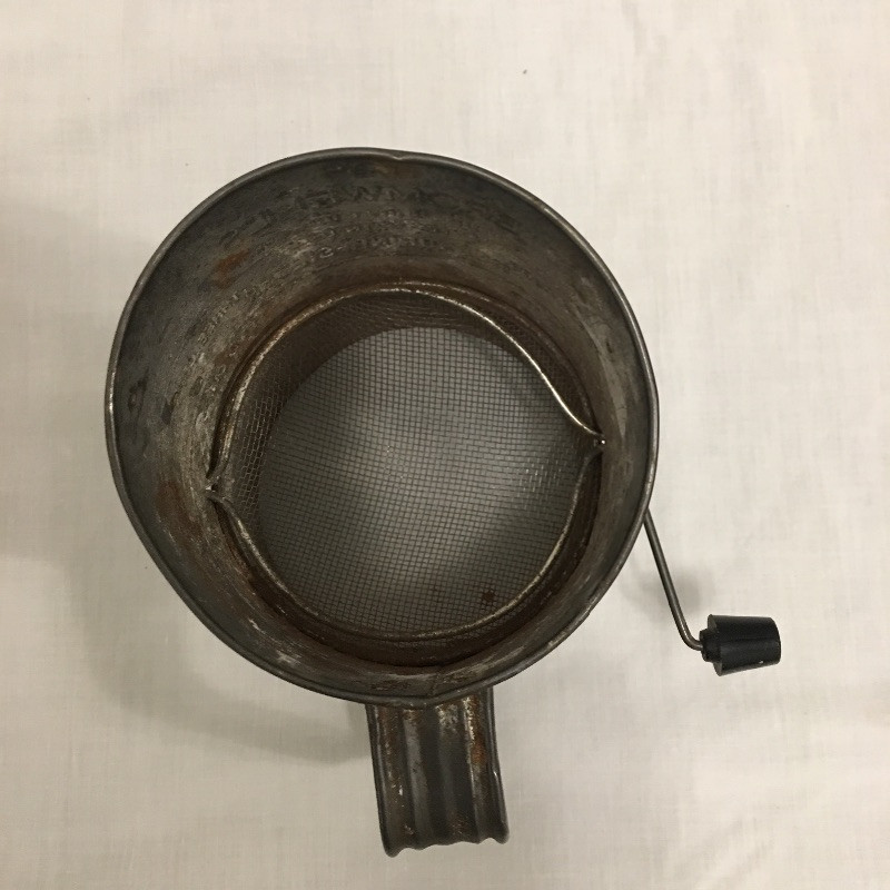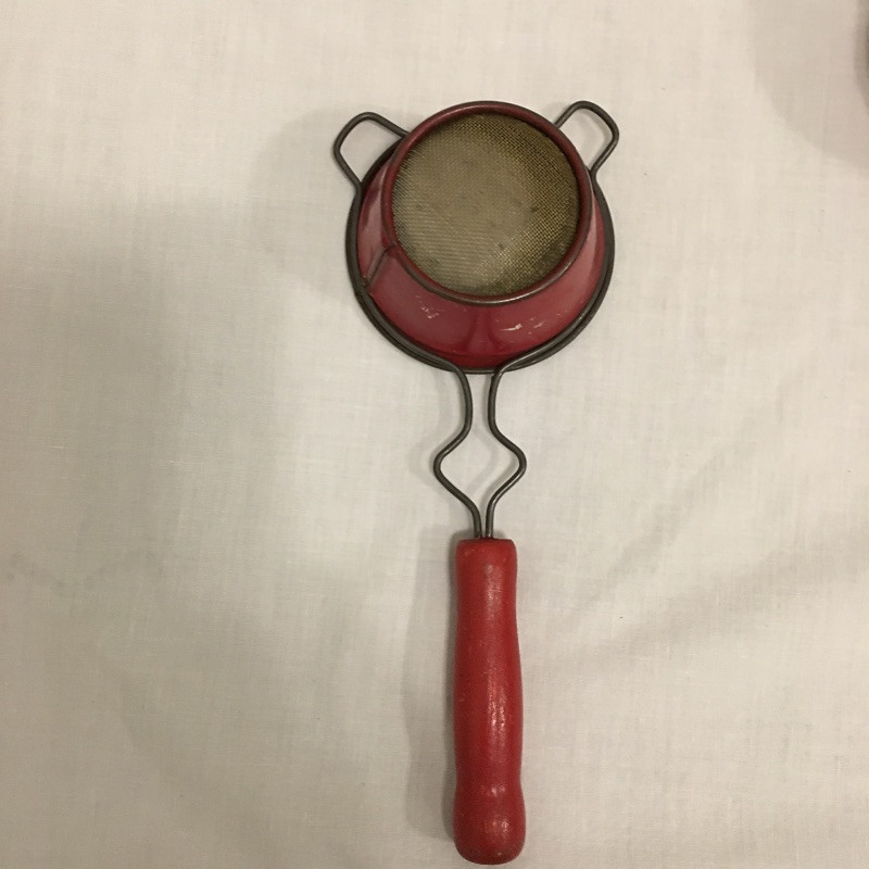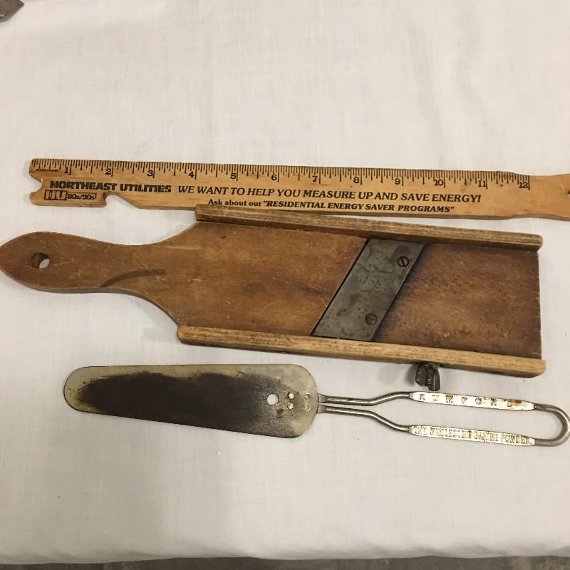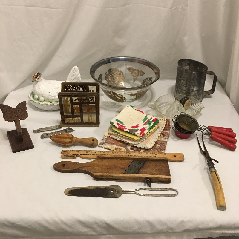 There is a great mix of items in this eclectic mix of vintage kitchen ware that includes fa lour sifter, juicer, four strainers, ruler, glass bowl, serving fork, napkin holder, mandolin and more. Bowl measures 10”D x 4.75” tall.