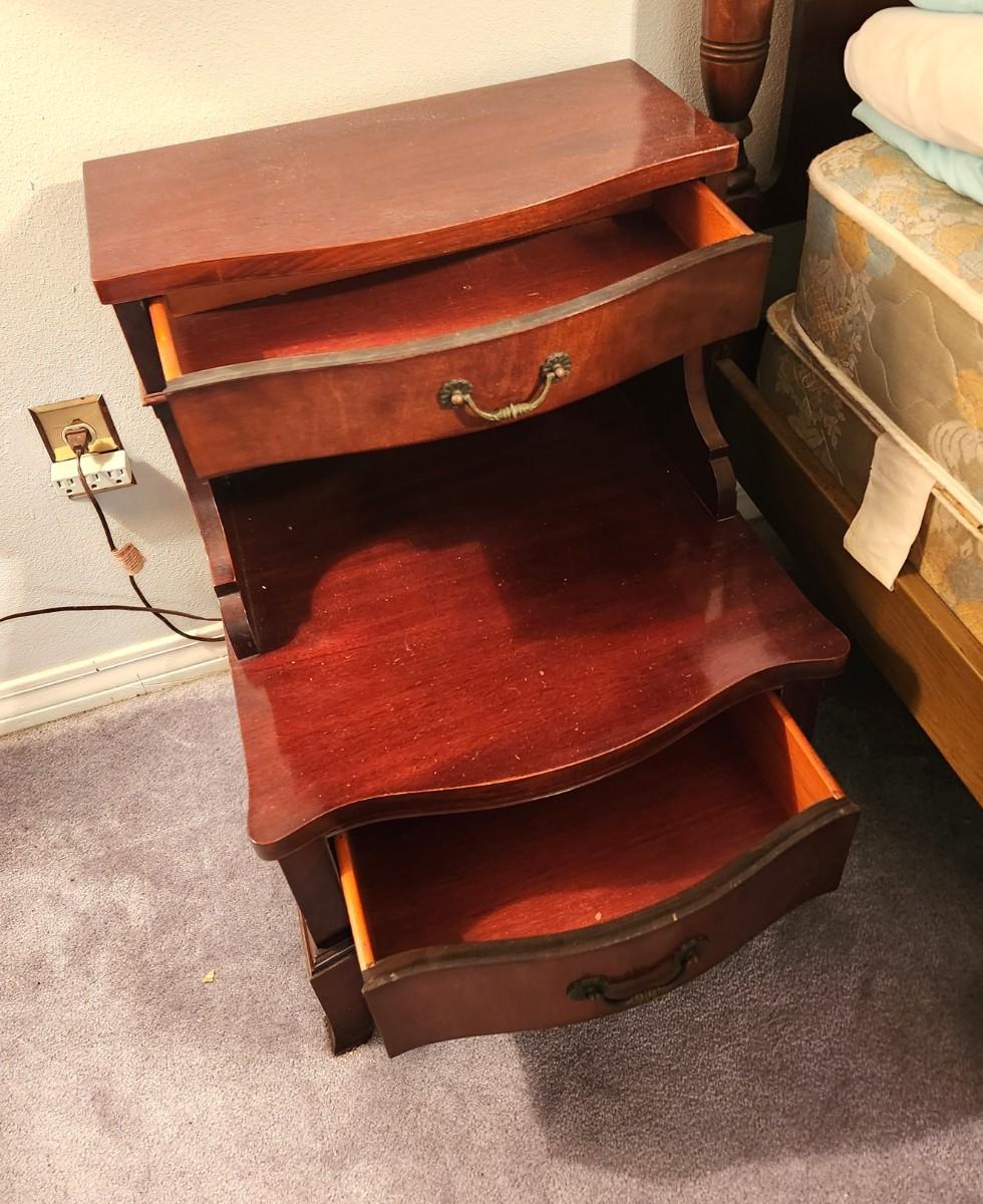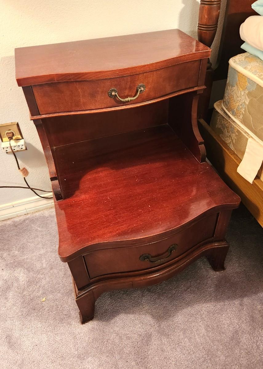 Vintage Nightstand - 2 drawers - 1940's era Mahogany finish. 28" tall, 19" deep, 20" across. Good vintage condition.