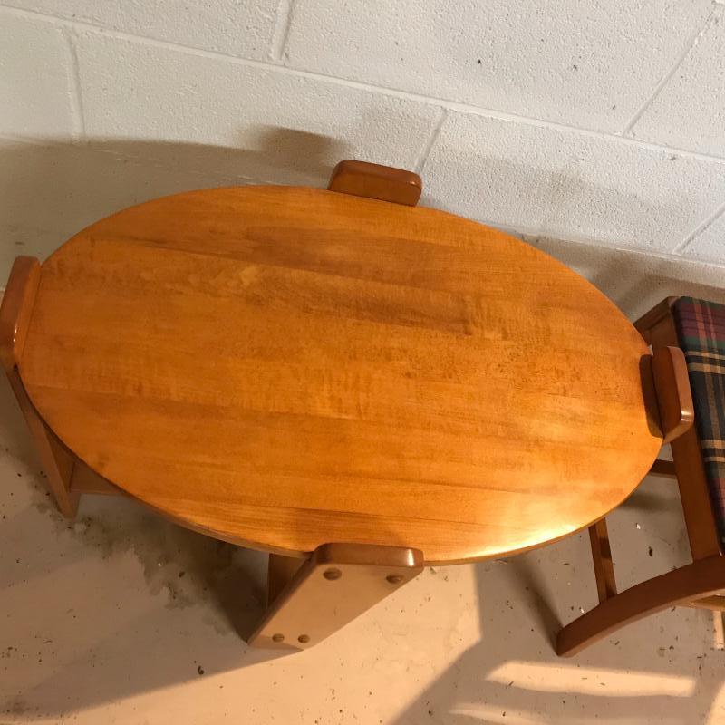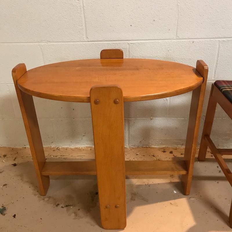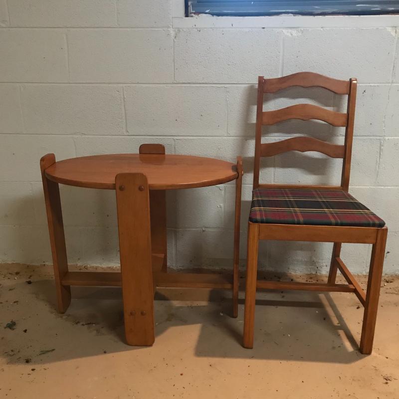 Cute table and chair in very nice condition. Both pieces are smaller, clean and sturdy. Chair measures approximately 16” x 14.5” x 33.5” and the table is 26” x 16.5” x 23.5”. No shipping.