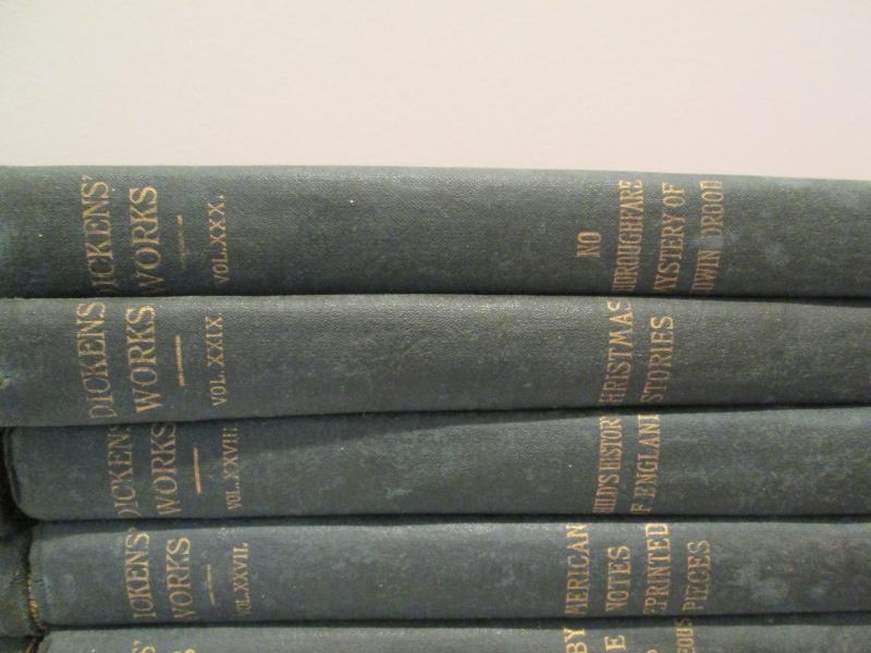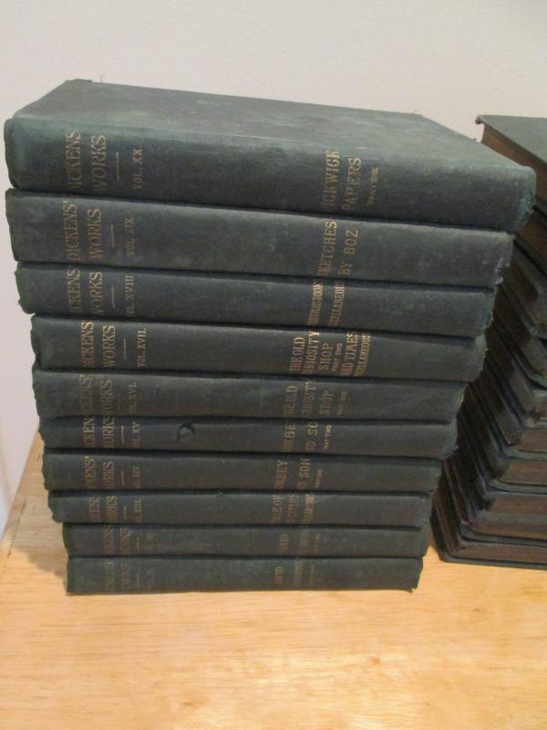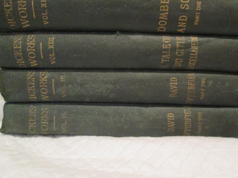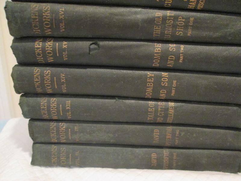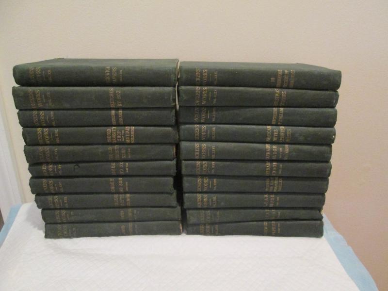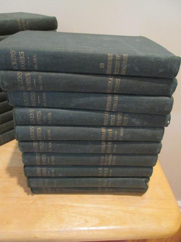 2 - David Copperfield Part One, 3 - David Copperfield Part Two 13 - A Tale of Two Cities, Miscellaneous, 14 - Dombey and Son Part One, 15 - Dombey and Son Part Two. 16 - The Old Curiosity Shop Part One. 17 - The Old Curiosity Shop Part Two, Hard Times, Miscellaneous. 18 - Christmas Books, Miscellaneous. 19 - Sketches by Boz. 20 - Pickwick Papers Part One. 21 - Pickwick Papers Part Two. 22 ““ Bleak House Part one. 23- Bleak House Part Two. 24 - Pictures From Italy, Uncommercial Traveller. 25 - Barnaby Rudge Part One. 26 - Barnaby Rudge Part Two, Miscellaneous. 27 - American Notes, Reprinted Pieces, 28 - Child's History of England, 29 - Christmas Stories, 30 - No Thoroughfare, The Mystery of Edwin Drood