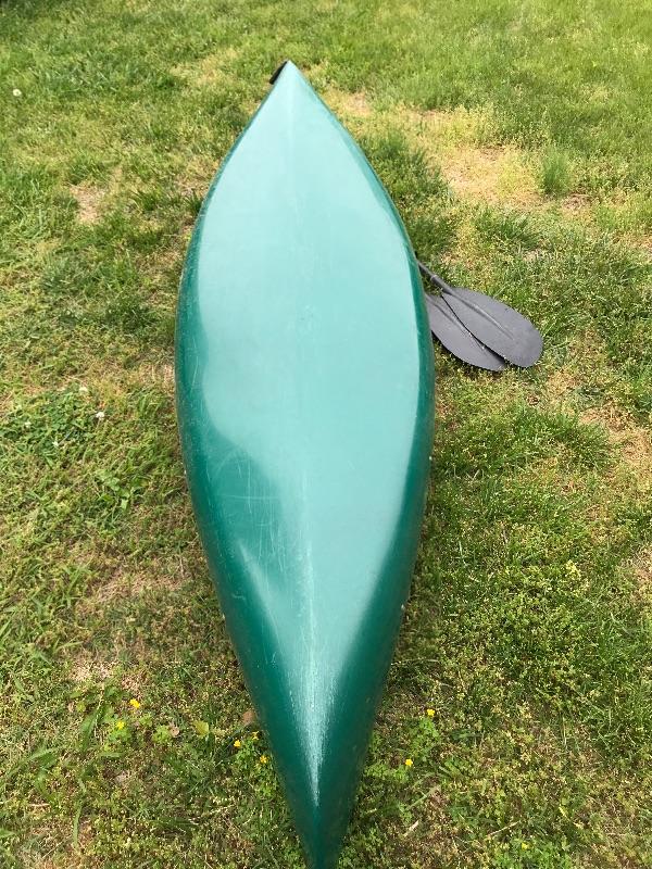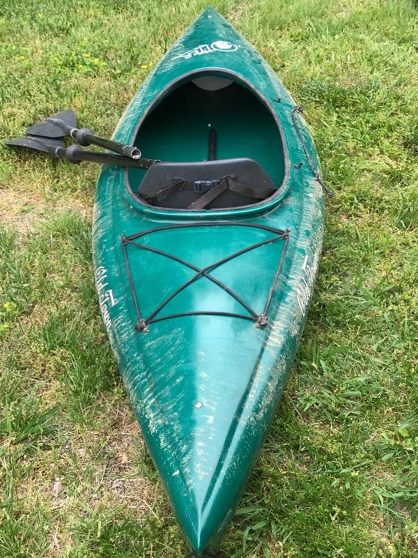 Old Town Otter Single Person Kayak, fiberglass, 2 oars, Specs.- 9’6” long, 28-1/2” wide, 12” deep and weighs 39 lbs.