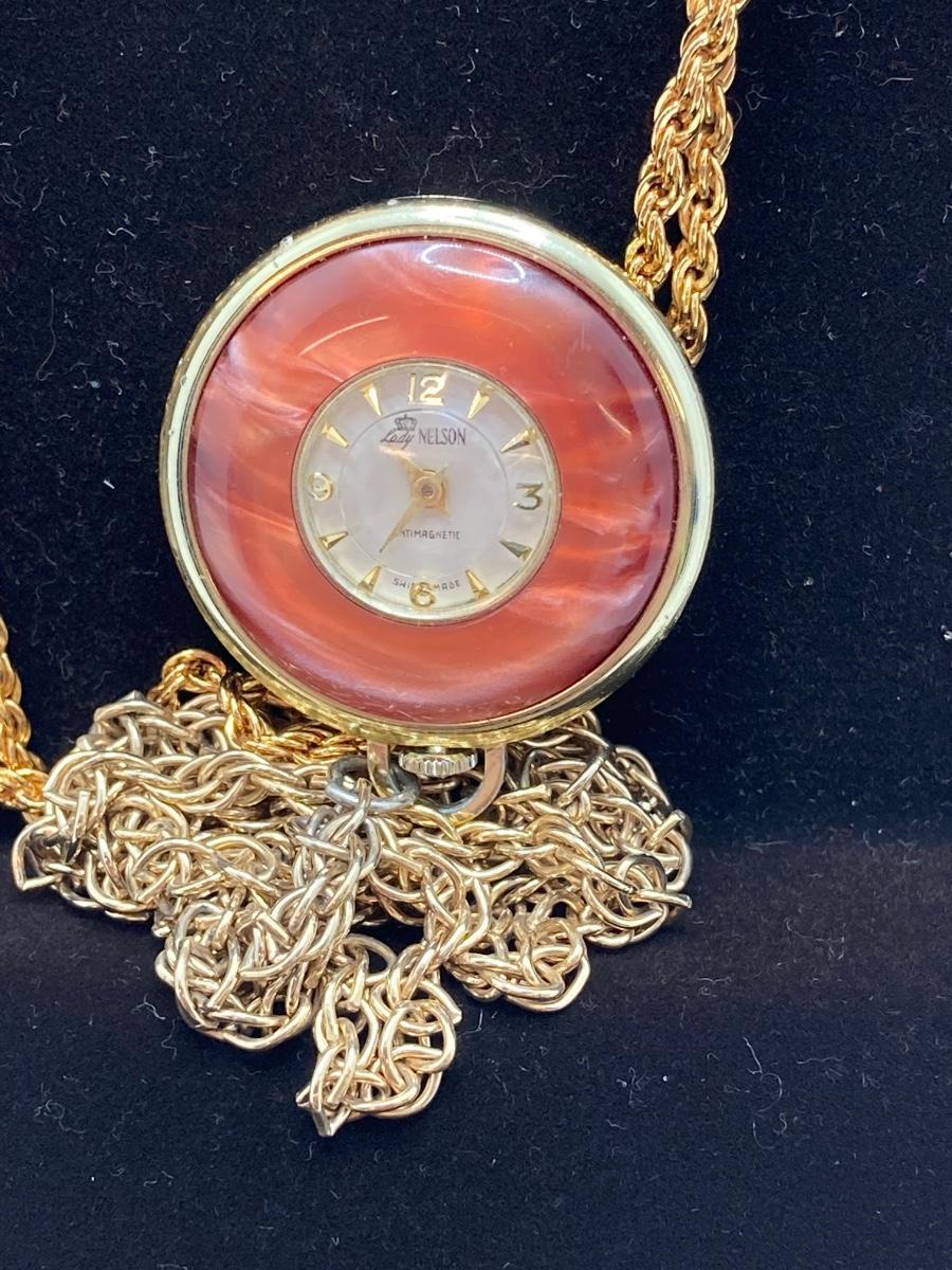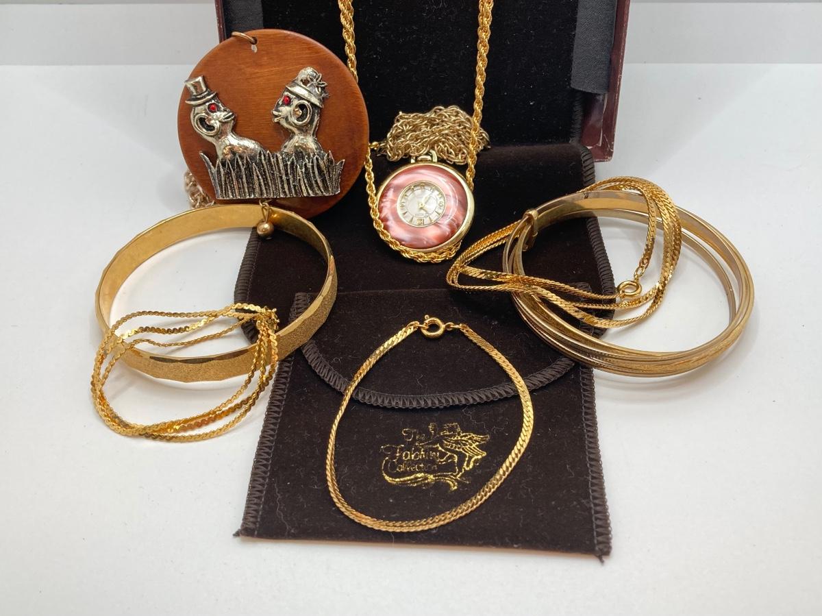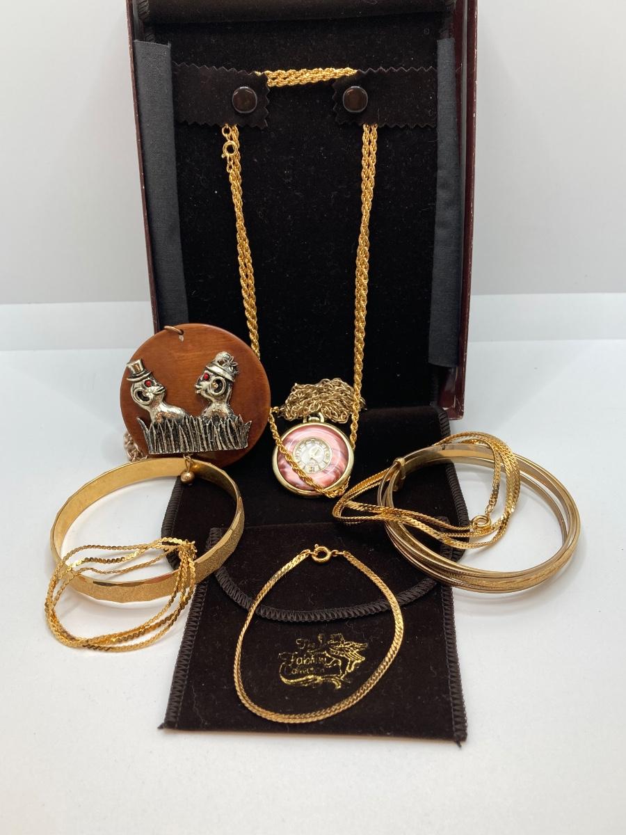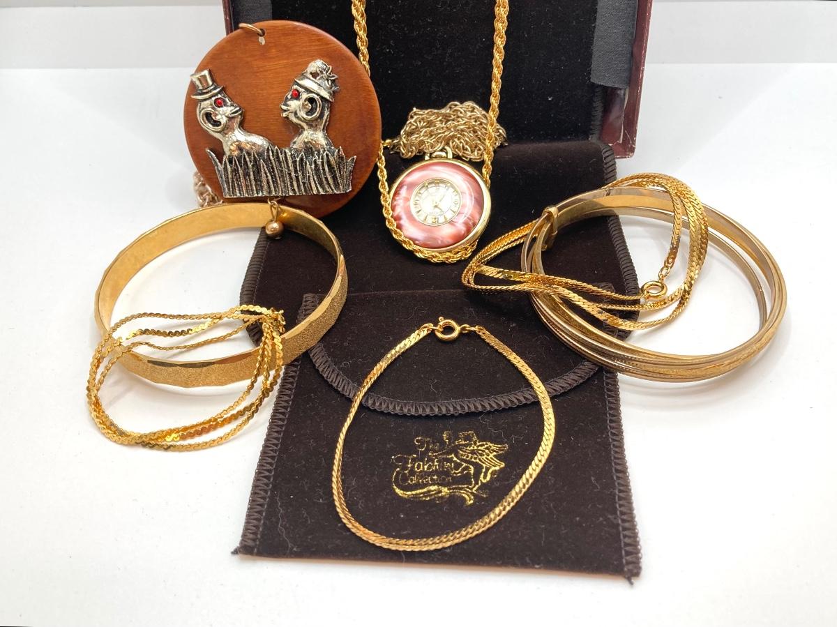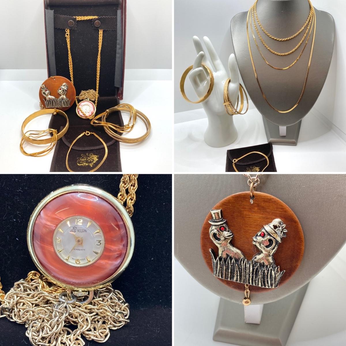 LOT 571: Vintage Jewelry Collection - Lady Nelson Antimagnetic Swiss Made Necklace Watch, Monkey Couple Medallion Necklace and Gold Tone Chains & Bracelets