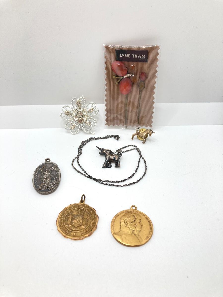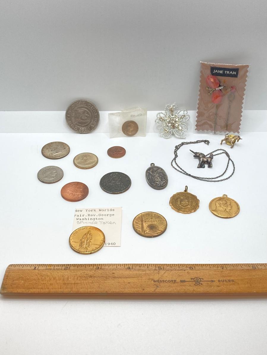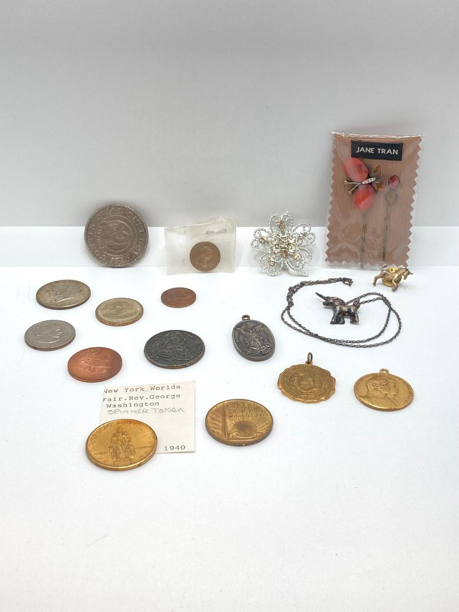 LOT 572: Collection of Vintage U.S. Coins, Tokens and Jewelry - Silver and Gold Plated and More