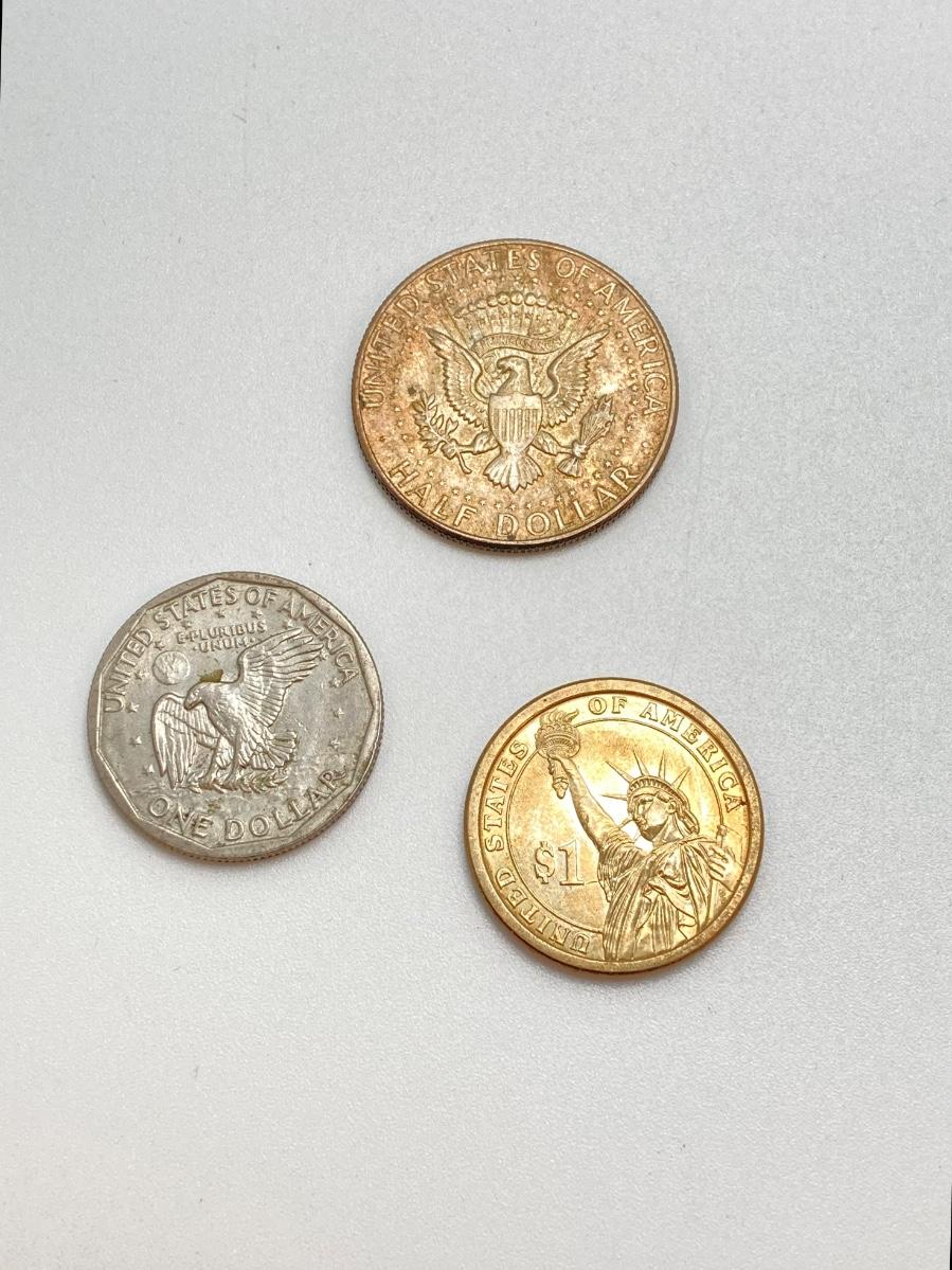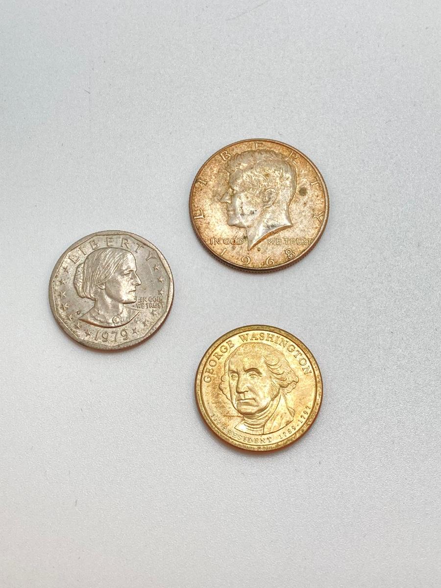 Coins - 1968 Kennedy Half Dollar, 1979 Susan B. Anthony One Dollar and President George Washington One Dollar