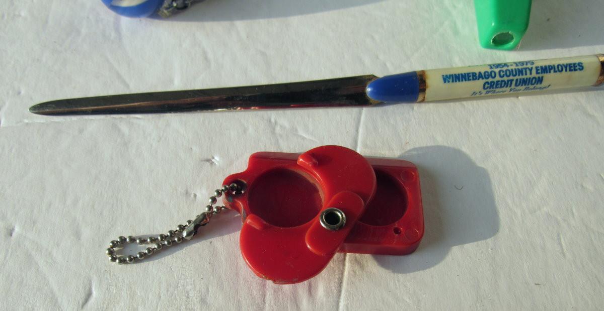The green one has an image of I think it was Mackinac Bridge, letter opener. Good shape. Minor wear. Shipping is available on this lot with actual shipping cost and additional $5 and handling fee per box. All sales final, no returns. See our terms for details.