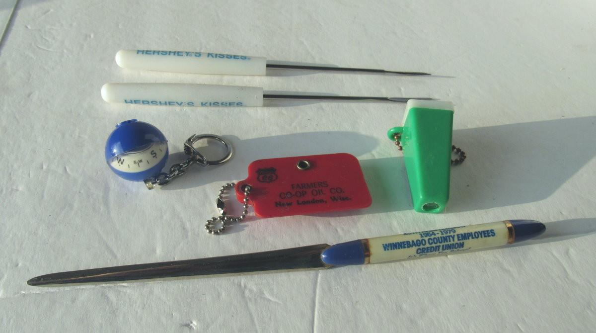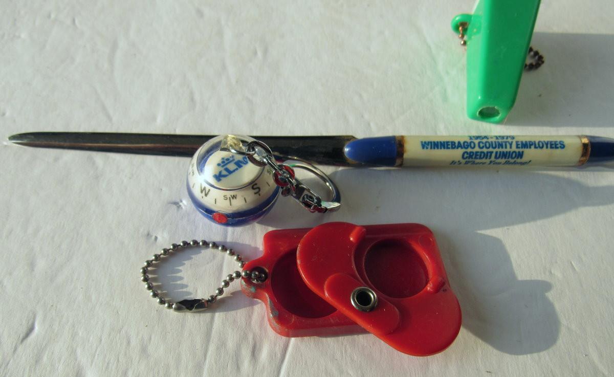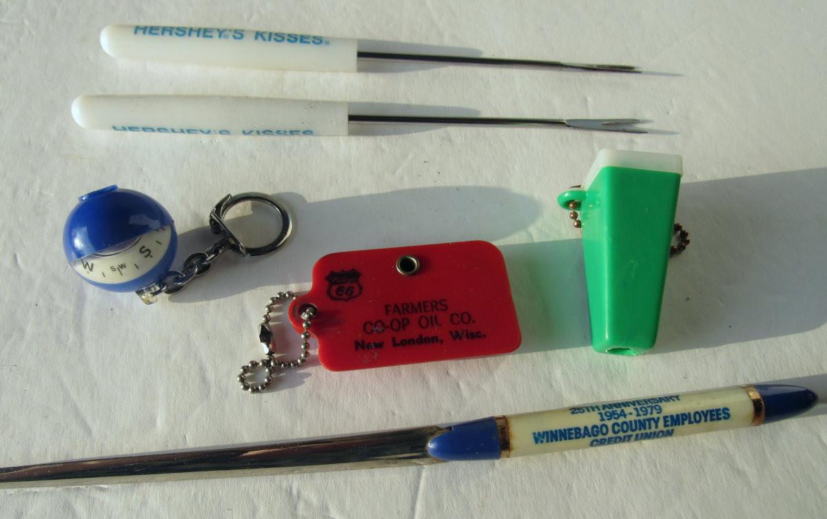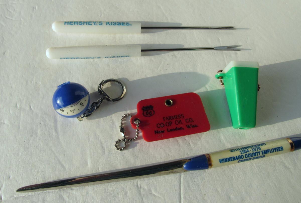 Lot 572: Neat Junk Drawer Lot, Coin Key Ring, Hershey's Fondu Forks, Compas Key Ring, More