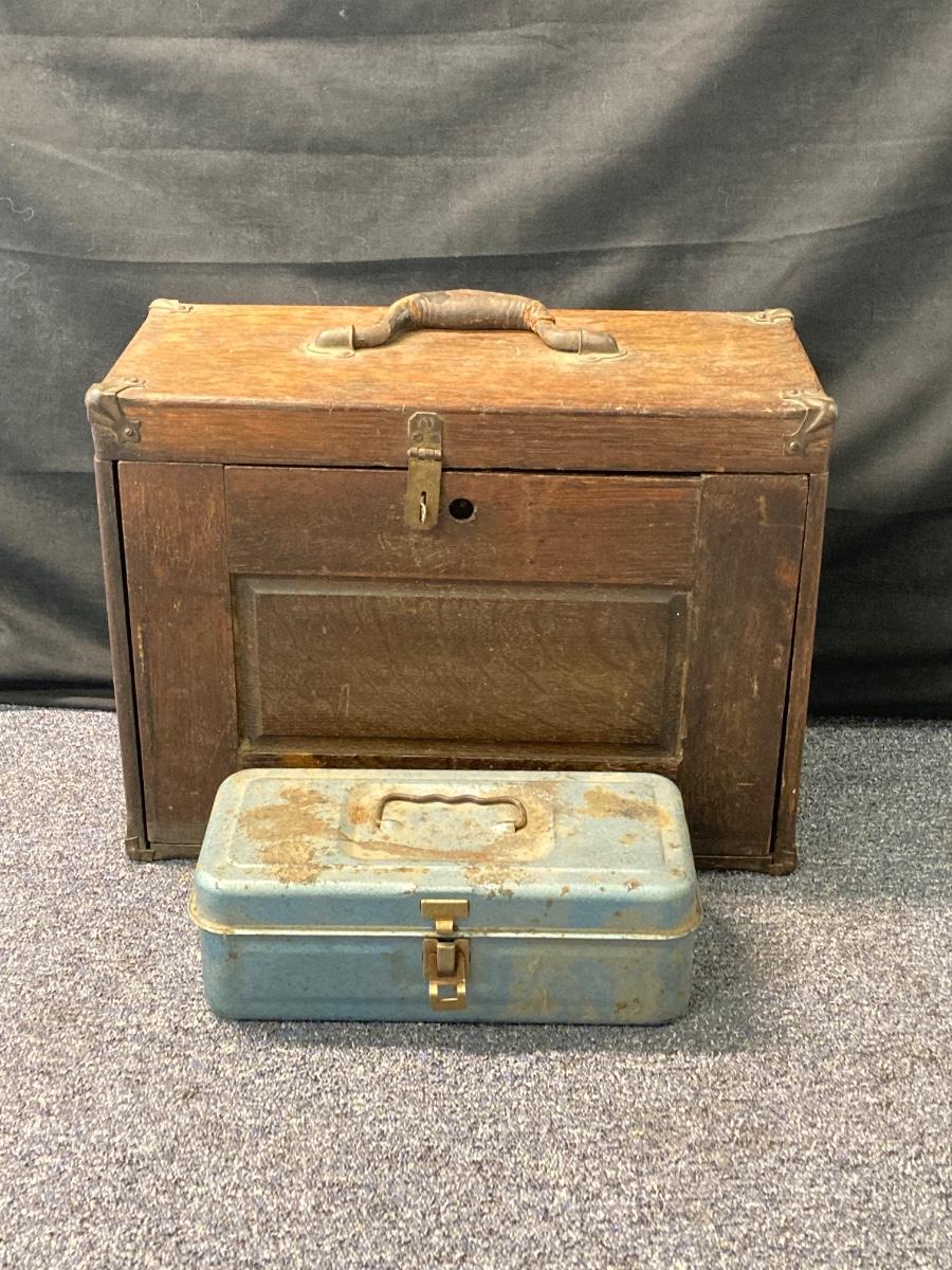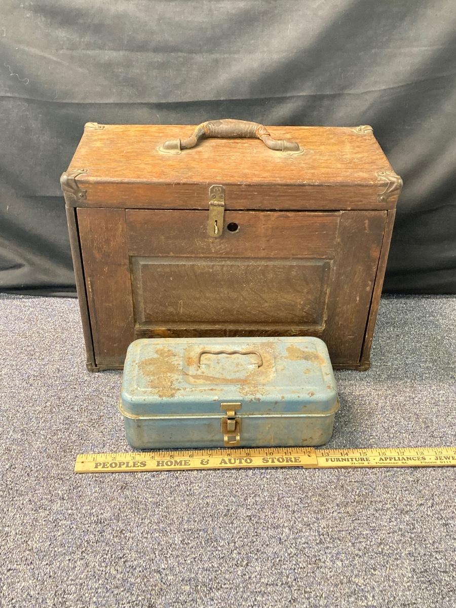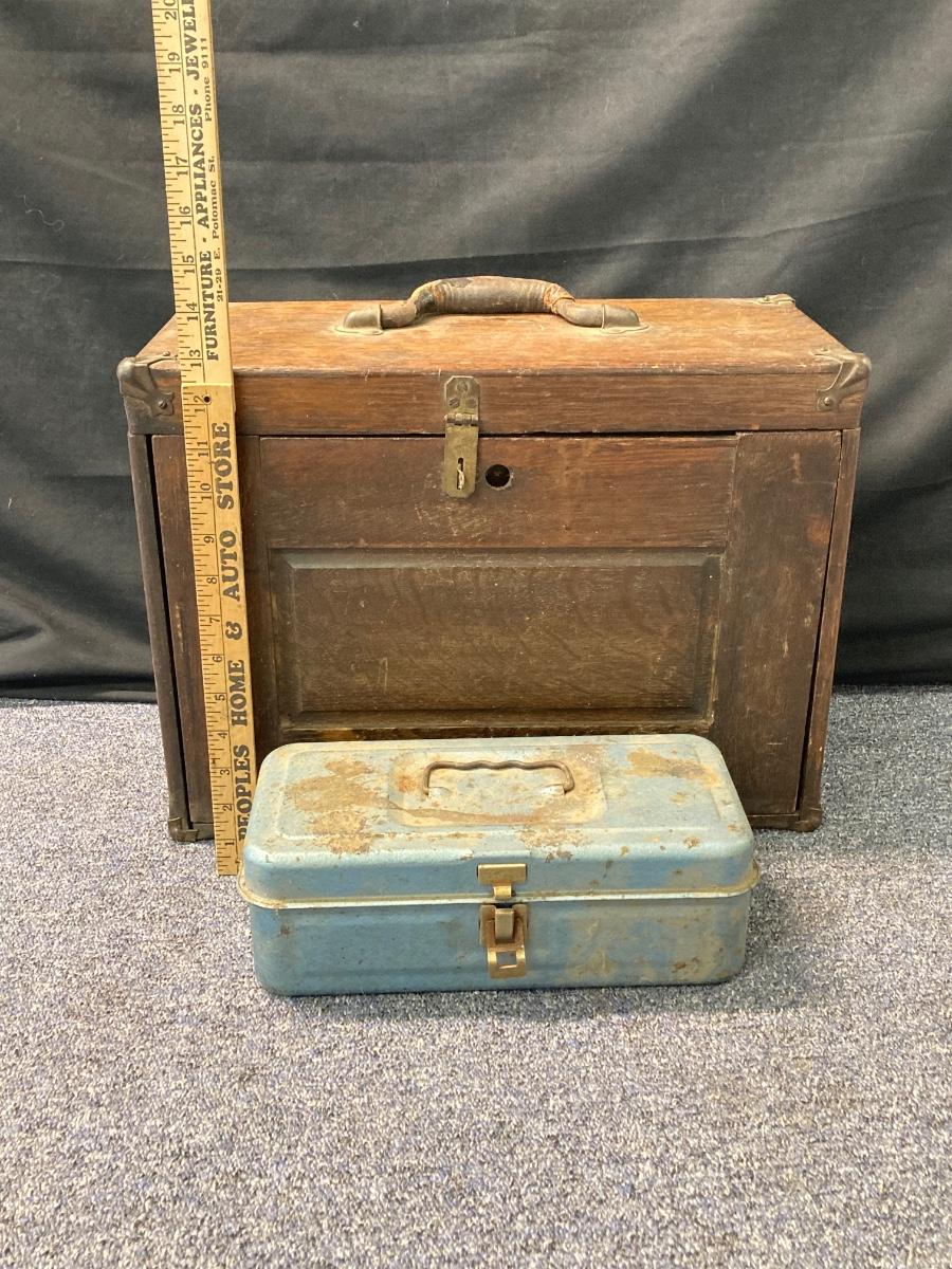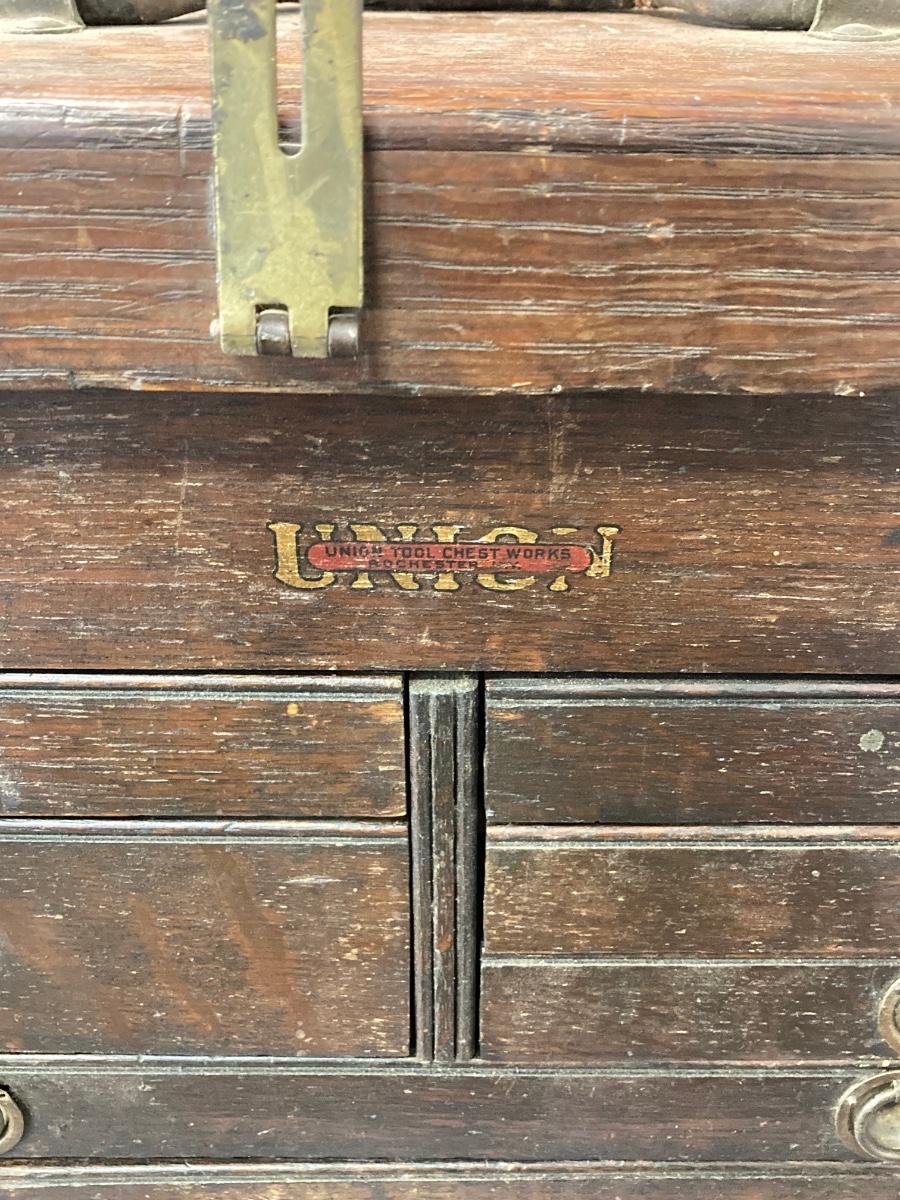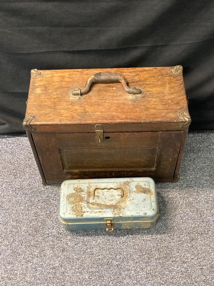 LOT 574: Vintage Union Wooden Tool Chest, Tools, Clock Repair Parts, Small Metal Toolbox with Hardware