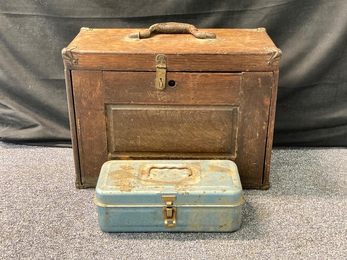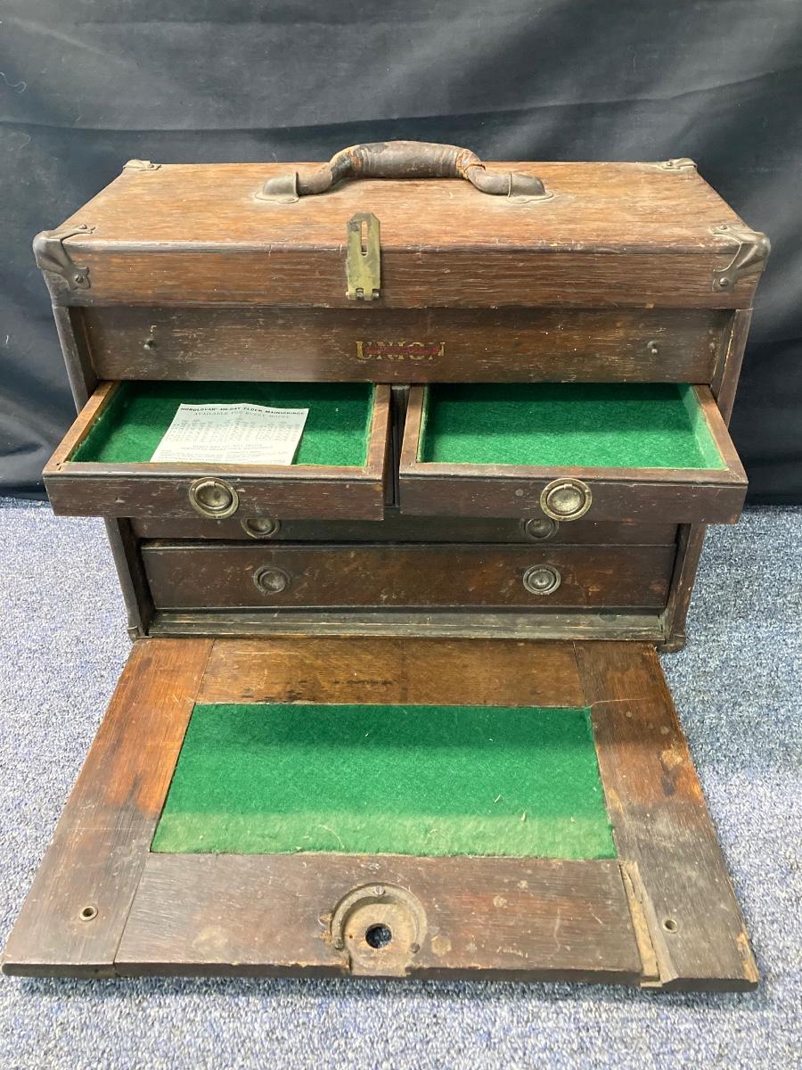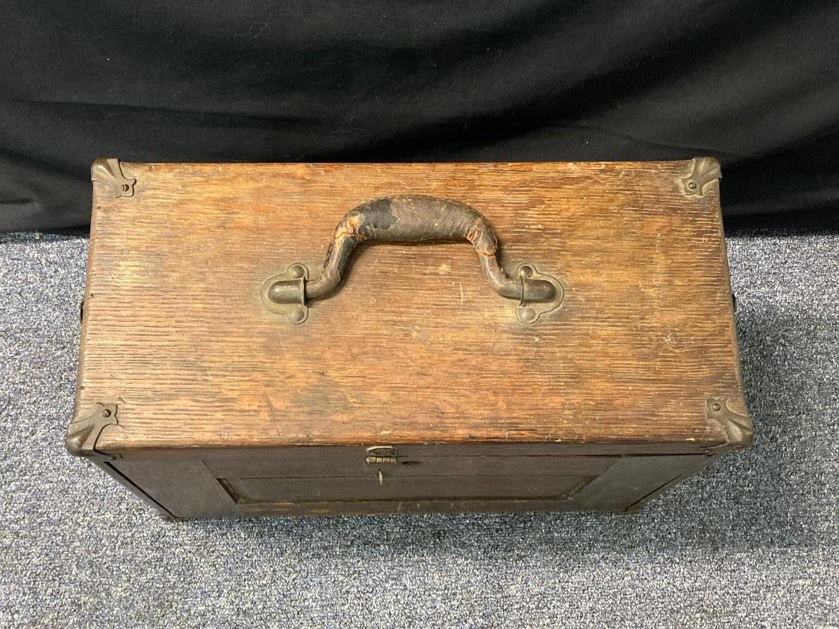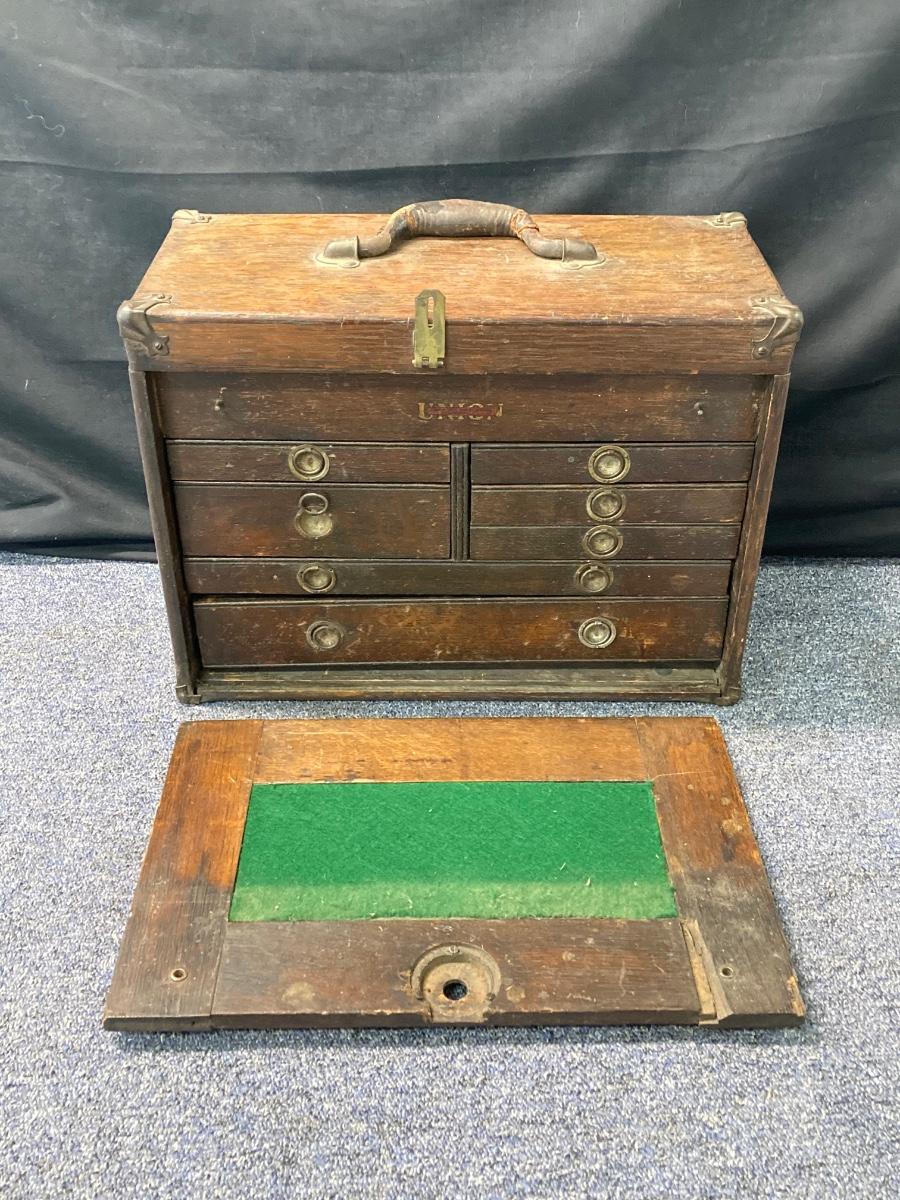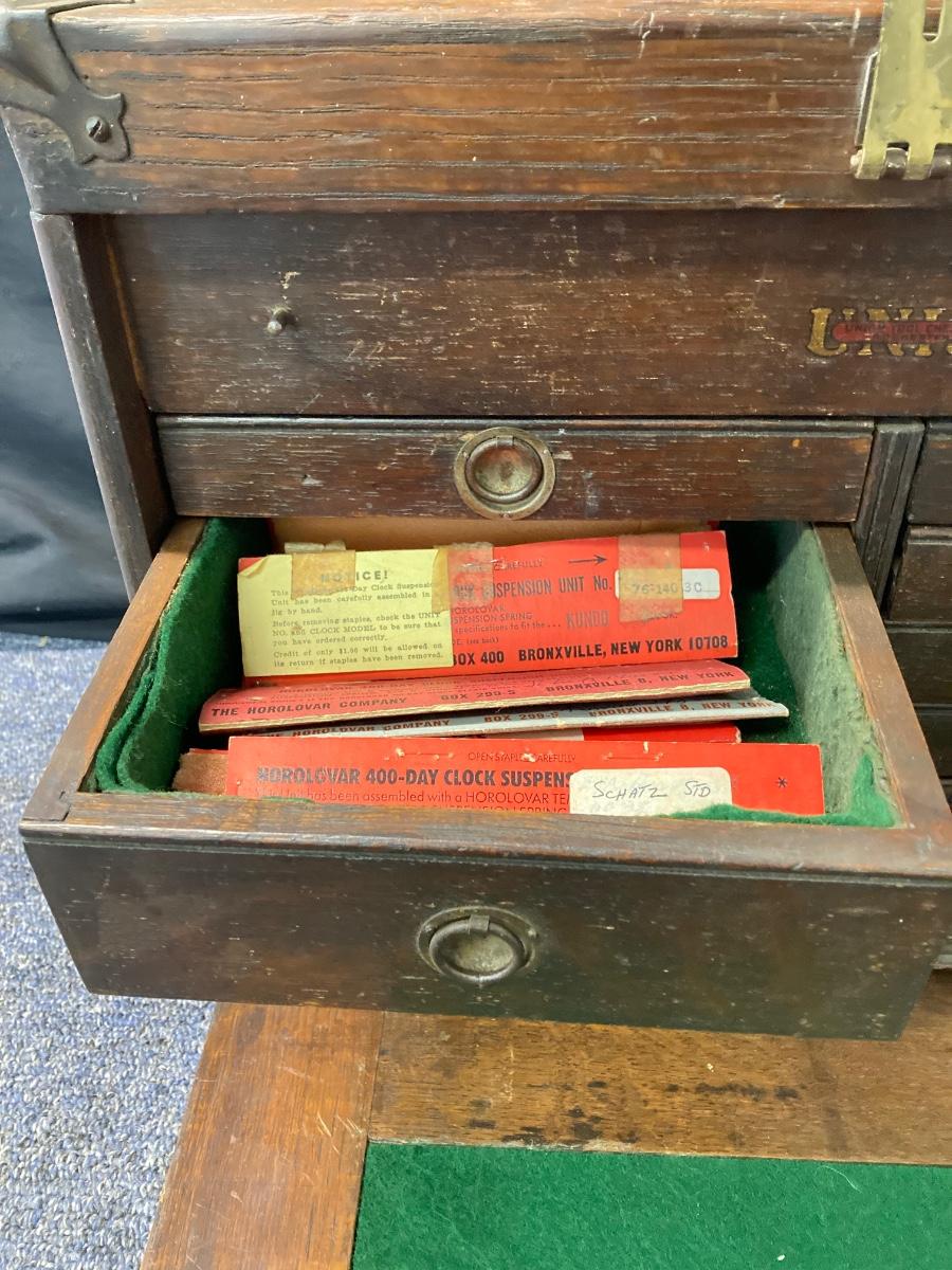 LOT 574: Vintage Union Wooden Tool Chest, Tools, Clock Repair Parts, Small Metal Toolbox with Hardware