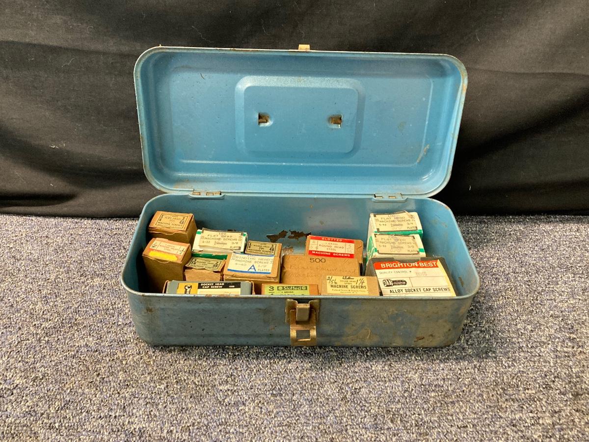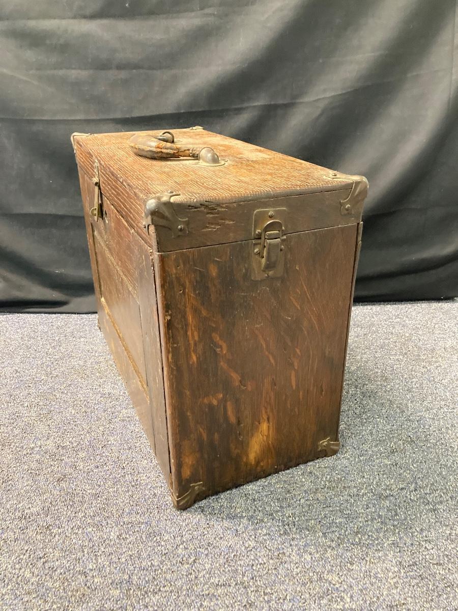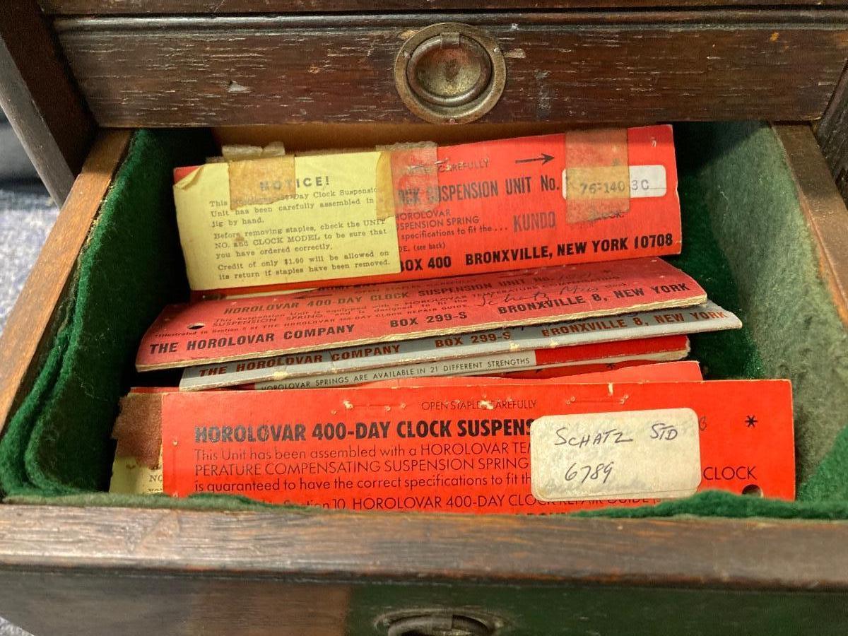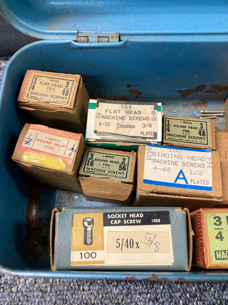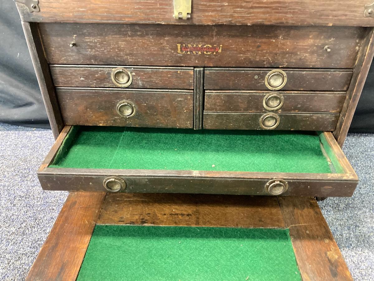 LOT 574: Vintage Union Wooden Tool Chest, Tools, Clock Repair Parts, Small Metal Toolbox with Hardware
