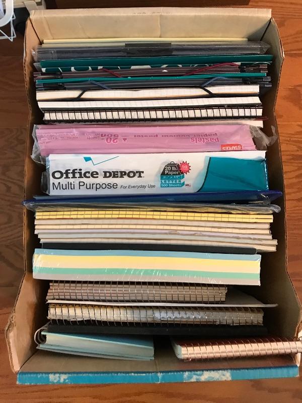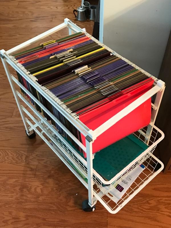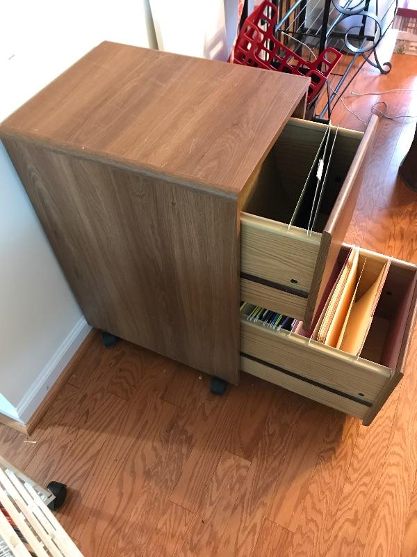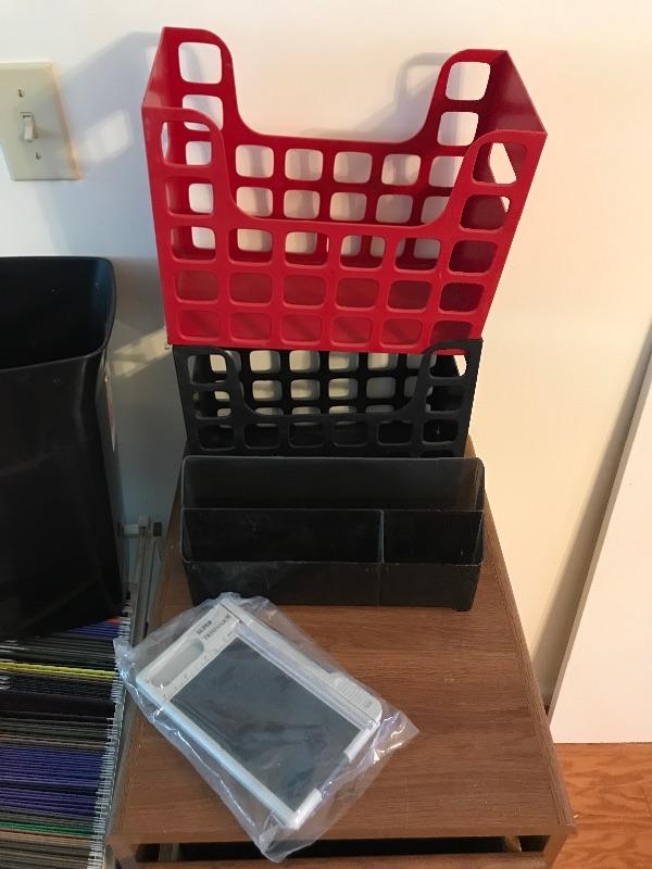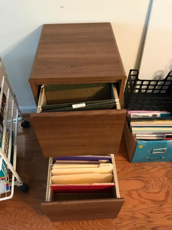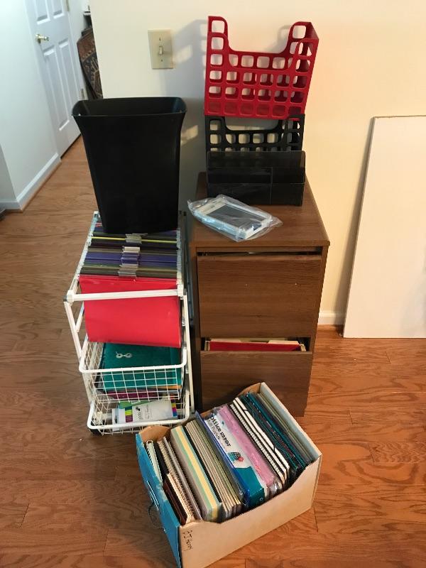 Wood 2 drawer file cabinet w/ hanging folders measures 30” tall 15” wide and 20” deep. Small metal rolling organizer w/ hanging folders and 2 drawers measures 2’ tall 15” wide and 21” deep, hefty 6 gallon waste basket w/ handles,3 desktop organizers, super trimmer, printer paper, notebooks, legal pads, clip boards,folders,report covers and pencils