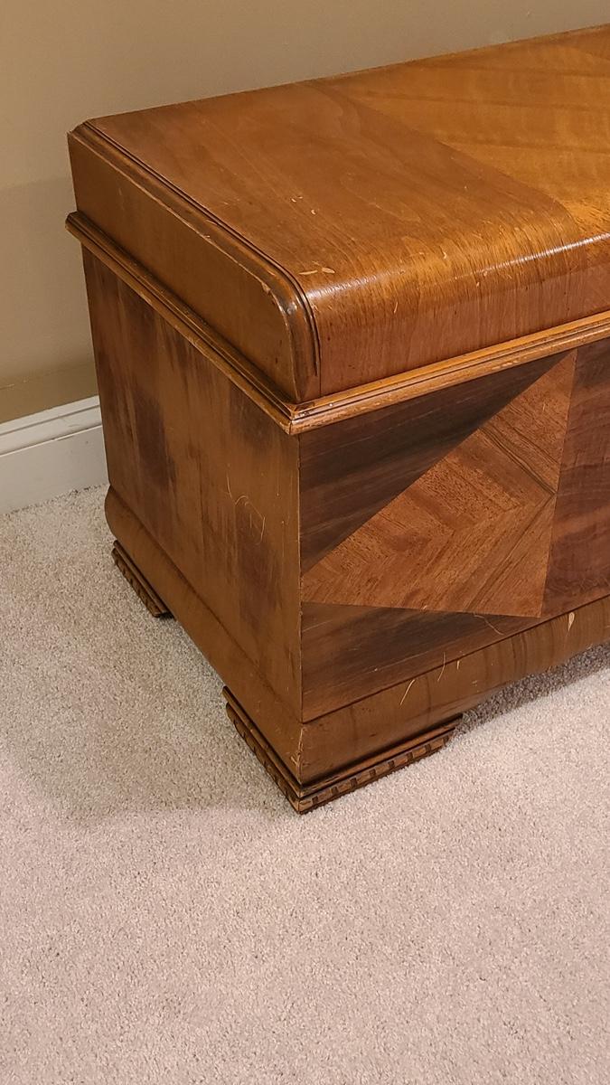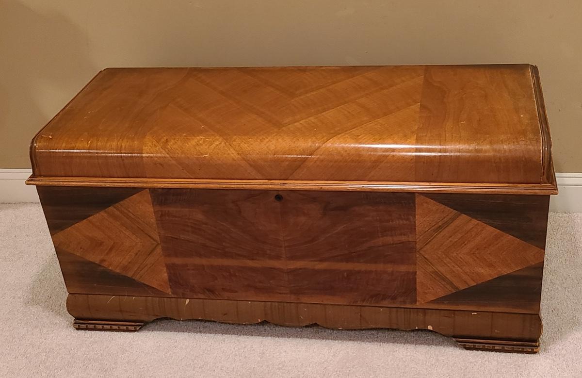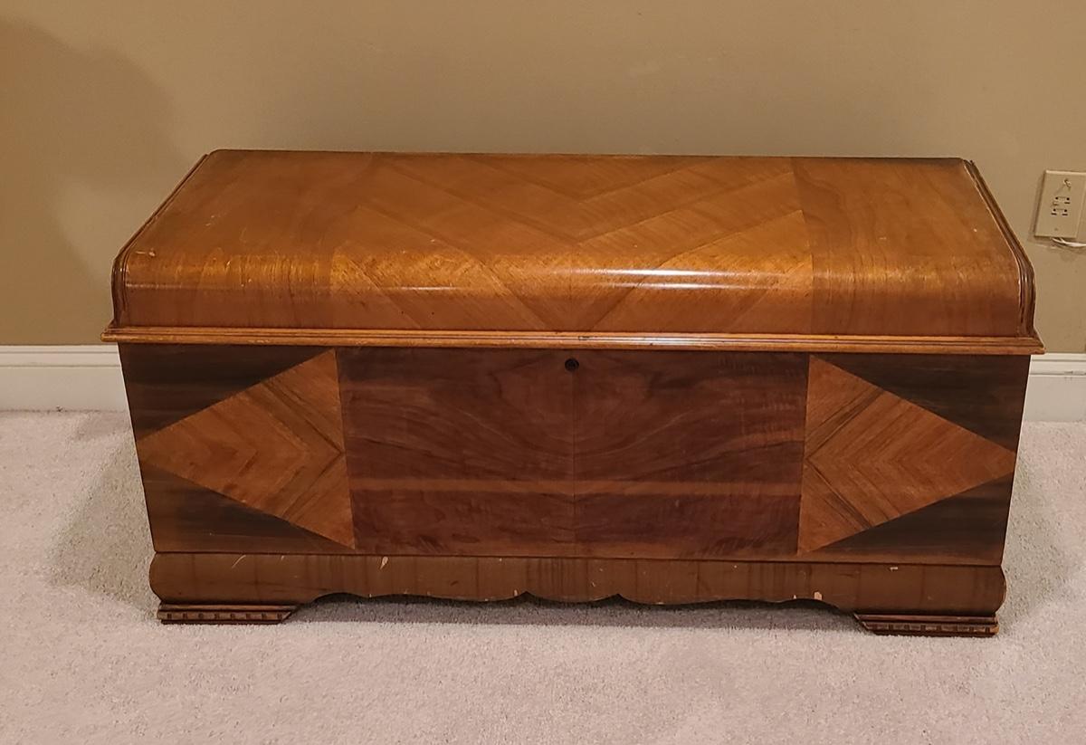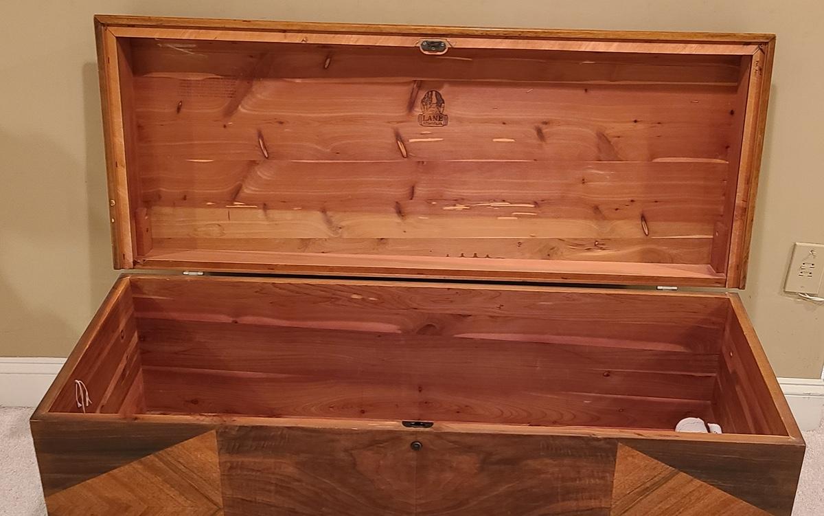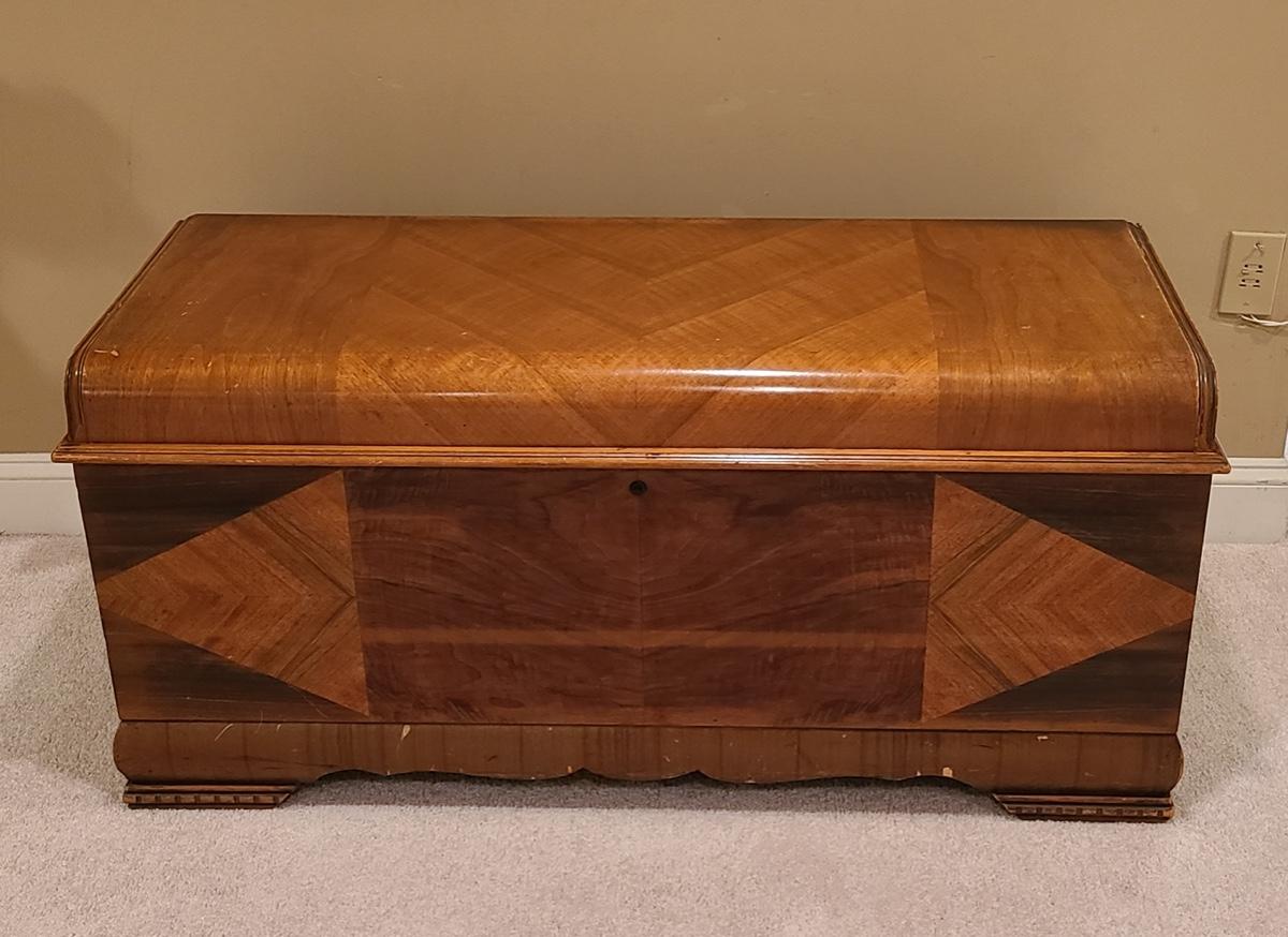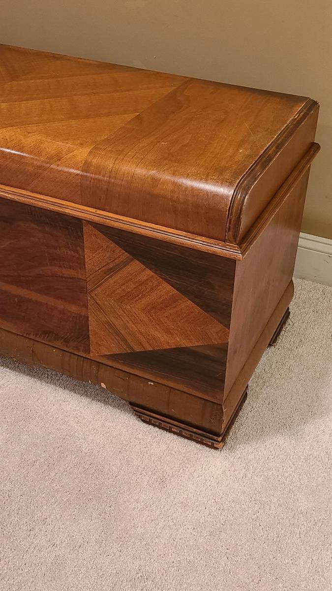 47x20x22 inches. Gorgeous vintage cedar chest with detailed wood design, minor wear from age. Solid and sturdy, you will need to remove lock or contact Lane for safety latch as these cause suffocation if locked/closed. Please see all pictures for content of the lot, condition of the lot, and measurements if taken. Pictures are the best representation of the items listed and items are untested unless indicated in description. Thank you for looking and have fun bidding!