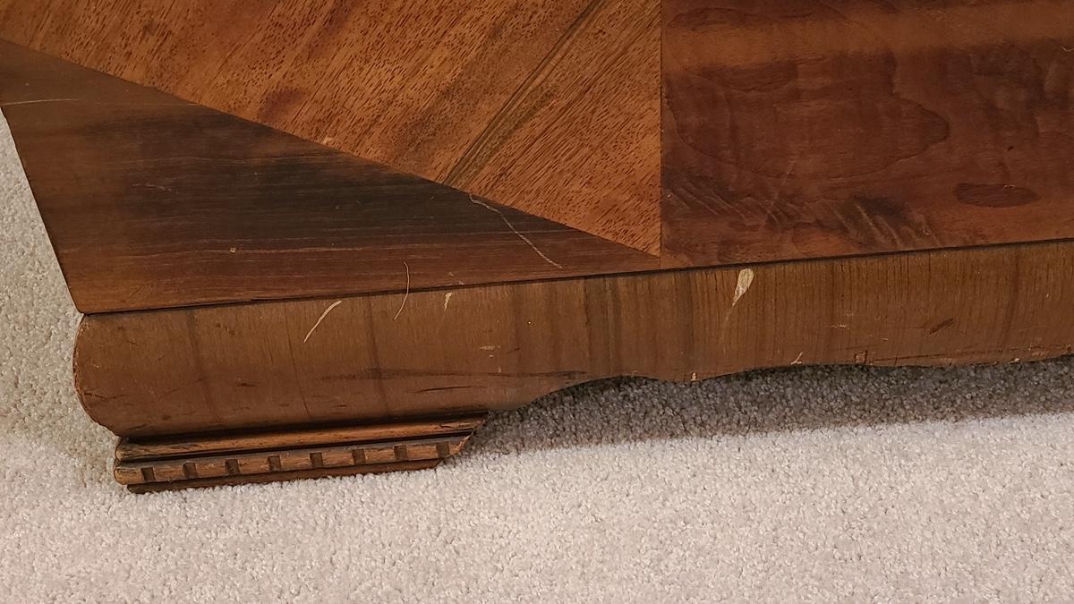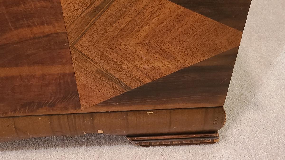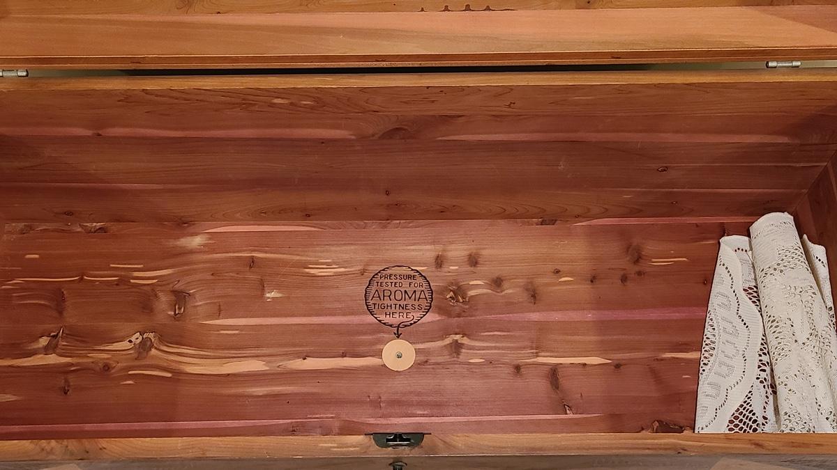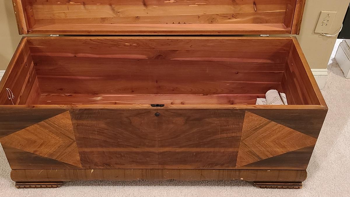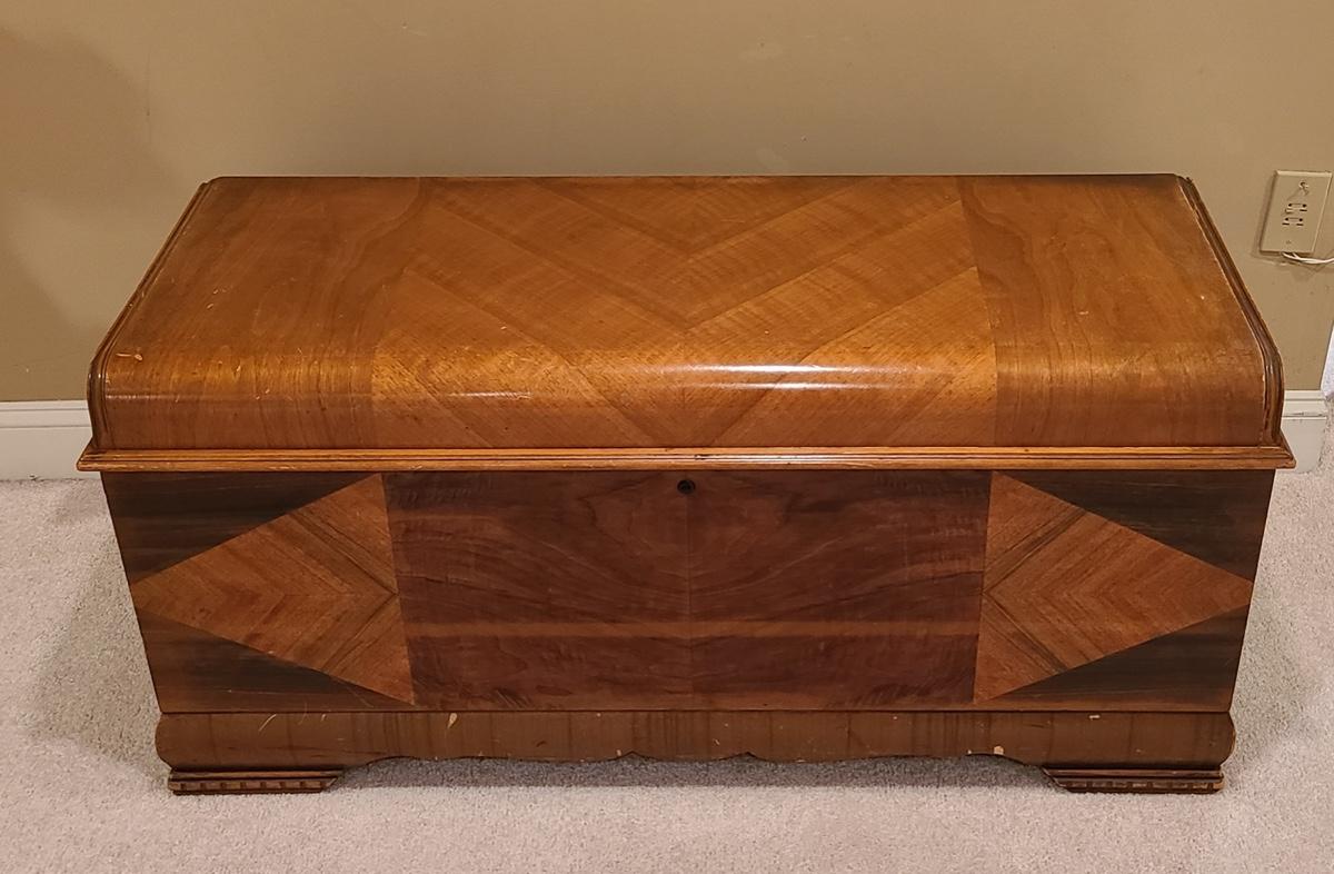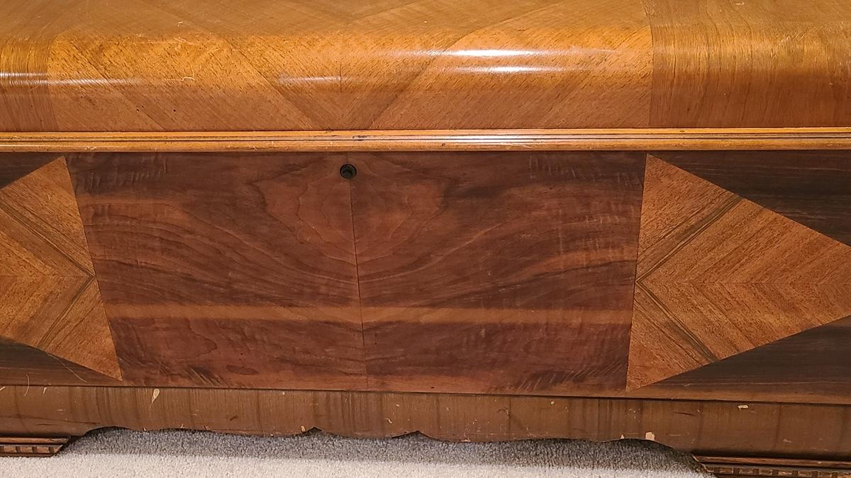 47x20x22 inches. Gorgeous vintage cedar chest with detailed wood design, minor wear from age. Solid and sturdy, you will need to remove lock or contact Lane for safety latch as these cause suffocation if locked/closed. Please see all pictures for content of the lot, condition of the lot, and measurements if taken. Pictures are the best representation of the items listed and items are untested unless indicated in description. Thank you for looking and have fun bidding!