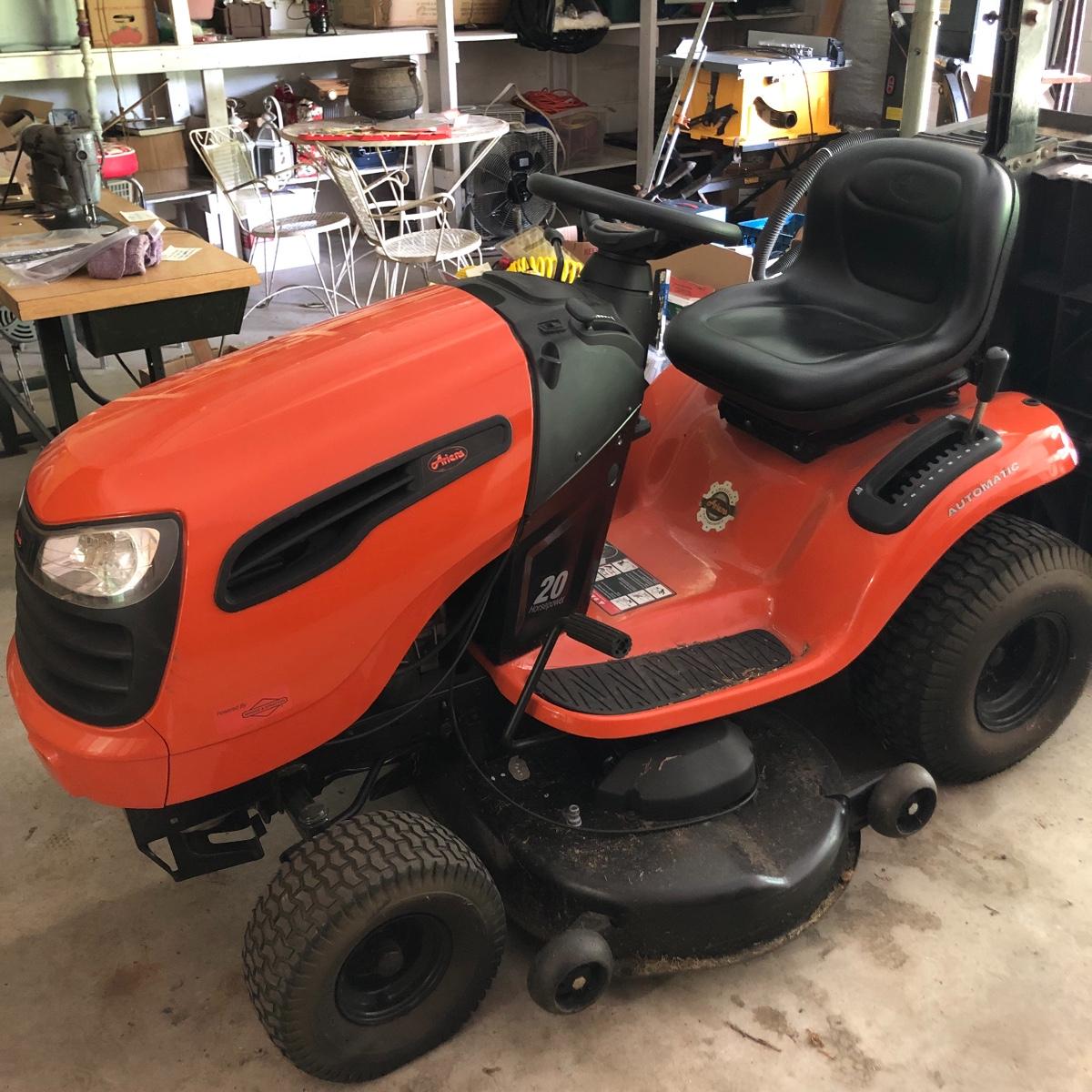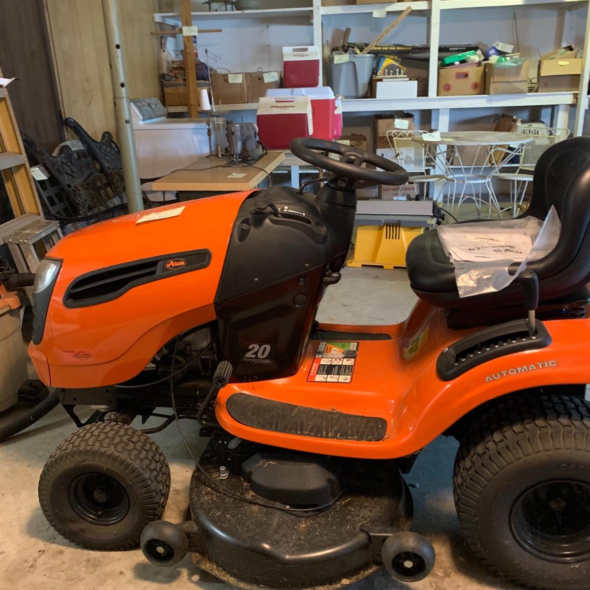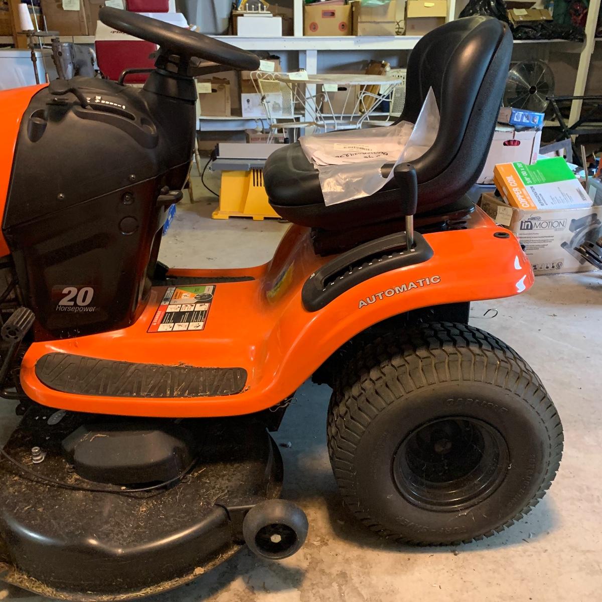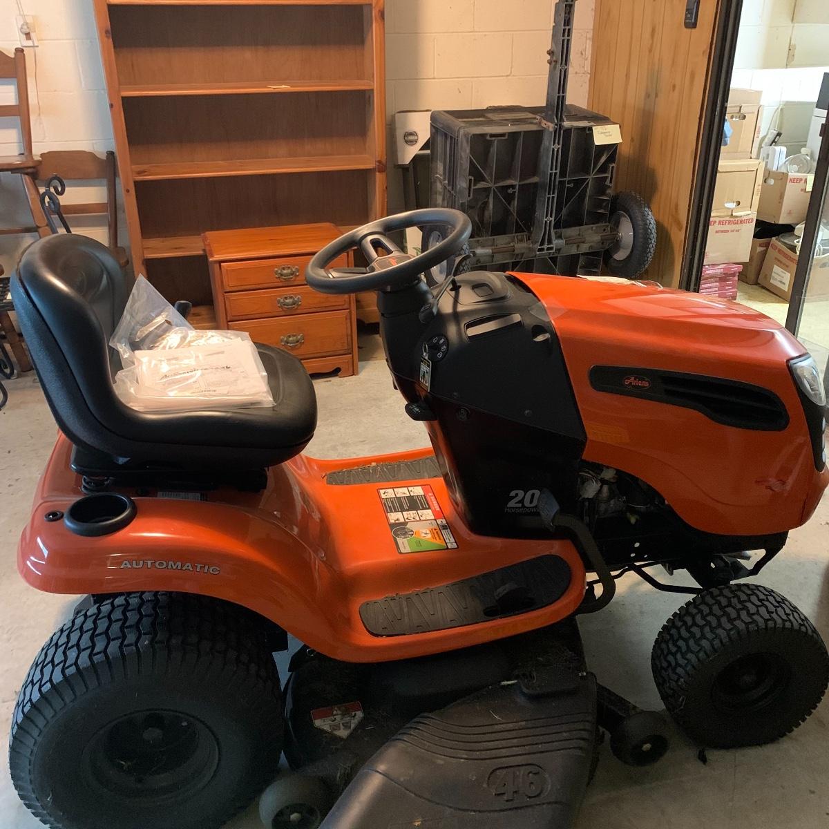 This 20 HP automatic lawn mower has a 46” cut and is super clean and been well cared for. It appears to have been sitting unused for a long time and the original battery is dead. We did jumpstart it and it cranked up quickly. See images for more information. Manual and paperwork comes with it.
