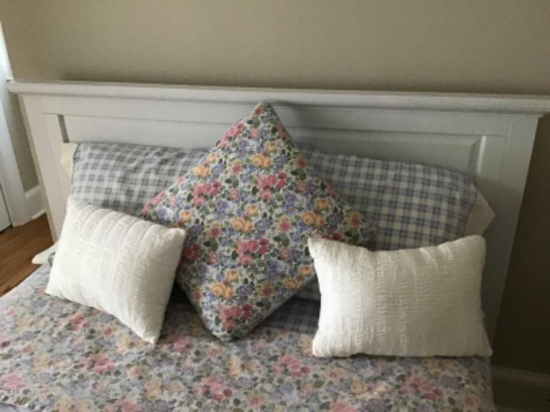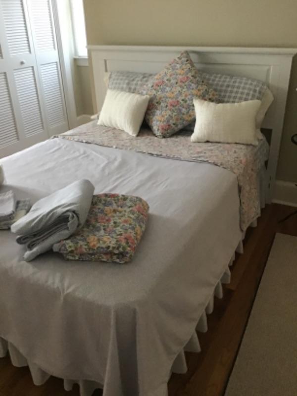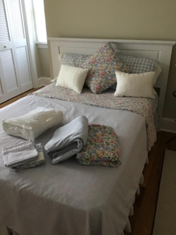White Headboard /bed, with mattress and box spring, this bed can be either a full size bed or a queen size depending on the size frame you attach. Full size as shown here with LAURA ASHLEY bedding included, extra pillowcases, and matching curtains. Also included is a light weight blanket