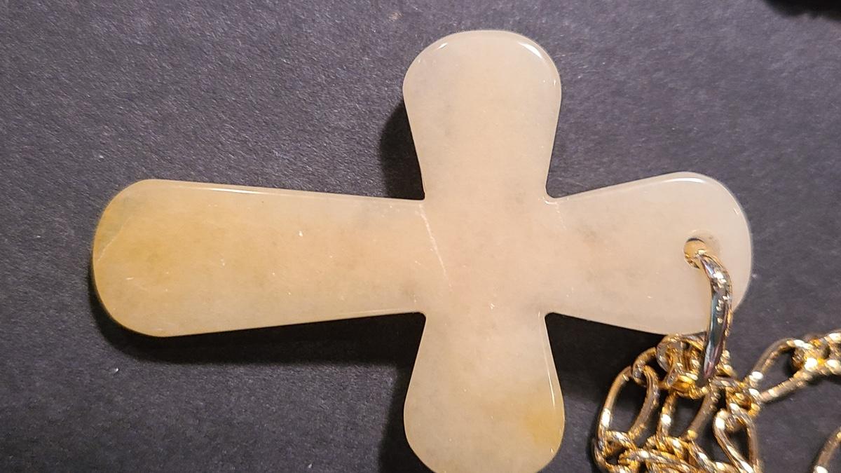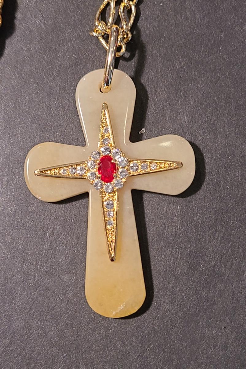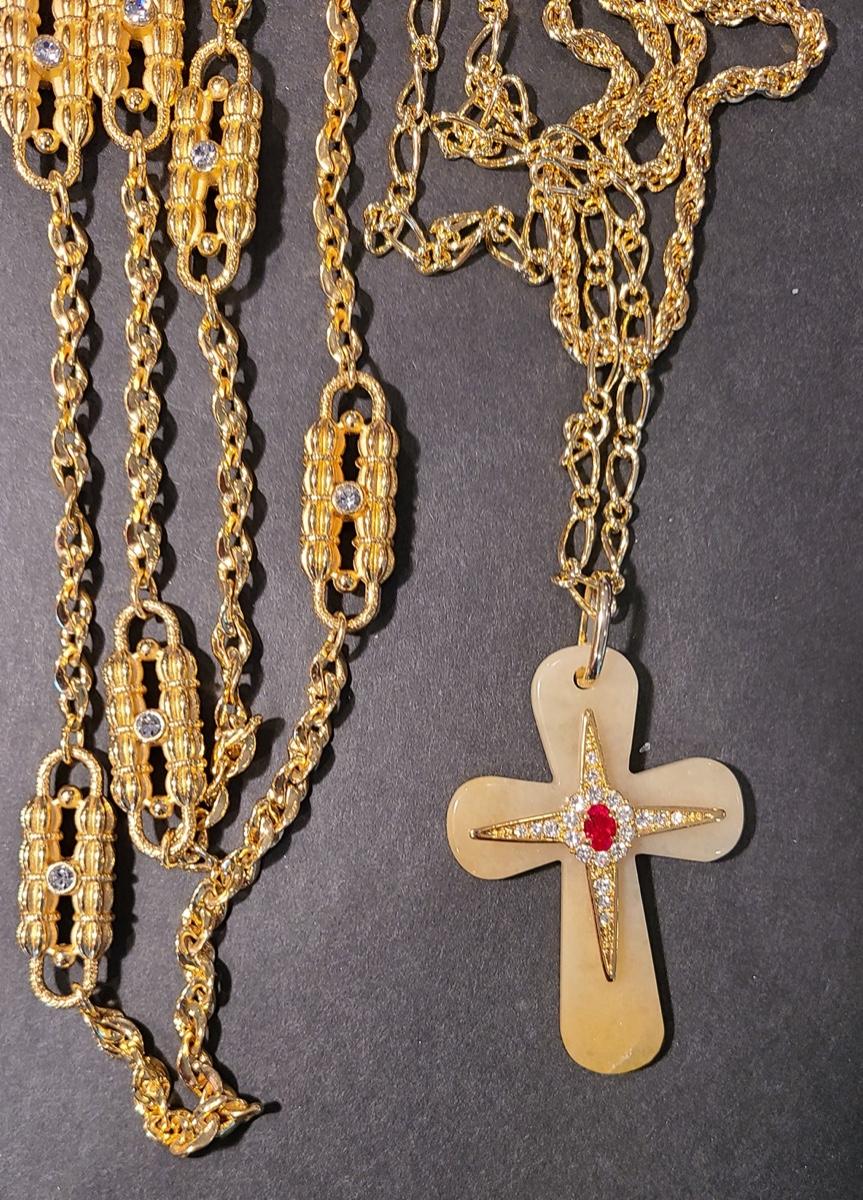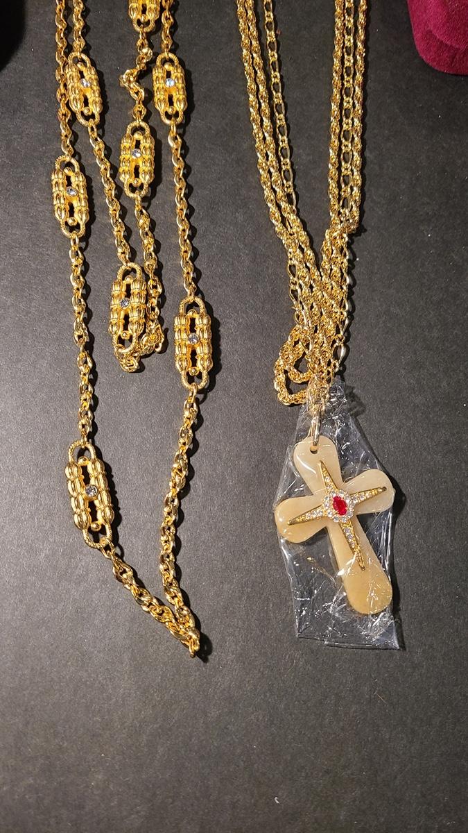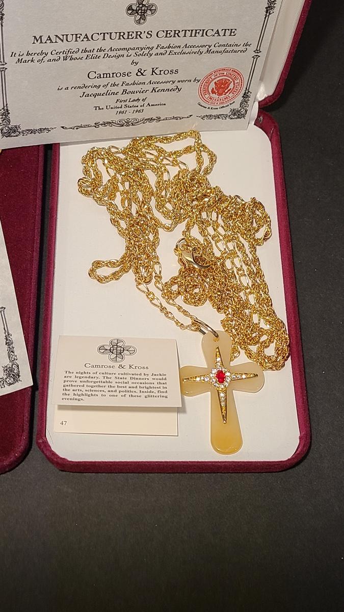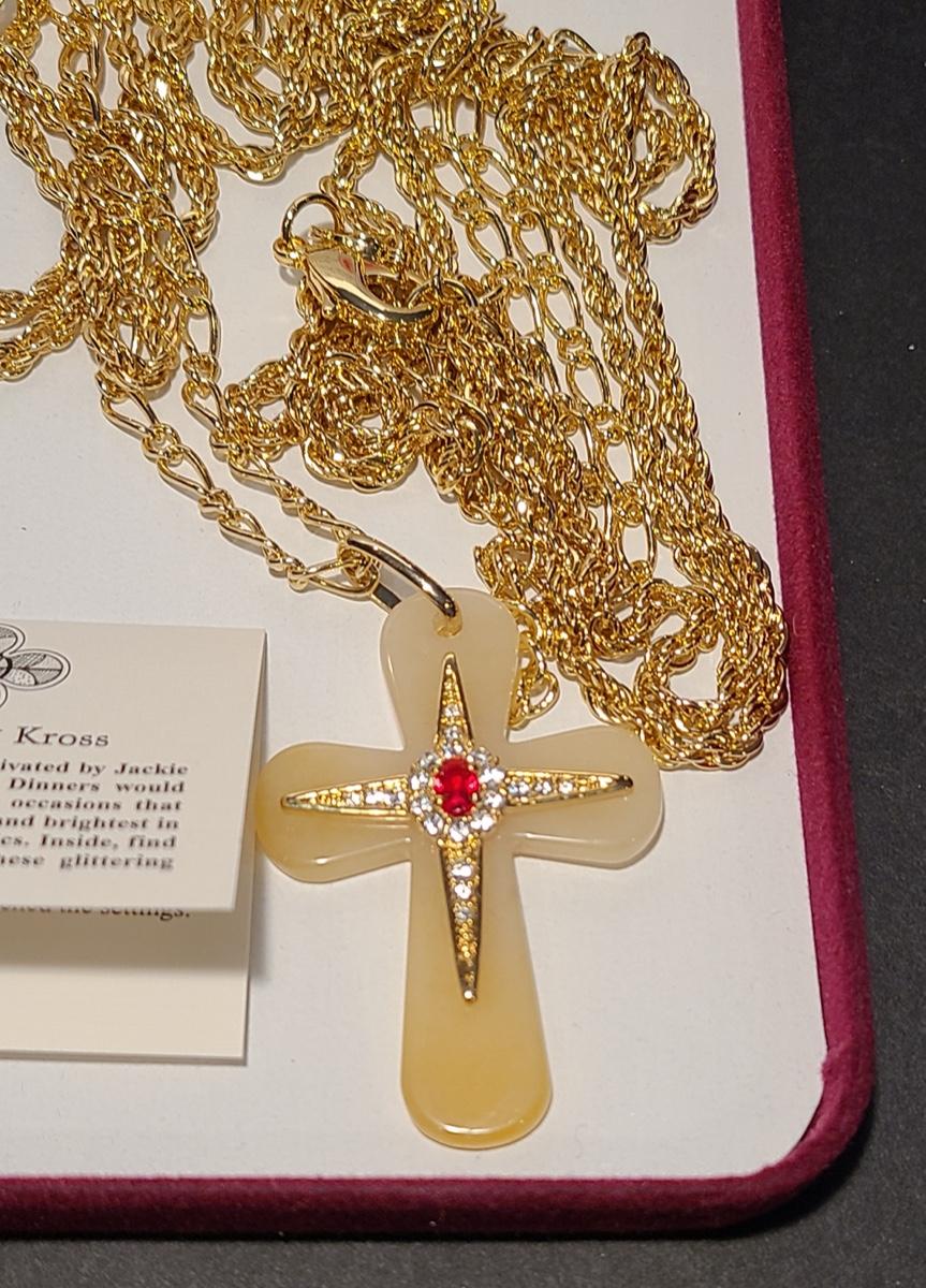 Two necklaces inspired by the Jackie O collection including a gold tone paperclip necklace, and gold tone/stone cross necklace. Please see all pictures for content of the lot, condition of the lot, and measurements if taken. Pictures are the best representation of the items listed and items are untested unless indicated in description. Thank you for looking and have fun bidding!