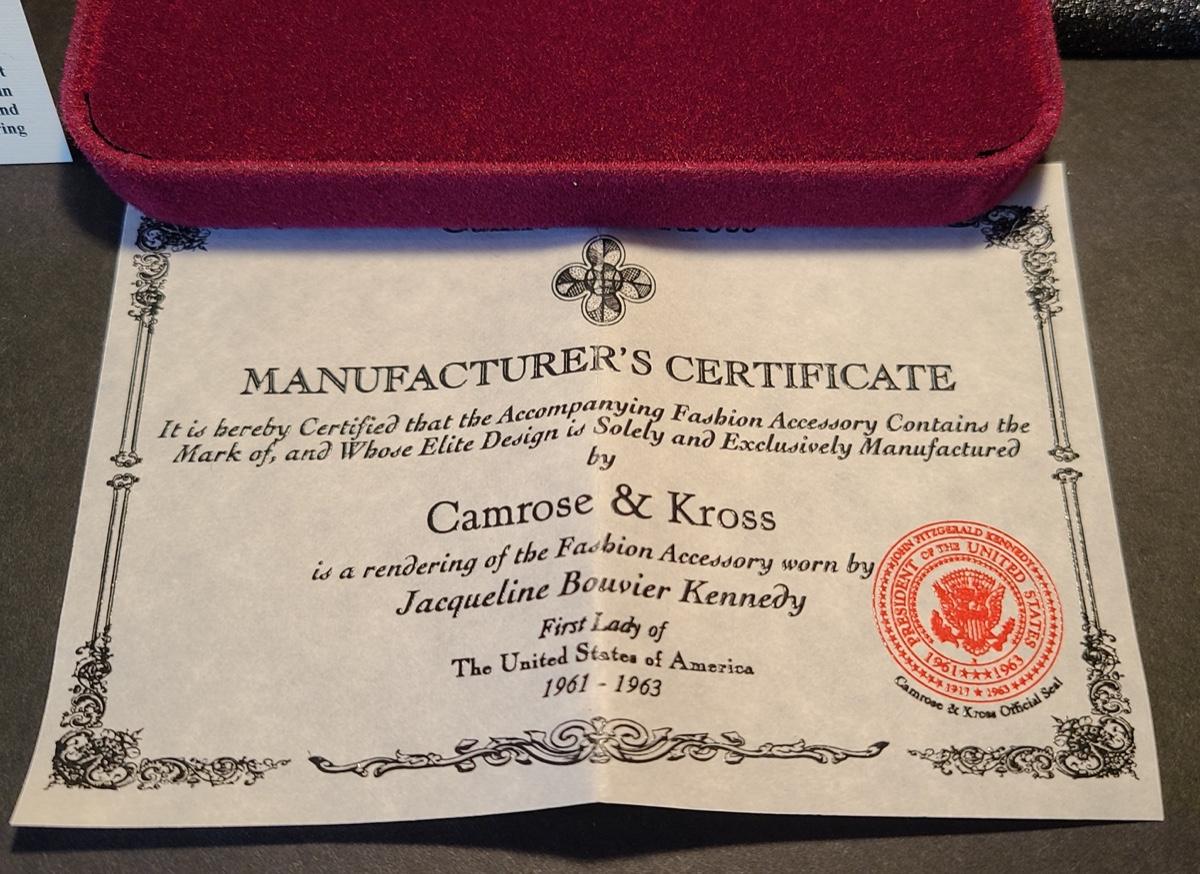 This is a gorgeous large brooch with moving wings designed by Camrose & Kross inspired by the First Lady Jackie O. Would make a great gift! Please see all pictures for content of the lot, condition of the lot, and measurements if taken. Pictures are the best representation of the items listed and items are untested unless indicated in description. Thank you for looking and have fun bidding!