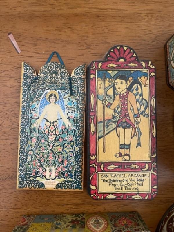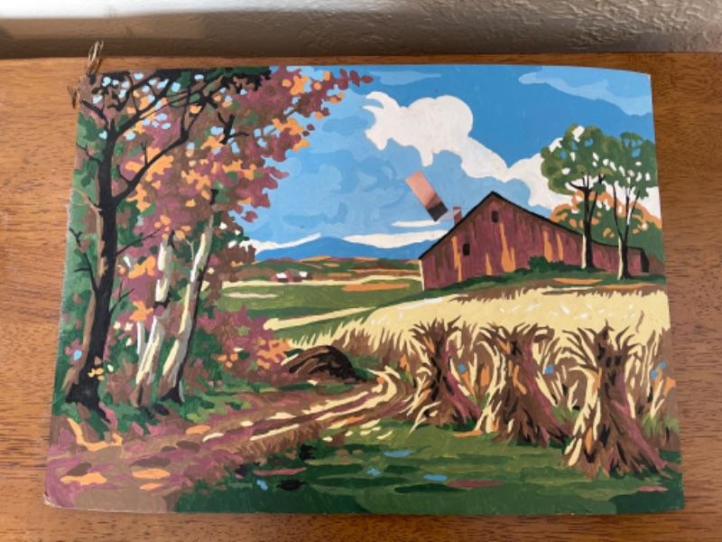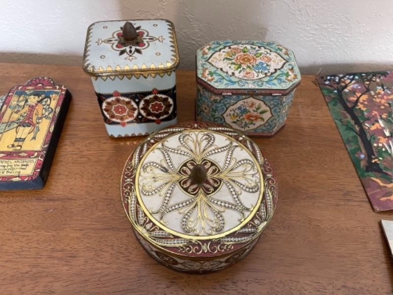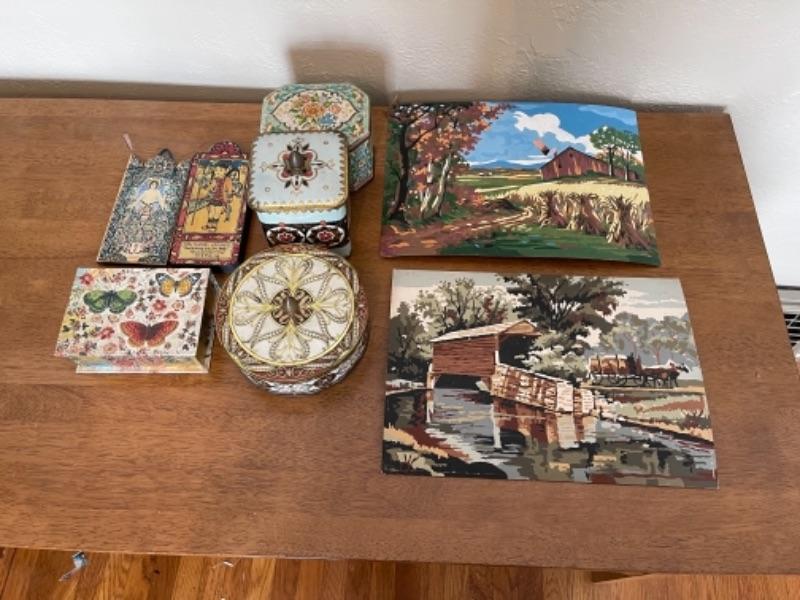 Lot 57BR. Lot of tins, paint by numbers art, wall decor, boxes--$40