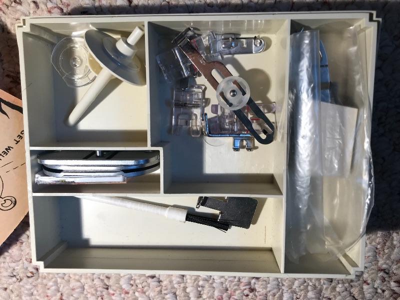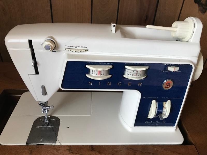 Singer enclosed in wooden cabinet. Includes sewing motions, and Singer accessories 30 L. 20 W 32 H