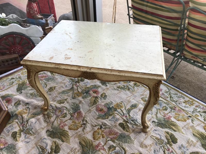 Vintage French rococo style coffee table with cabriole legs. In original white finish. Solid hardwood construction. 19" x 25" x 15" H.