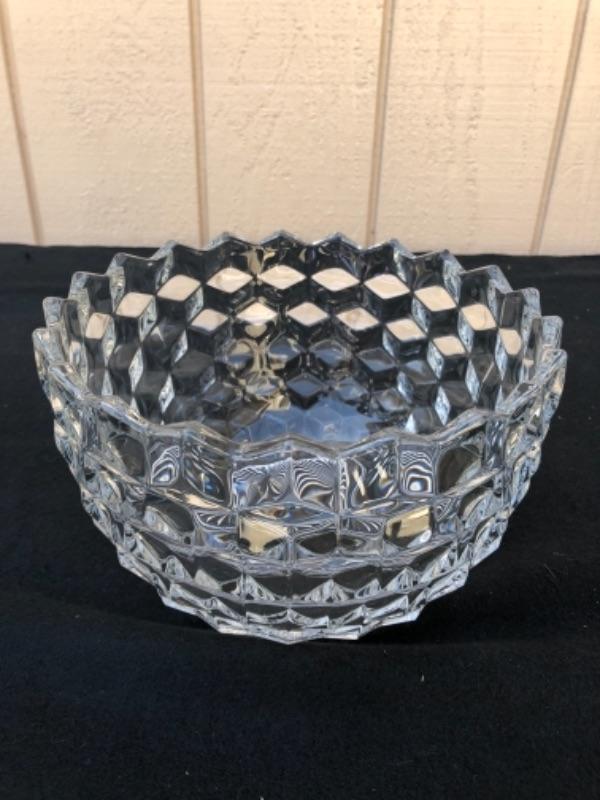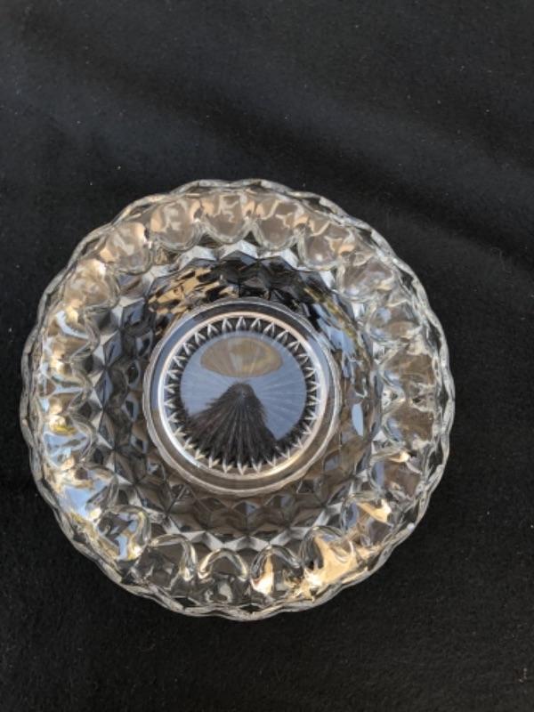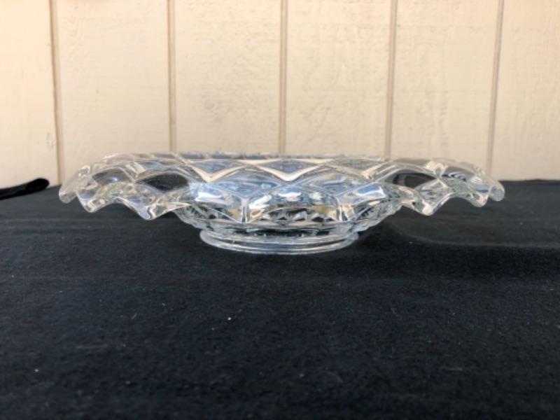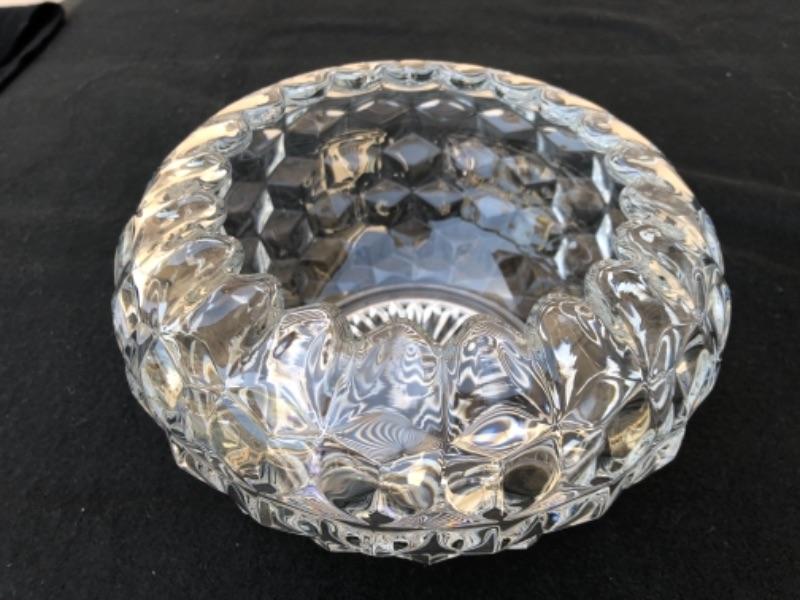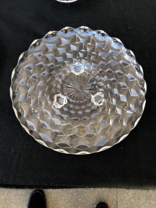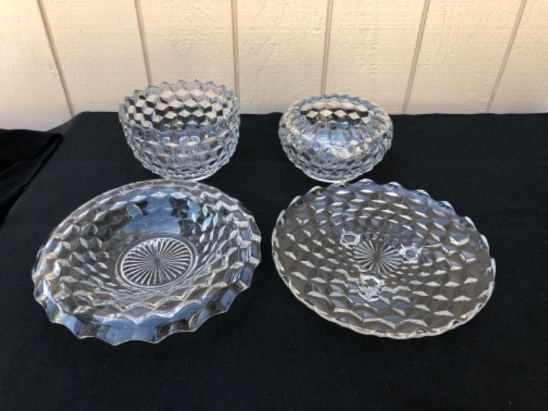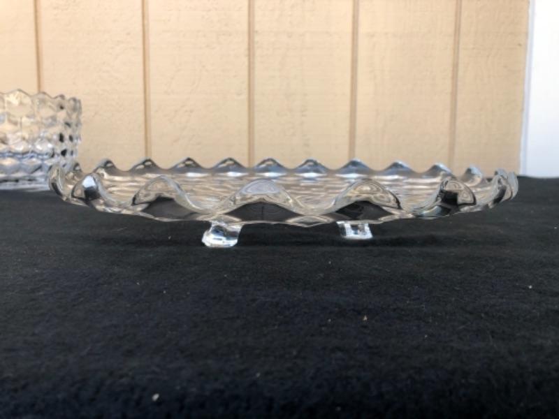 Lot 57L. Fostoria American Serving Bowls: 8” Salad Bowl with rolled edge, 8” fruit/serving bowl, 12” tri-footed Cake stand/platter, rolled edge serving bowl/centerpiece “” $45