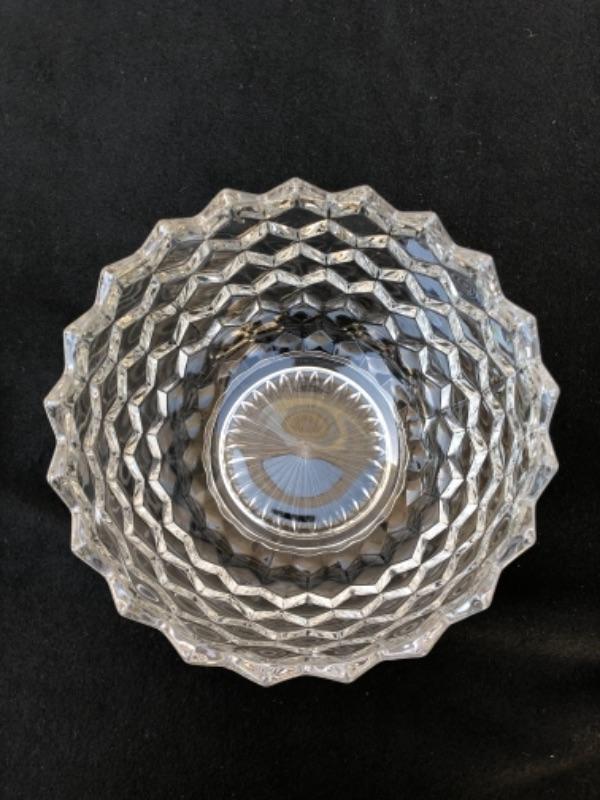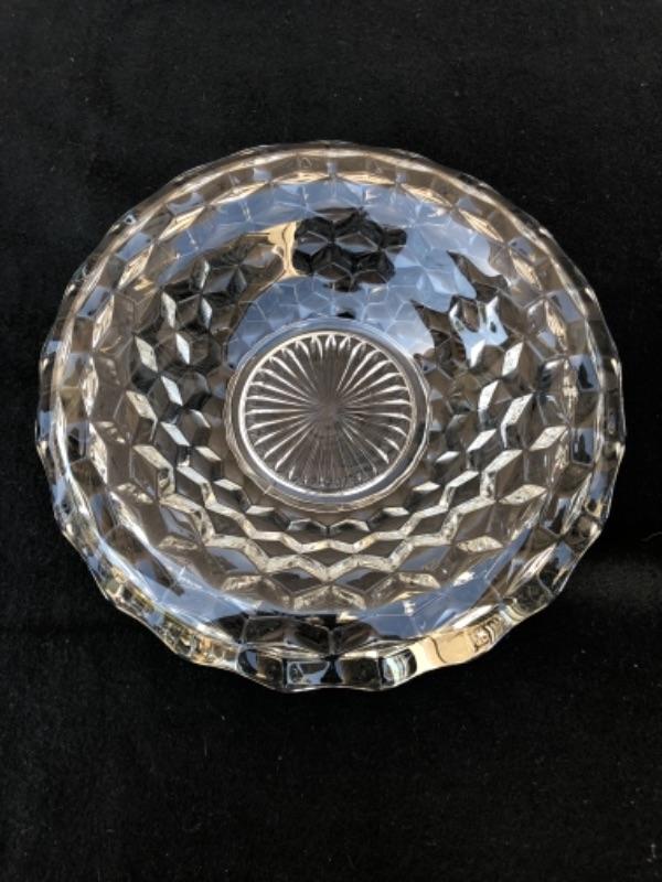 Lot 57L. Fostoria American Serving Bowls: 8” Salad Bowl with rolled edge, 8” fruit/serving bowl, 12” tri-footed Cake stand/platter, rolled edge serving bowl/centerpiece