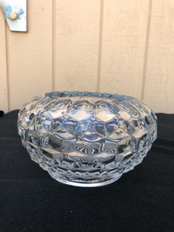 Lot 57L. Fostoria American Serving Bowls: 8” Salad Bowl with rolled edge, 8” fruit/serving bowl, 12” tri-footed Cake stand/platter, rolled edge serving bowl/centerpiece “” $36
