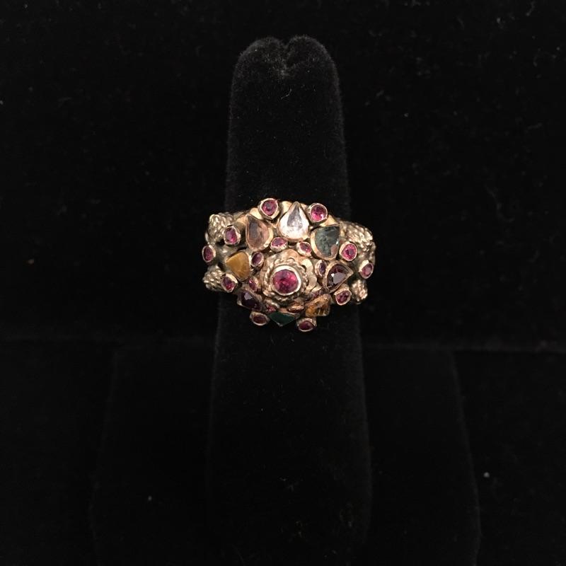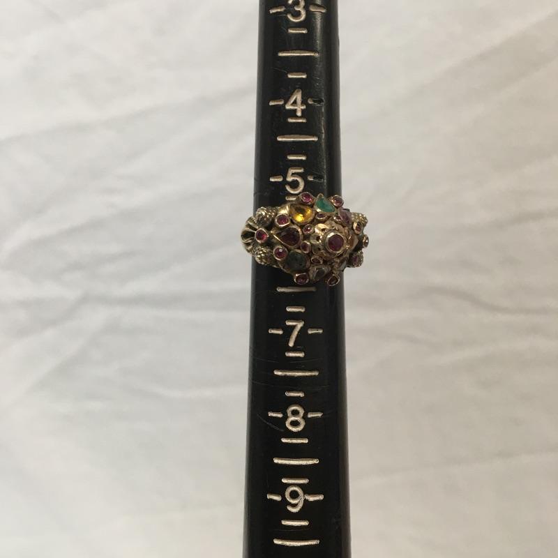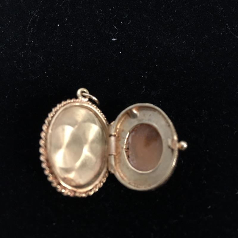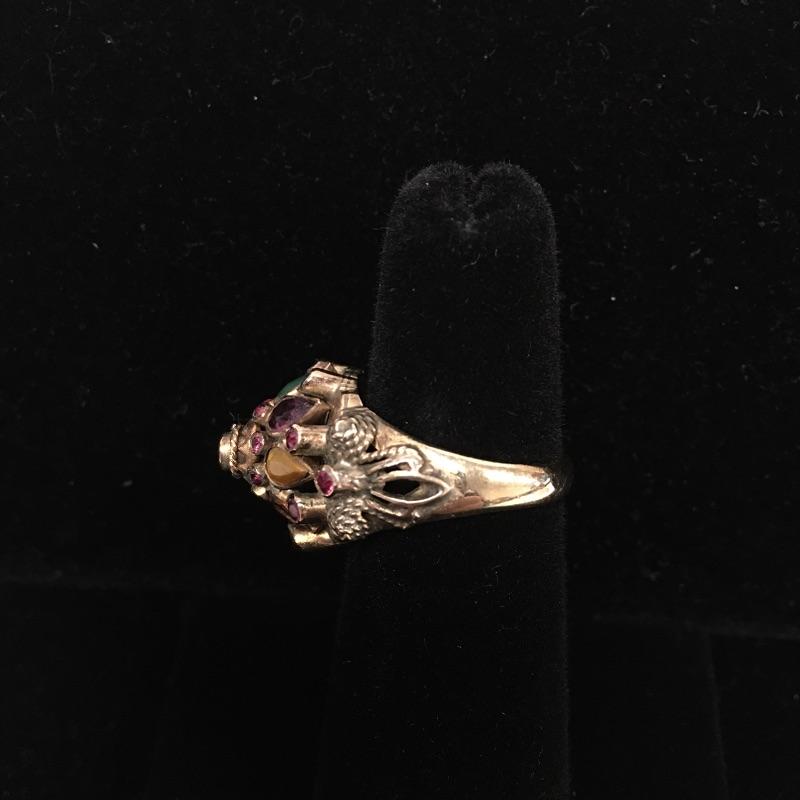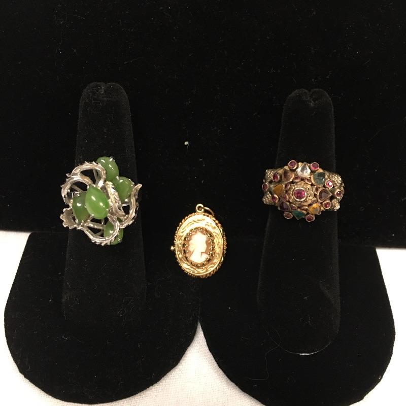Lot includes vintage ring marked 18K with ruby and other colored stones where there is a bolt and screw that appears to allow to change out the top stone (we did not move this), a cameo locket marked 14K and a ring marked 14K that appears silver in color with a green colored stone. starting price is based on the melt value.