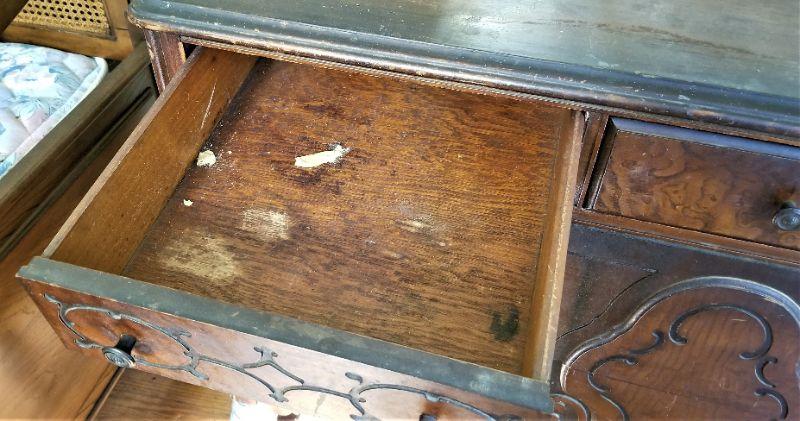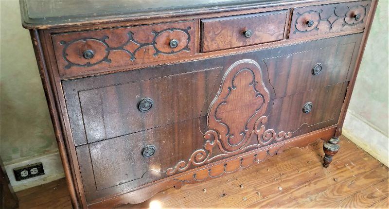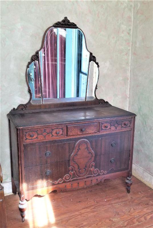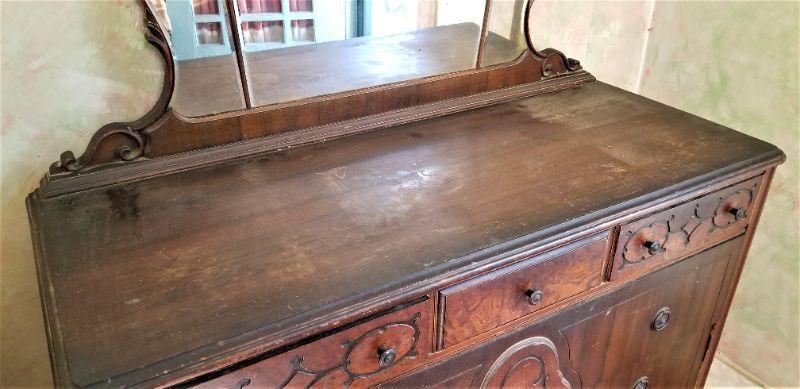 Solid wood 1920's dresser with mirror - original castors - 5 drawers - all original hardware. SOLID. Needs some TLC - good candidate for chalk paint. 48" across, 20" deep, 72" tall at tallest point. Mirror good. Has been sitting in this home for decades. Anyone want?