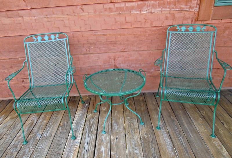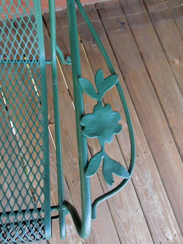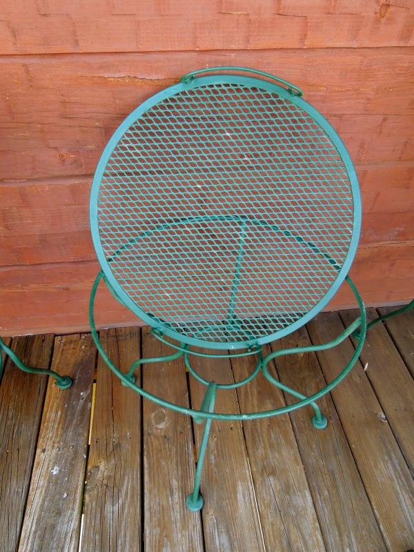 25" diameter green metal mesh side table with removable handled tray top. Two matching armchairs with ivy motif on arms. In very good condition with no scratches or dents. Padded feet.