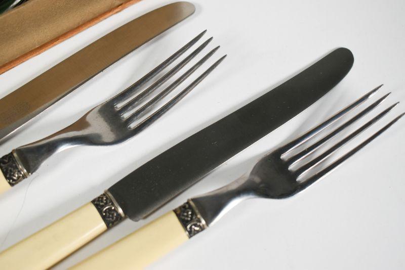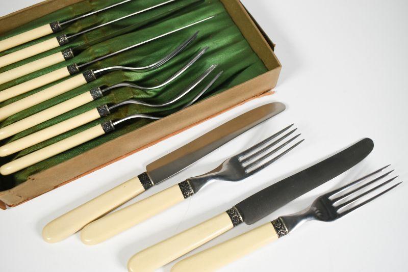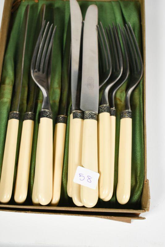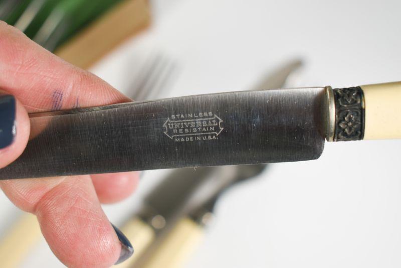 Universal Resistain flatware with celluloid handles. Service for six. Very good condition. **Please read Terms and Conditions before placing a bid. Pick up is Sunday, December 22 from 11am to 3pm or Monday, December 23 from 4pm-7pm in Mantua, NJ. All sales are final. All sales are as is, where is. Please review all photos. Props are not included. Measurements are approximate.