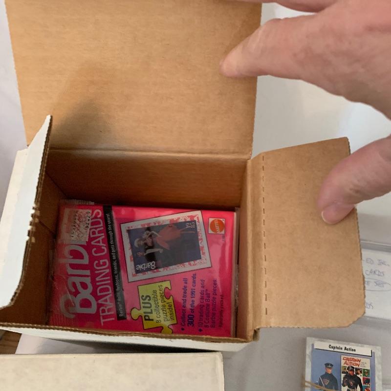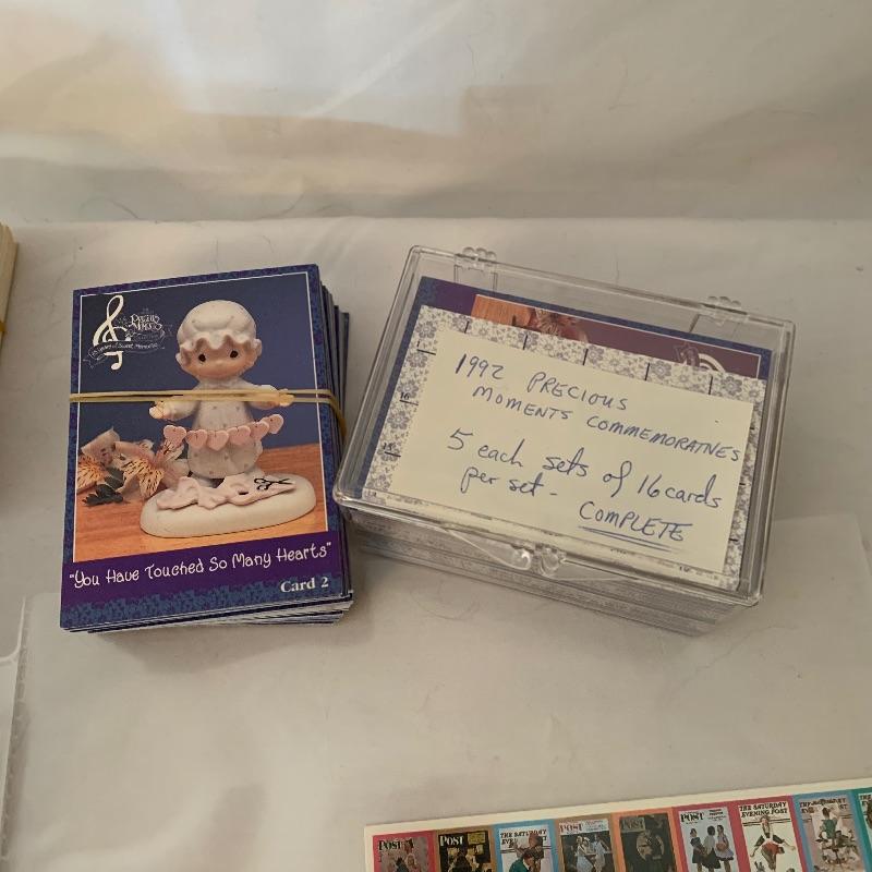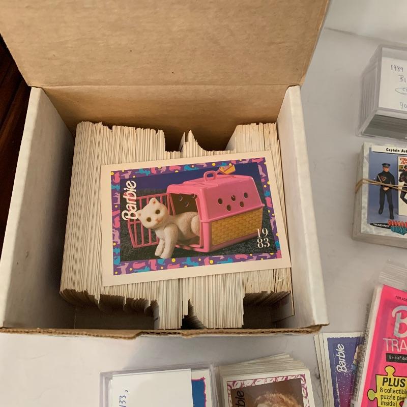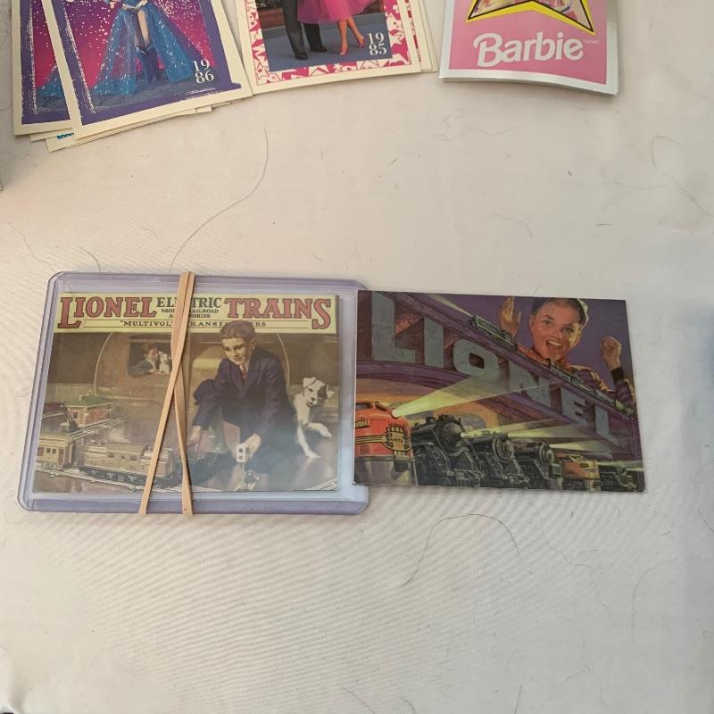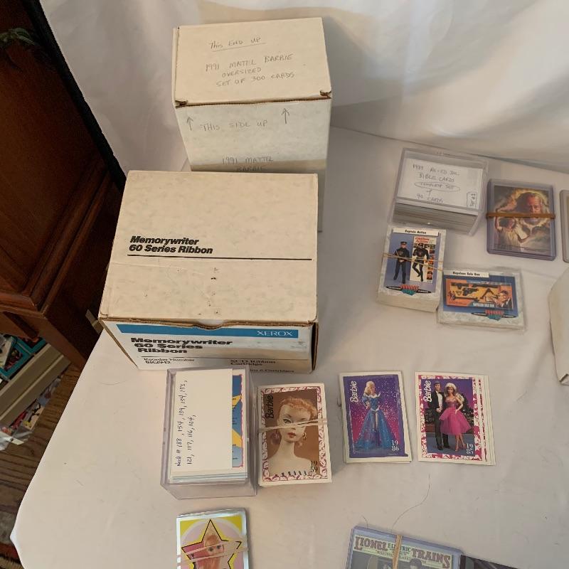 This large selection of mostly Barbie collector cards and oversized collector cards with puzzles also has fun collector cards of our favorite collectibles like Beanie Babies, Mad Magazine, Norman Rockwell, Precious Moments, Classic Toys and Craftsman. Numerous sets though unverified there are also 6 packs of Trolls cards that are unopened. Small selection of Lionel Trains and One set of Bible Cards (unverified).