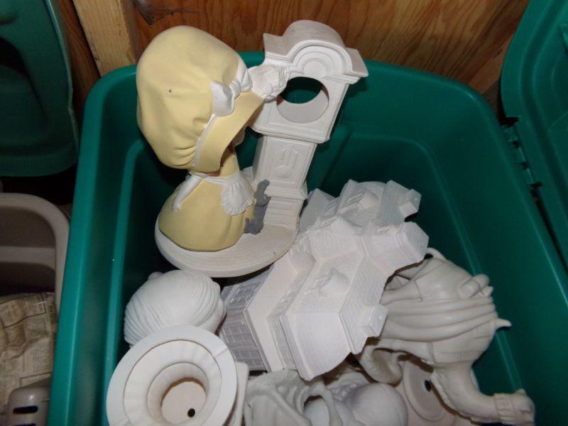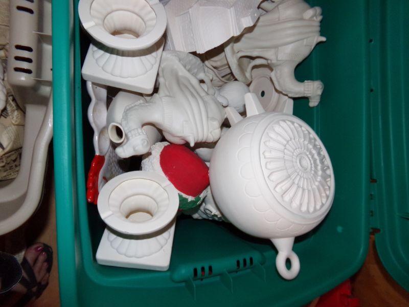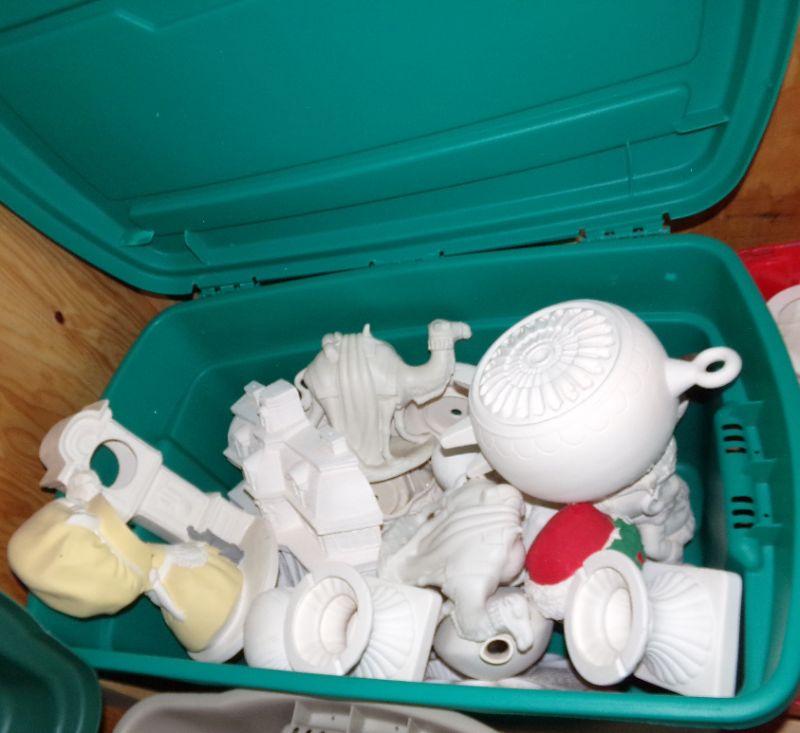 LARGE HINGED LID TUB FULL OF UNFINISHED CERAMIC PIECES