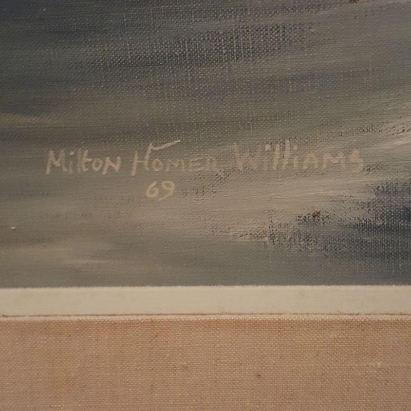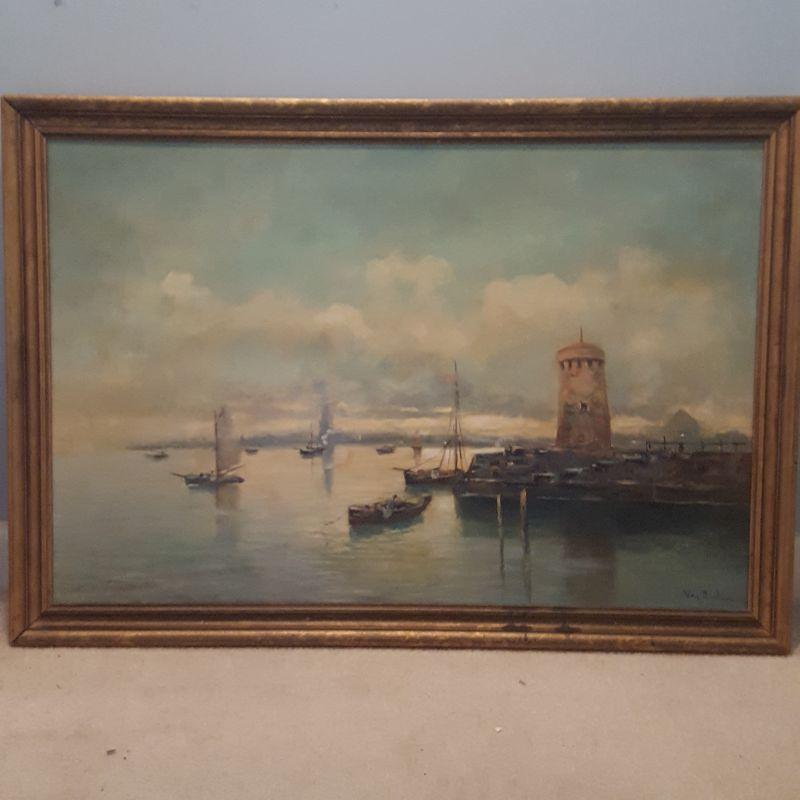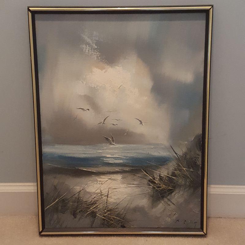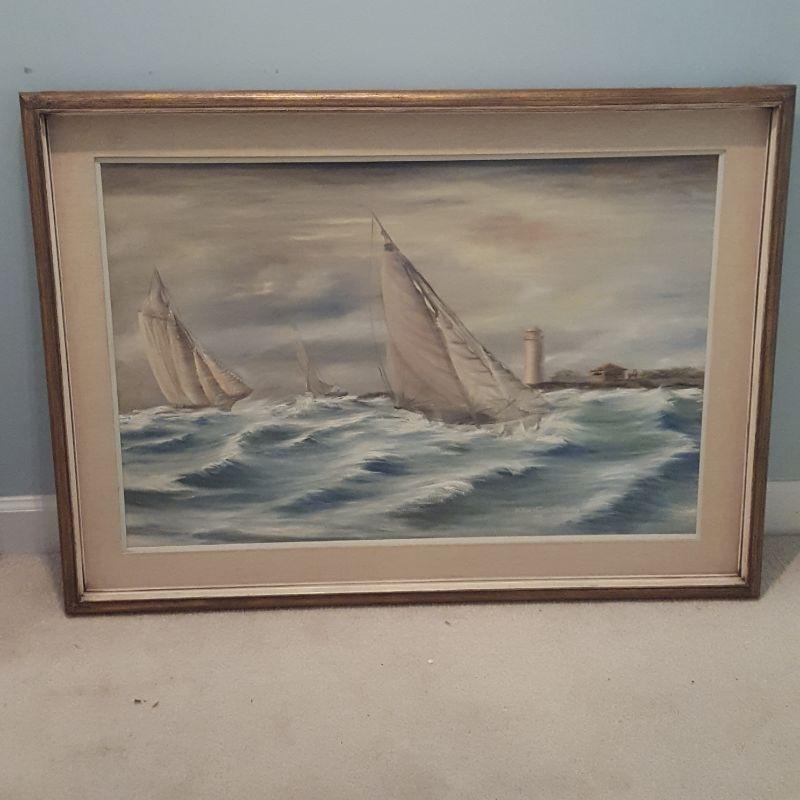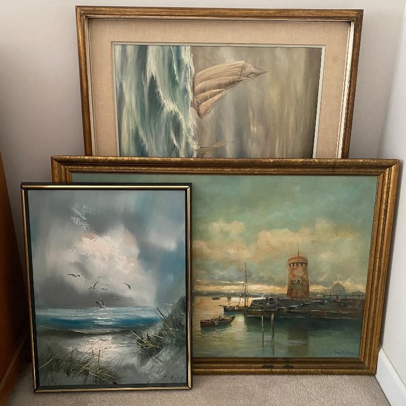 These 3 signed paintings will add charm and water relaxation to any room. The first painting from the pictures measures 40x27.5 in. The 2nd piece of the beach scene measures 19x25 in and the Milton piece measures 43.5x31 in. All frames are wooden with gold touches to each.
