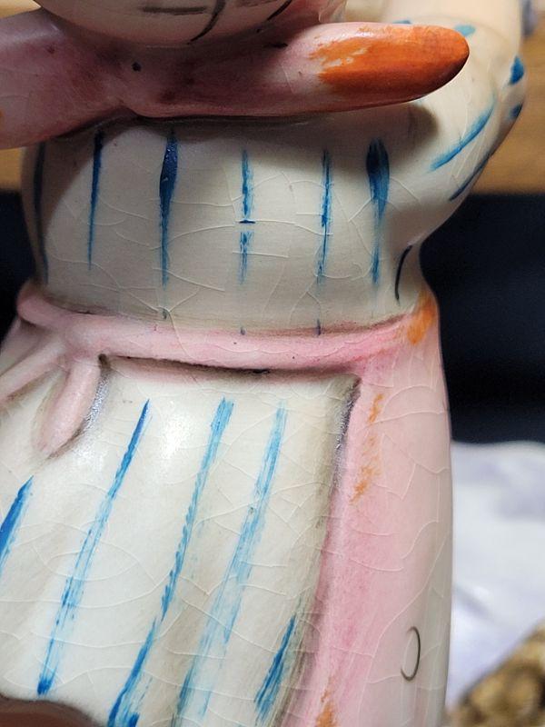 "Little Helper" (TMK 6) is in mint condition. "Wash Day" (TMK 5) has moderate crazing throughout. "Little Sweeper" (TMK 5) has mild crazing. "I Wonder" (TMK 7) is mint, but has a minor rattle.