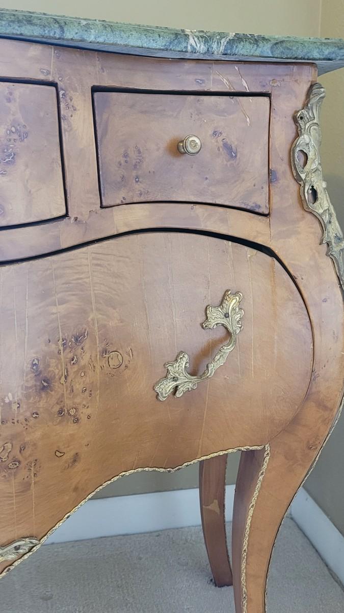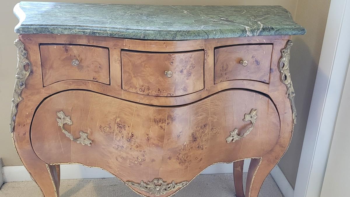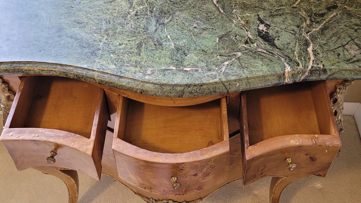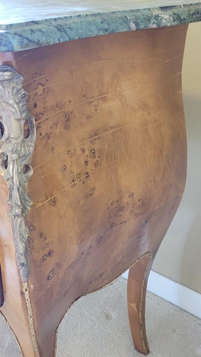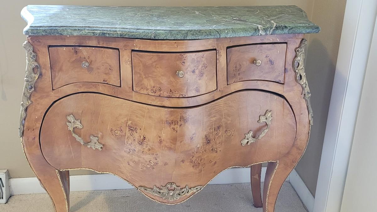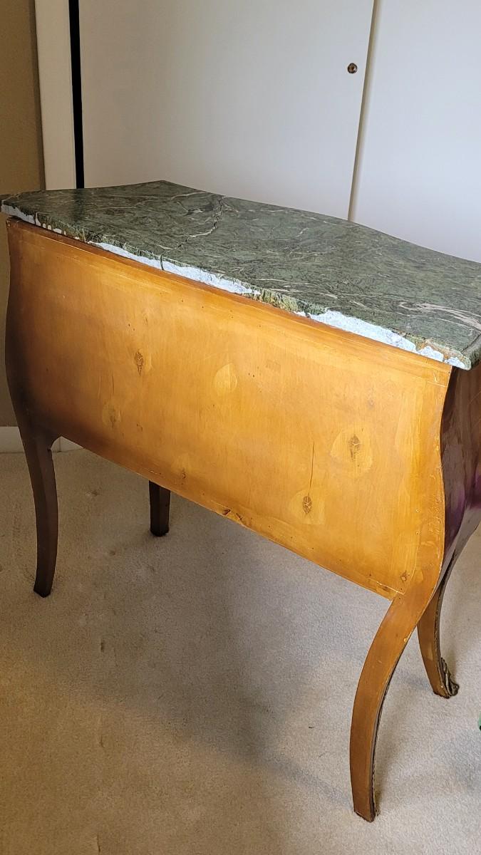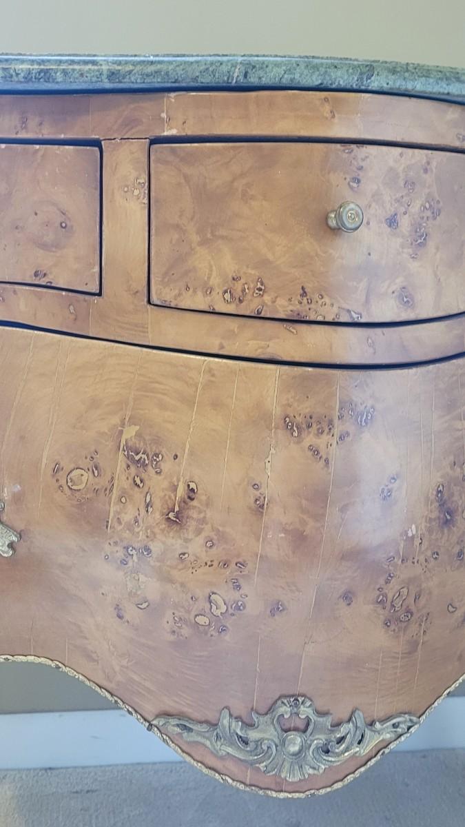Marble has cracked and is in 2 pieces but fit together nicely. The mable top comes off. All the drawers are marked. Wood chest is in over all nice condition with the exception of the marble top.