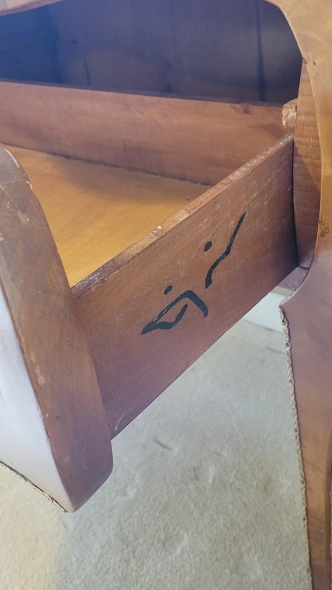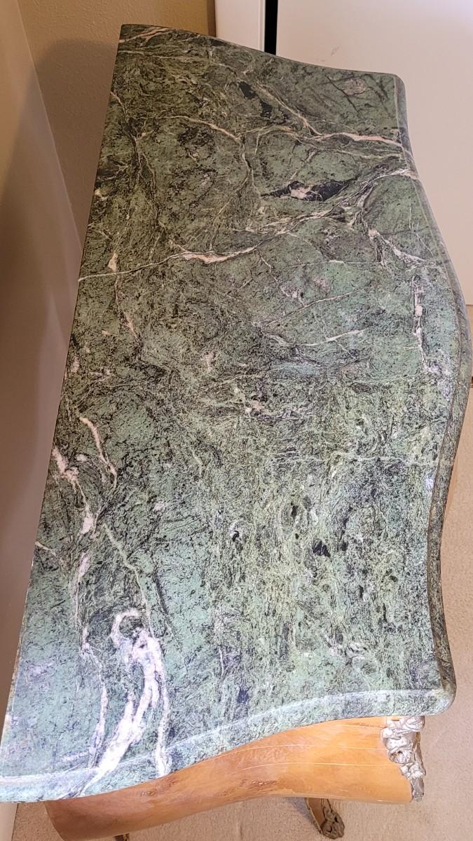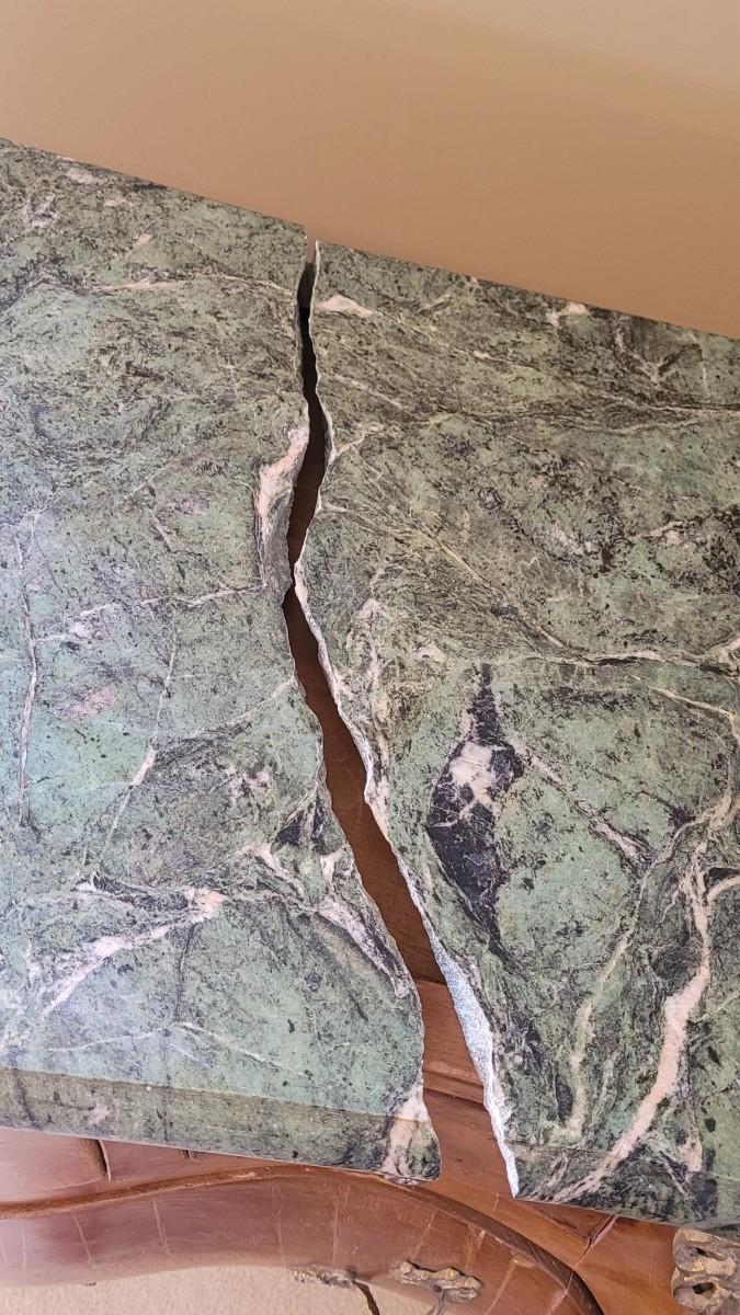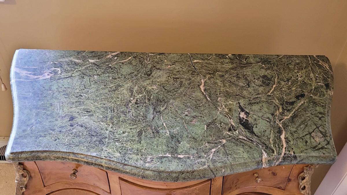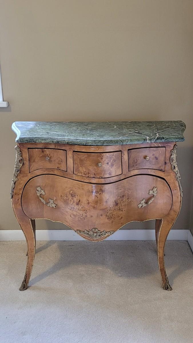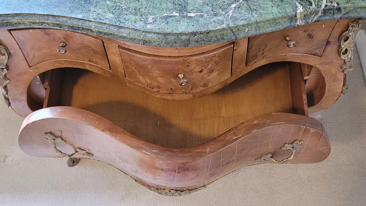 Marble has cracked and is in 2 pieces but fit together nicely. The mable top comes off. All the drawers are marked. Wood chest is in over all nice condition with the exception of the marble top.