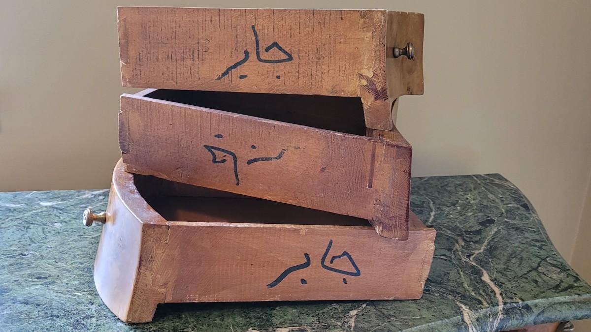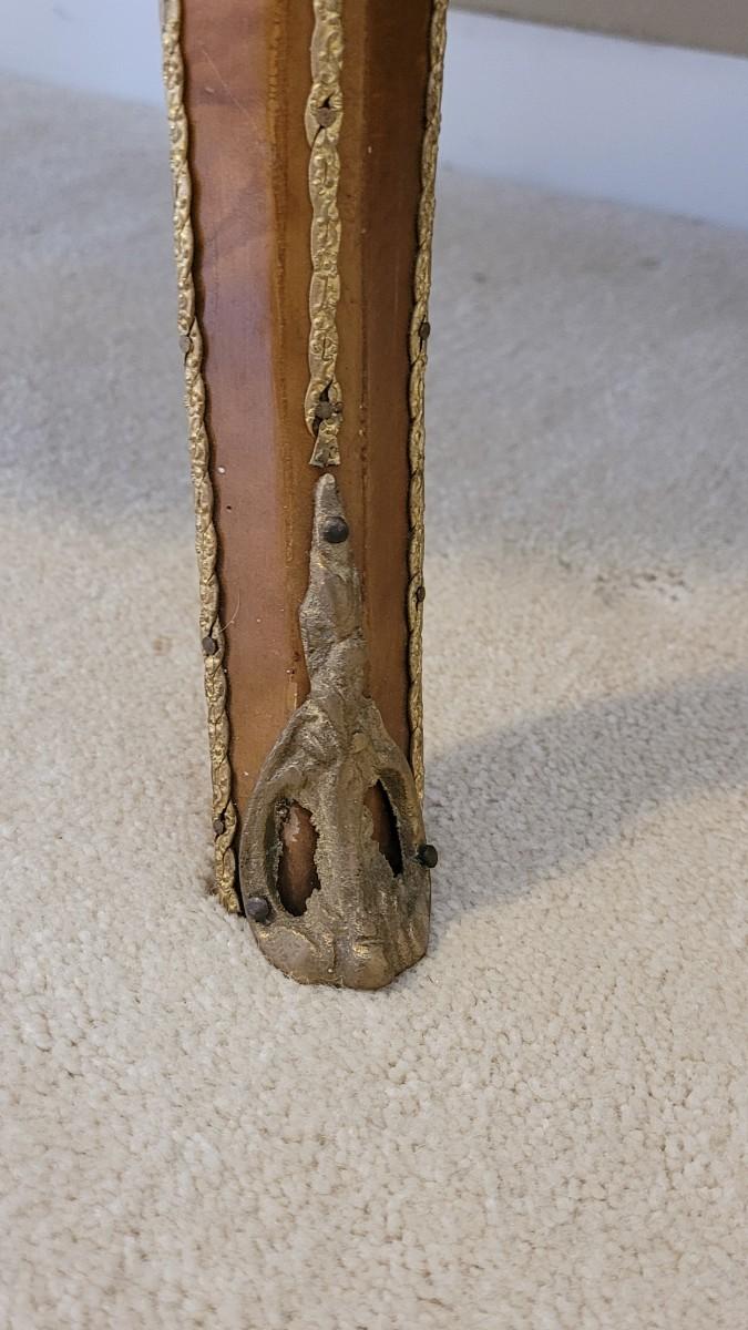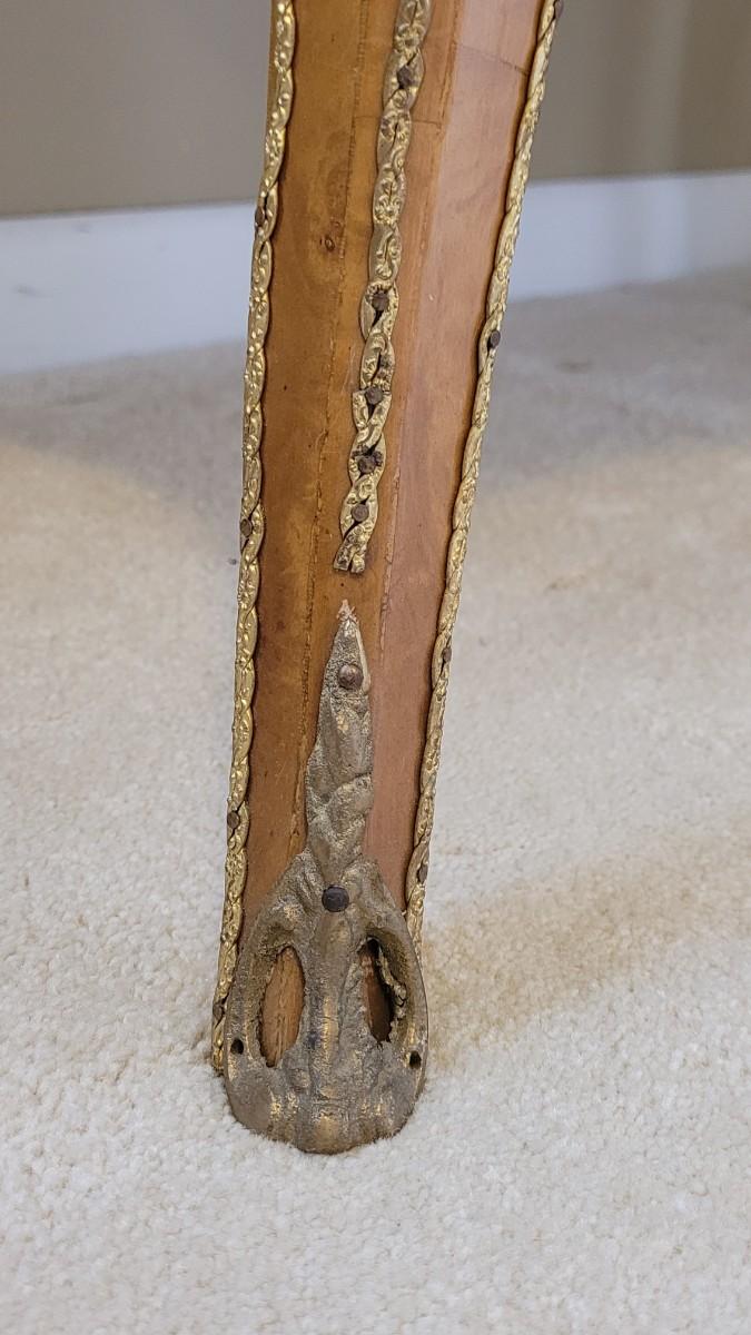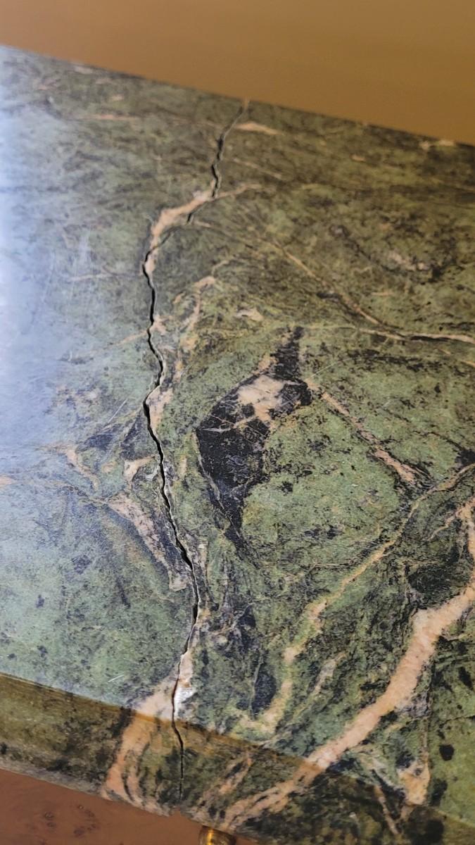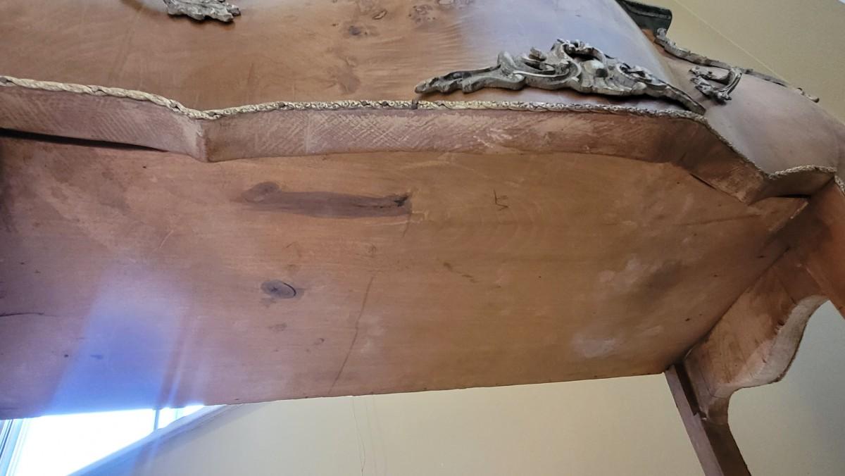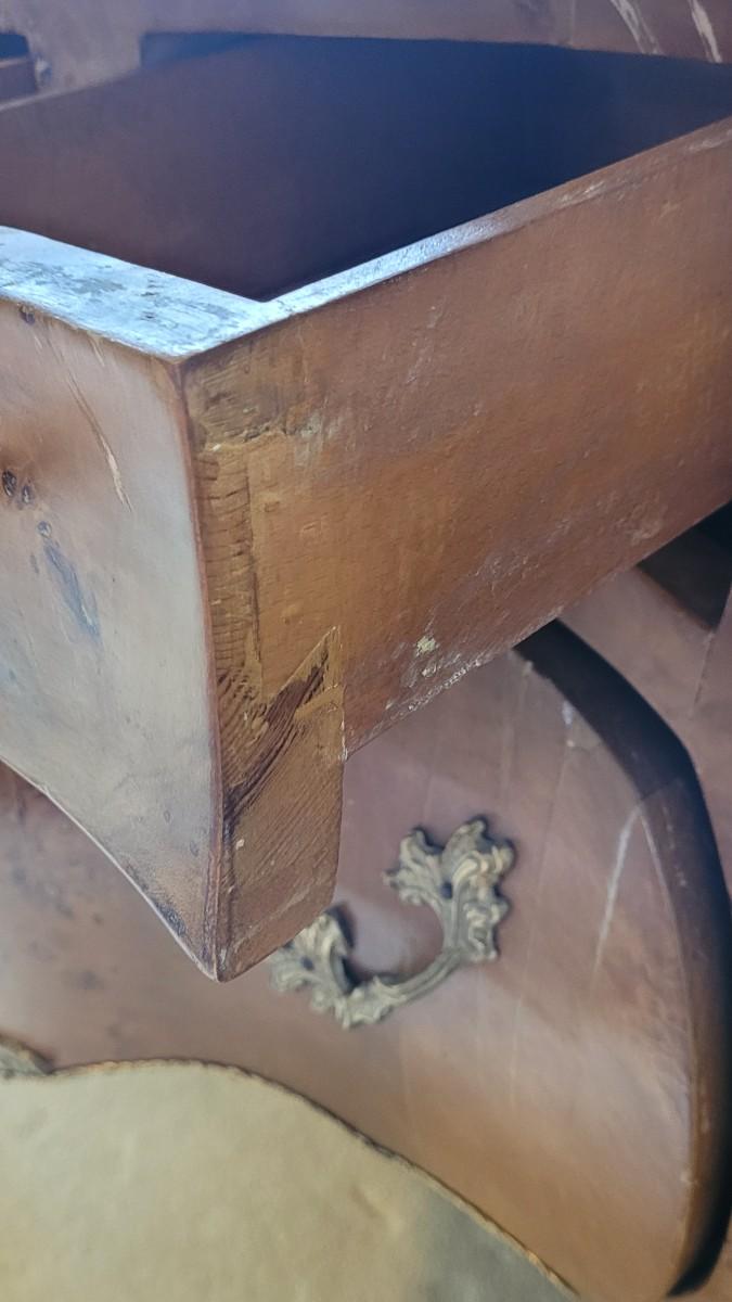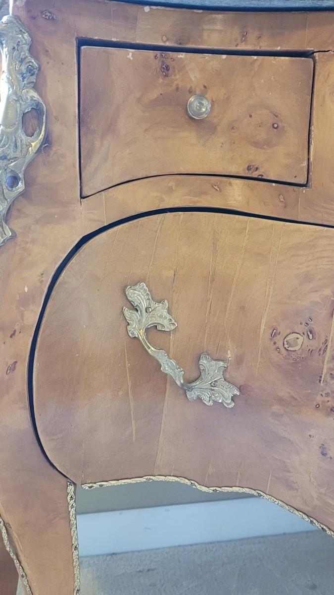 Marble has cracked and is in 2 pieces but fit together nicely. The mable top comes off. All the drawers are marked. Wood chest is in over all nice condition with the exception of the marble top.