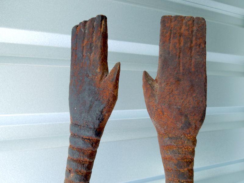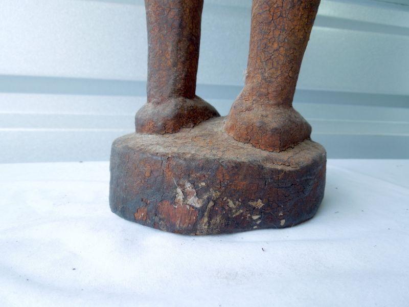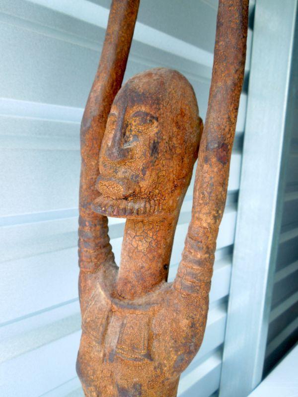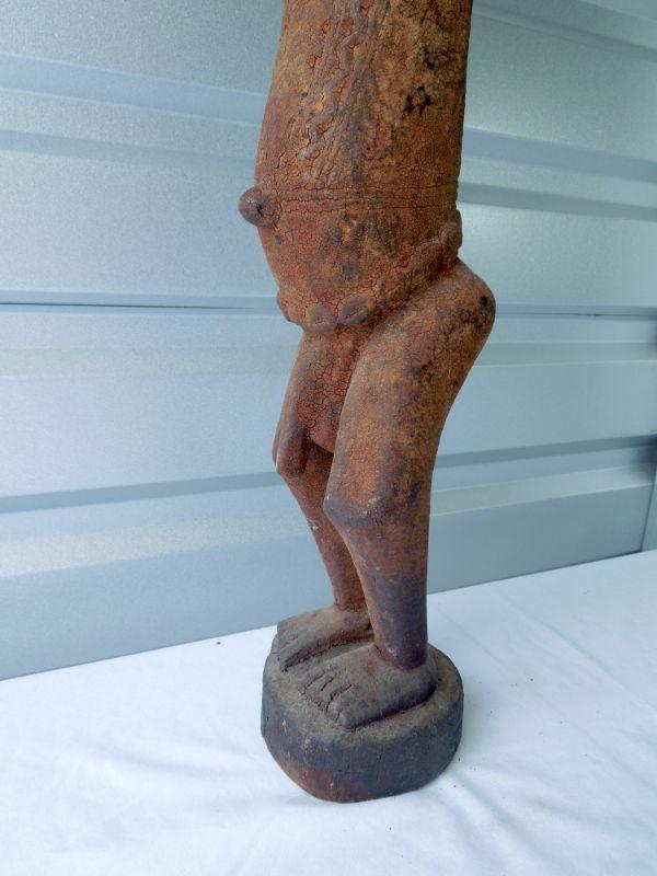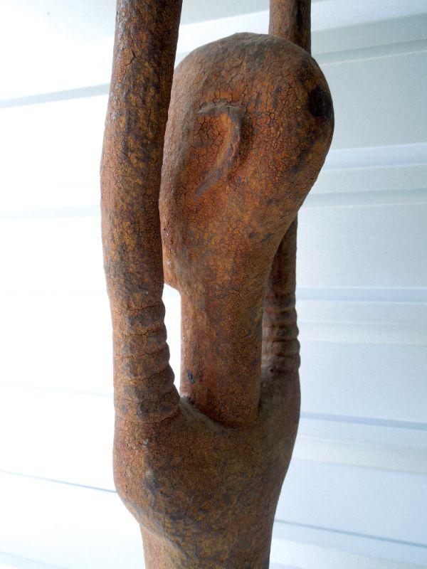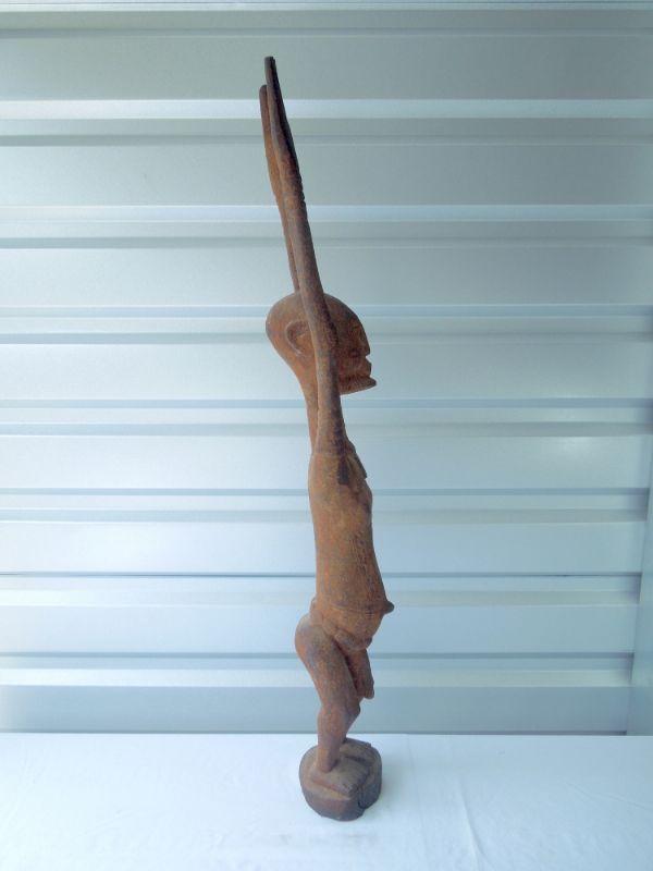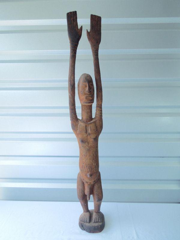 A superb Dogon or Nommo figure standing with arms raised to the heavens in a "Tellem" position.38" H x 6" W. Wood and pigment. Mali, W. Africa. The human form with raised arms is a common pose for Tellem sculptures and is said to refer to prayers for rain, crucial in this dry region.