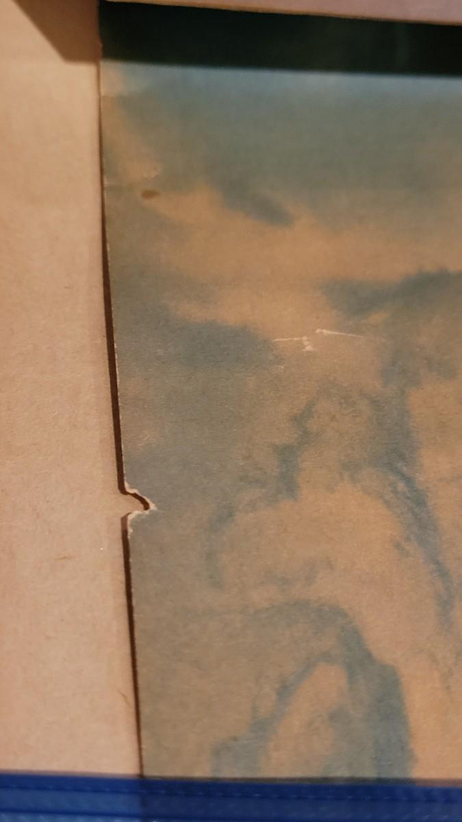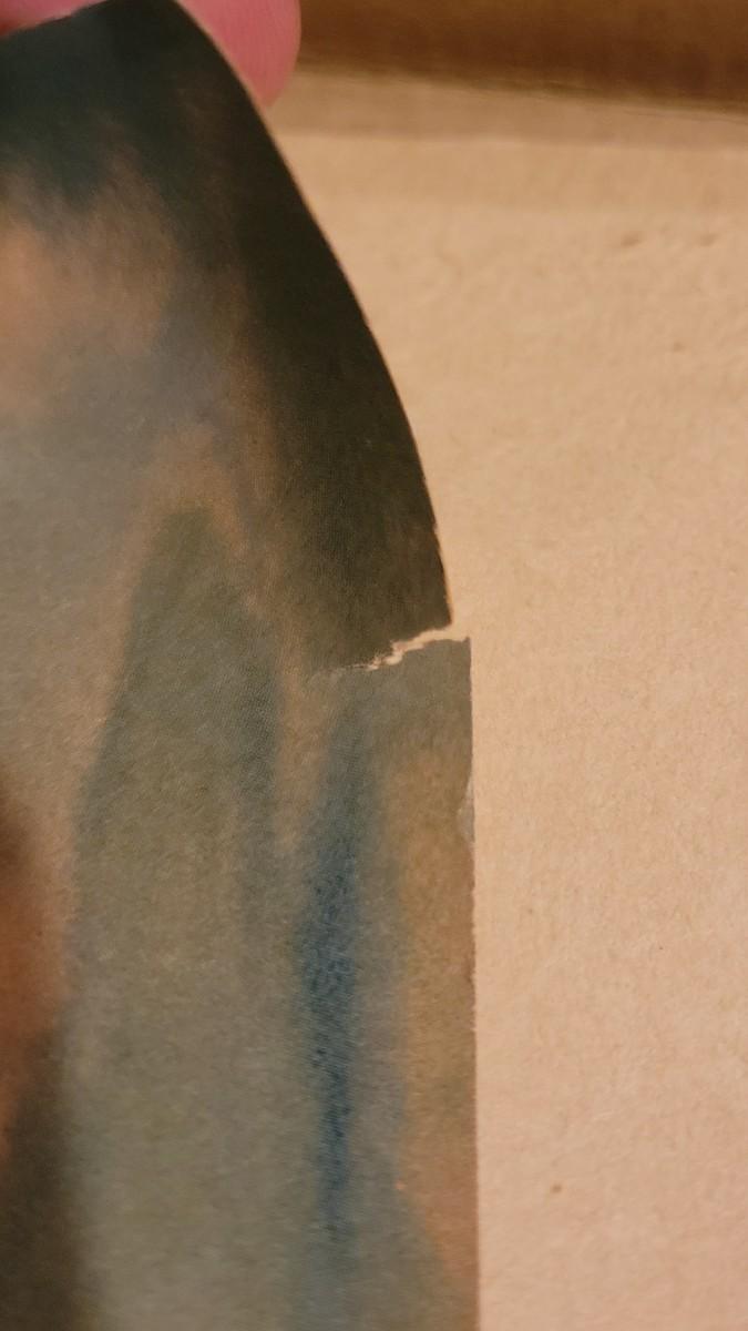 Has a missing corner and 2 white spots above the missing corner. Also has small tear and small missing piece on sides.